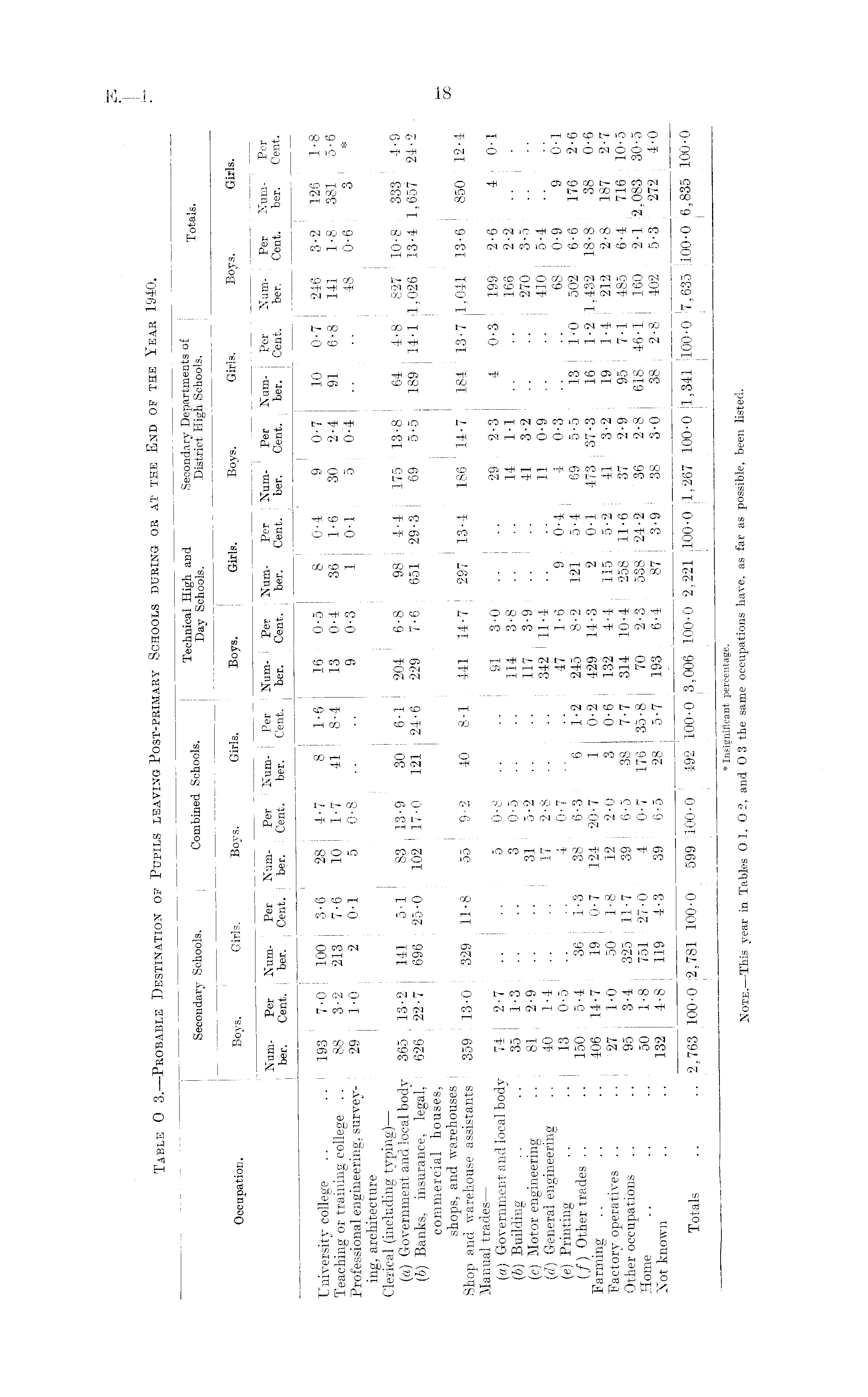 _ Technical High and Secondary Departments of Total® Secondary Schools. ; Combmed Schools. j) av Schools. District. High Schools. Occupation. Boys. Girls. Boys. Girls. Boys. Girls. Boys. Girls. Boys. Girls. i Num- Per Sum- I Per , Sum- ! Per | Eum- | Per Num- ! Per Sum- ! Per | Num- | Per | Nam- Per Nam- | Per Num- | Per ■ ber. Cent. ber. j Cent. I ber. j Cent. ber. Cent. ber. Cent. ber. Cent. ber. Cent. ber. Cent. ber, Cent. ber. Cent. * — i— i * n i n " - i i T Universitv college I 193 7-0 100 3-6 j 28 4-7 8 1-6 16 0-5 8 0-4 : 9 0-7 10 I 0-7 246 j 3-2 126 1-8 training college !. 88 3-2 213 7-6 10 H 41 8-4 13 0-4 36 1-6 30 2-4 91 6-8 141 1-8 381^5-6 Professional engineering, survey- 29 1-0 2 0-1 5 0-8 .. .. 9 03 1 01 5 j 0 4 ing, architecture C1 365 , 13-2 141 5-1 83 13-9 30 ! 6-1 204 6-8 98 4-4 175 j 13-8 64 4-8 827 10-8 333 4-9 (6) Banks, insurance, legal, 1 626 ; 22-7 696 25-0 102 1 17-0 121 24-6 229 7-6 651 29-3 69 5-5 189 14-1 1,026 ,3-4 1,657 commercial houses, j Shop and^warehoMe^ assistant s 1 359 1 13-0 329 11-8 55 ! 9-2 40 8-1 441 14-7 j 297 13-4 186 14-7 j 184 13-7 1,041 j 13-6 850 12-4 Manual trades — j i ! j „ „ j \ , ,, . ,, i / \ i 111 jj i ha o.7 I o• ft 9* 3*0 .. i .. 2*? i 2*3 4: ±99 2*o 0 ± S S™ y . It i s :: :: I S-tj :: :: m u m .. .. *»• 2 . 2 .. . (c) Motor engineering ..! 8! 2-9 .. .. j 31 5-2 .. .. 117 3-9 .. | .. 41 3-2 I .. .. 270 3-5 .. (J) General engineering 40 1-4 .. 17 2-8 .. .. 342 11-4 .. .. 11 0-9 .. .. 410 5-4 <e Printing ' 13 0-5 .. .. 4 0-7.. .. 47 1-6 9: 0-4 4 0-3 | .. .. 68 0-9 9 0-1 1) Other trades " " 150 1 5-4 36 1-3 j 38 6-3 6 1-2 245 8-2 121 5-4' 69 5-5: 13! 1-0 502 6-6 176 2-6 " 406 14-7 19 0-7 124 20-7 1 0-2 429 14-3 2 0-1 473 | 37-3 16 j 1-2 1,432 18-8 38 0-6 Factor^ operatives " 27 1-0 50 1-8 12 2-0 3 0-6 132 4-4 115 I 5-2 ; 41 I 3-2 19 1-4 212 2-8 187 2-7 Othex occupations " !! 95 3-4 325 11-7 39 6-5 ! 38 7-7 314 | 10-4 258 iI-6 37 2-9 95 i 7-1 485 6-4 716 10-5 n 5Q 1-g 751 27-0 4 0-7 176 35-8 70 2-3 538 24-2 , 36 2-8 j 618 46-1 160 2-1 2,083 30-5 Not known !" 132 4-8 119 4-3 39 6-5 j 28 5-7 193 6-4 87 3-9 38 3-0 I 38 1 2-8 402 5-3 272 j 4-0 Xotals . .. 2,763 100-0 2,781 100-0 599~ 100-0 | 492 100-0 i3,006 100-0 2,221 100-0 ; 1,267 100-0 1,341 7,635 jlOO-O 6,835 100-0 i I I ! I | j | [ ' ' * Insignificant percentage. Note. This year in Tables 01, 0 2, and O 3 the same occupations have, as far as possible, been listed.