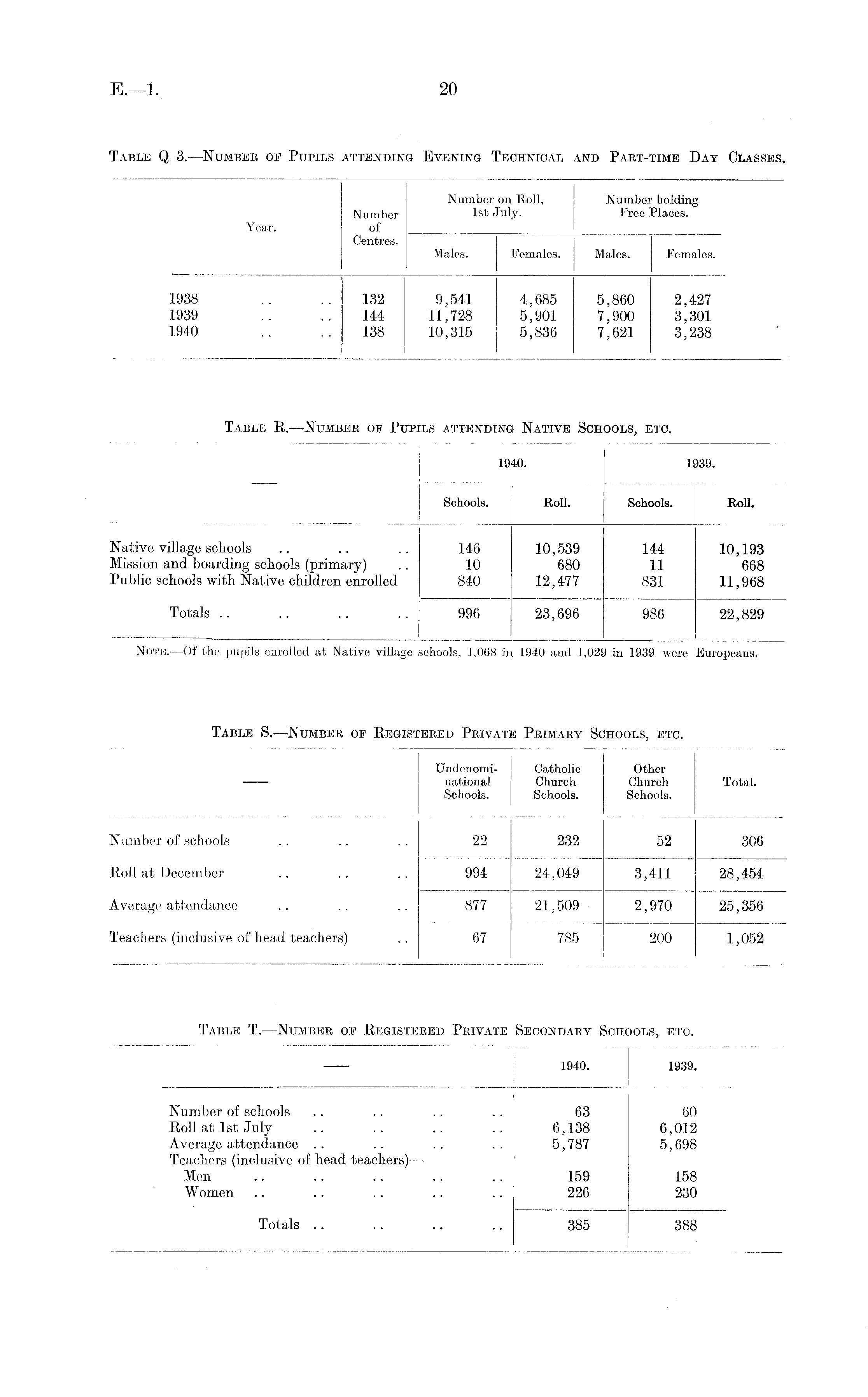 ~~ "j " | 1940. 1939. Number of schools .. .. .. . . 63 60 Roll at 1st July .. .. .. .. 6,138 6,012 Average attendance .. .. .. .. 5,787 5,698 Teachers (inclusive of head teachers) — Men .. .. .. .. .. 159 158 Women .. .. .. .. .. 226 230 Totals .. .. .. .. 385 388