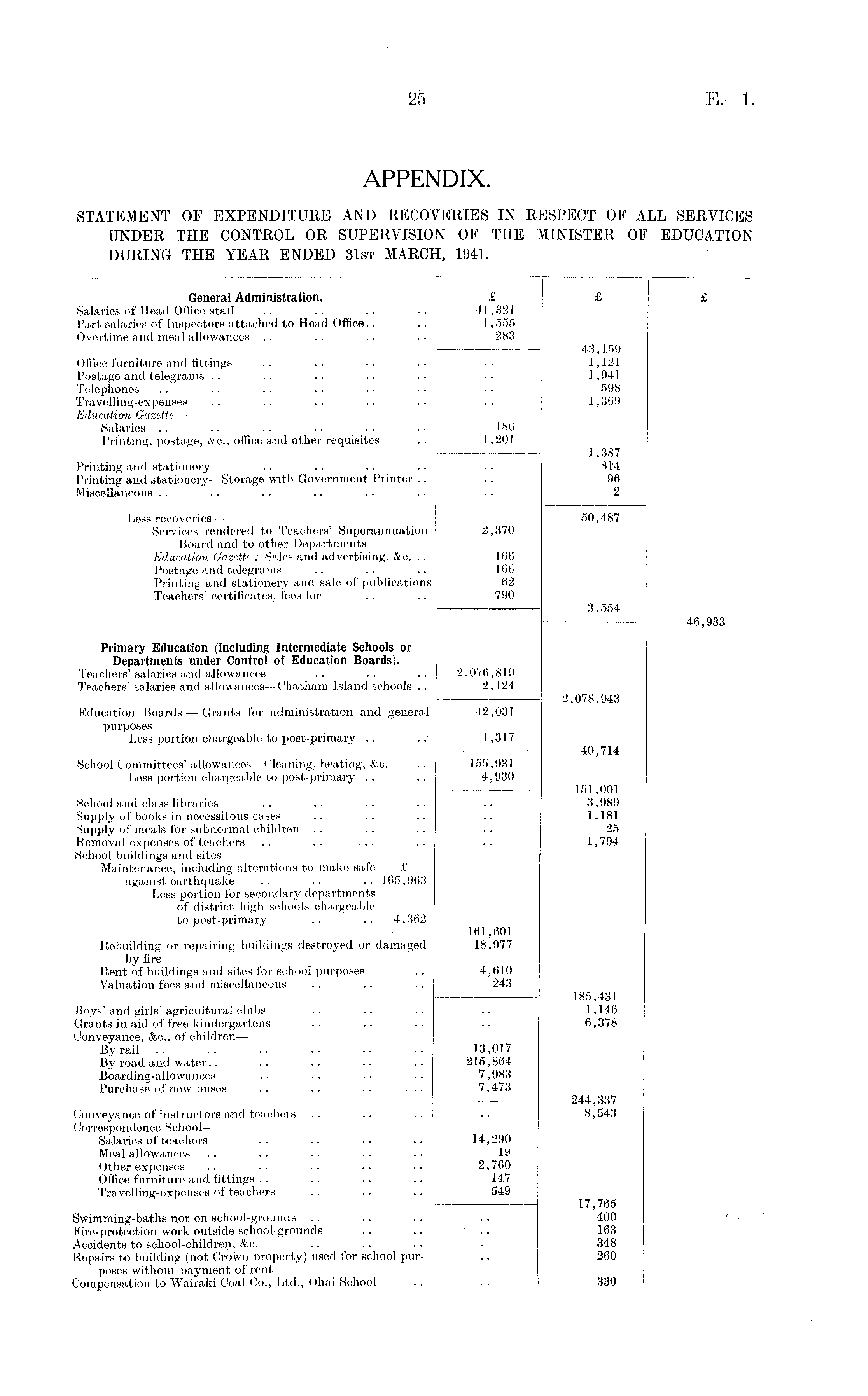APPENDIX. STATEMENT OF EXPENDITURE AND RECOVERIES IN RESPECT OF ALL SERVICES UNDER THE CONTROL OR SUPERVISION OF THE MINISTER OF EDUCATION DURING THE YEAR ENDED 31st MARCH, 1941.