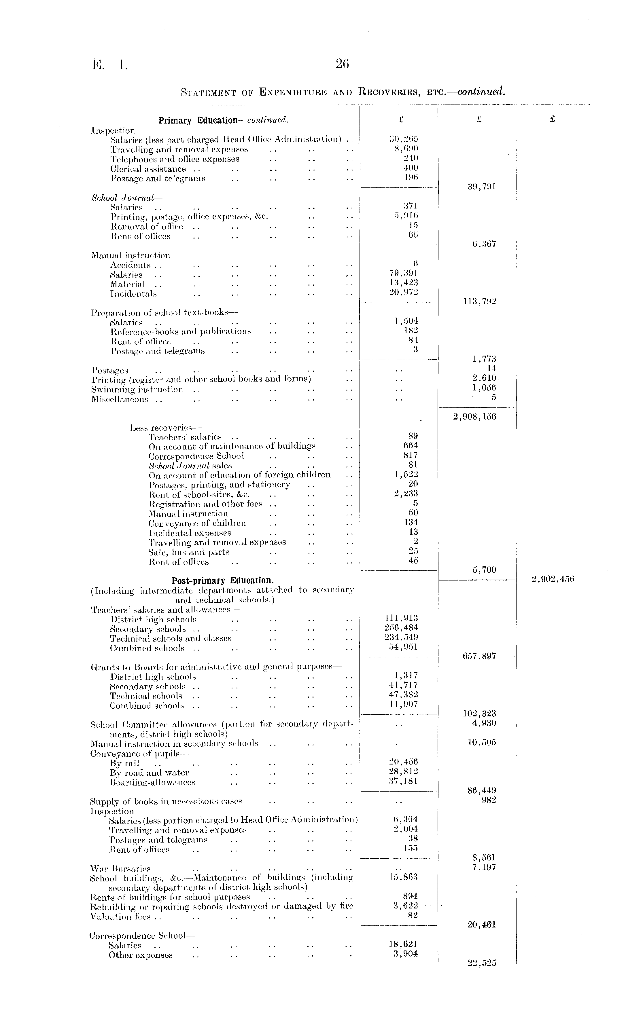 Primary Education —continued. £ £ £ Inspection— Salaries (less part charged Head Office Administration) .. . 30,U05 Travelling and removal expenses .. .. .. 8,690 Telephones and office expenses .. .. .. 240 Clerical assistance .. .. .. • • ■ • -MO Postage and telegrams .. .. . • ■ • 196 39,791 School Journal— Salaries .. •. • • • • ■ • • • 371 Printing, postage, office expenses, &c. .. .. 5,916 Removal of office .. .. • • • • • • 15 Rent of offices .. .. .. •. ■ • 65 6,367 Manual instruction — Accidents . . . ■ • • • • • • • ■ 6 Salaries .. .. •• •• »• 79,391 Material .. •• •• •• 13,423 Incidentals •• •• •• •• 20,972 113,792 Preparation of school text-books — Salaries .. . • • • • • • • • - 1,504 Reference-books and publications .. .. . . 182 Rent of offices .. .. • • • • ■ ■ 84 Postage and telegrams .. .. .. • ■ 3 Postages .. .. • • •• • • •■ • • 14 Printing (register and other school books and forms) .. .. 2,610 Swimming instruction .. •• •• •• 1,056 Miscellaneous .. .. • • ■ • • • ■ • ■ • 5 2,908,156 Less recoveries— Teachers' salaries .. .. .. . . 89 On account of maintenance of buildings . . 664 Correspondence School .. .. .. 817 School Journal sales .. • • . • 81 On account of education of foreign children . . 1,522 Postages, printing, and stationery .. . • 20 Rent of school-sites, &c. .. .. .. 2,233 Registration and other fees .. .. • . 5 Manual instruction •. .. • • 50 Conveyance of children .. . . • . 134 Incidental expenses .. .. . . 13 Travelling and removal expenses .. . . 2 Sale, bus and parts .. . • . . 25 Rent of offices . . .. . • • ■ 45 5,700 Post-primary Education. — 2,902,456 (Including intermediate departments attached to secondary and technical schools.) Teachers' salaries and allowances — District high schools .. .. 111,913 Secondary schools . . • • .. ■ • • • 256,484 Technical schools and classes .. .. ■■ 234,549 Combined schools .. .. •• •• 54,951 657,897 Grants to Boards for administrative and general purposes — District high schools .. .. •• 1,317 Secondary schools .. .. .. •• 41,717 Technical schools .. .. • . • . • • 47,382 Combined schools .. .. • ■ •. • ■ 11,907 102,323 School Committee allowances (portion for secondary depart- .. 4,930 , ments, district high schools) Manual instruction in secondary schools .. .. . ■ ■ ■ 10,505 Conveyance of pupils— By rail 20,456 By road and waljer .. .. .. 28,812 Boarding-allowances .. .. .. 37,181 86,449 Supply of books in necessitous cases .. .. • • . • 982 Inspection — Salaries (less portion charged to Head Office Administration) 6,364 Travelling and removal expenses .. .. .. 2,004 Postages and telegrams .. .. .. • • 38 Rent of offices .. .. • • • • • • 155 8,561 War Bursaries . . ■ • ■ • • ■ • • ■ ■ 7,197 School buildings, &c. —Maintenance of buildings (including 15,863 secondary departments.of district high schools) Rents of buildings for school purposes .. .. . • 894 Rebuilding or repairing schools destroyed or damaged by lire 3,622 Valuation fees . . .... .. .. ■ • 82 20,461 Correspondence School — Salaries .. .. •• •• ■■ •• 18,621 Other expenses .. .. •. ■ • ■ ■ 3,904 22,525