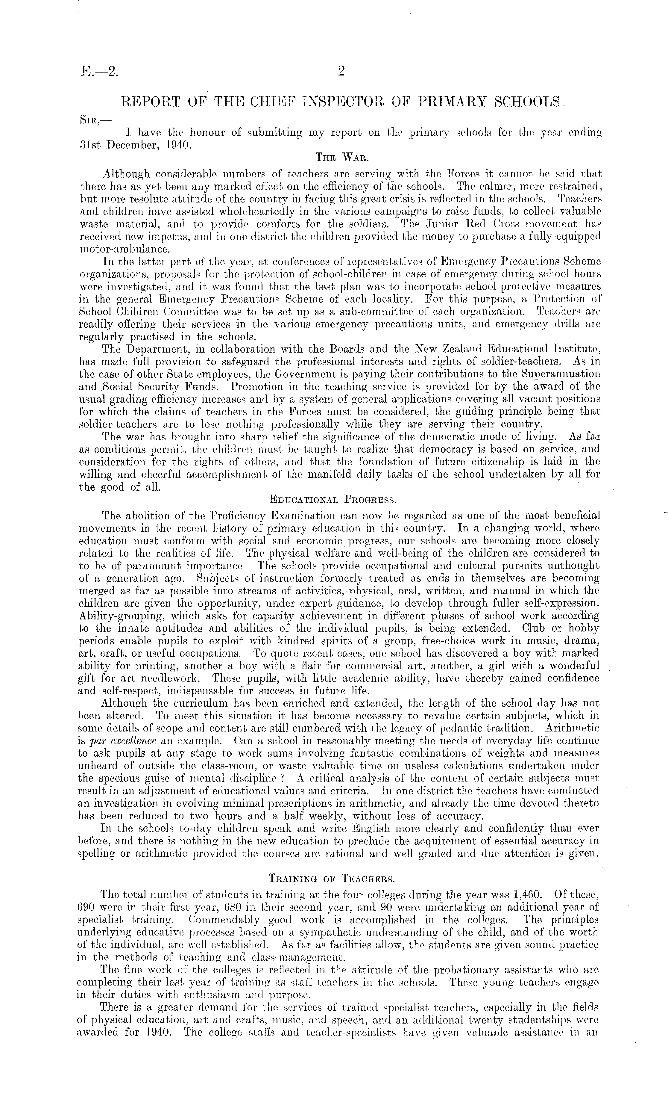 REPORT OF THE CHIEF INSPECTOR OF PRIMARY SCHOOLS. Sir, — I have the honour of submitting my report on the primary schools for the year ending 31st December, 1940. The War. Although considerable numbers of teachers are serving with the Forces it cannot be said that there has as yet been any marked effect on the efficiency of the schools. The calmer, more restrained, but more resolute attitude of the country in facing this great crisis is reflected in the schools. Teachers and children have assisted wholeheartedly in the various campaigns to raise funds, to collect valuablewaste material, and to provide comforts for the soldiers. The Junior Red Cross movement has received new impetus, and in one district the children provided the money to purchase a fully-equipped motor-ambulance. In the latter part of the year, at conferences of representatives of Emergency Precautions Scheme organizations, proposals for the protection of school-children in case of emergency during school hours were investigated, and it was found that the best plan was to incorporate school-protective measures in the general Emergency Precautions Scheme of each locality. For this purpose, a Protection of School Children Committee was to be set up as a sub-committee of each organization. Teachers are readily offering their services in the various emergency precautions units, and emergency drills are regularly practised in the schools. The Department, in collaboration with the Boards and the New Zealand Educational Institute, has made full provision to safeguard the professional interests and rights of soldier-teachers. As in the case of other State employees, the Government is paying their contributions to the Superannuation and Social Security Funds. Promotion in the teaching service is provided for by the award of the usual grading efficiency increases and by a system of general applications covering all vacant positions for which the claims of teachers in the Forces must be considered, the guiding principle being that soldier-teachers are to lose nothing professionally while they are serving their country. The war has brought into sharp relief the significance of the democratic mode of living. As far as conditions permit, the children must be taught to realize that democracy is based on service, and consideration for the rights of others, and that the foundation of future citizenship is laid in the willing and cheerful accomplishment of the manifold daily tasks of the school undertaken by all for the good of all. Educational Progress. The abolition of the Proficiency Examination can now be regarded as one of the most beneficial movements in the recent history of primary education in this country. In a changing world, where education must conform with social and economic progress, our schools are becoming more closely related to the realities of life. The physical welfare and well-being of the children are considered to to be of paramount importance The schools provide occupational and cultural pursuits unthought of a generation ago. Subjects of instruction formerly treated as ends in themselves are becoming merged as far as possible into streams of activities, physical, oral, written, and manual in which the children are given the opportunity, under expert guidance, to develop through fuller self-expression. Ability-grouping, which asks for capacity achievement in different phases of school work according to the innate aptitudes and abilities of the individual pupils, is being extended. Club or hobby periods enable pupils to exploit with kindred spirits of a group, free-choice work in music, drama, art, craft, or useful occupations. To quote recent cases, one school has discovered a boy with marked ability for printing, another a boy with a flair for commercial art, another, a girl with a wonderful gift for art needlework. These pupils, with little academic ability, have thereby gained confidence and self-respect, indispensable for success in future life. Although the curriculum has been enriched and extended, the length of the school day has not been altered. To meet this situation it has become necessary to revalue certain subjects, which in some details of scope and content are still cumbered with the legacy of pedantic tradition. Arithmetic is par excellence an example. Can a school in reasonably meeting the needs of everyday life continue to ask pupils at any stage to work sums involving fantastic combinations of weights and measures unheard of outside the class-room, or waste valuable time on useless calculations undertaken under the specious guise of mental discipline ? A critical analysis of the content of certain subjects must result in an adjustment of educational values and criteria. In one district the teachers have conducted an investigation in evolving minimal prescriptions in arithmetic, and already the time devoted thereto has been reduced to two hours and a half weekly, without loss of accuracy. In the schools to-day children speak and write English more clearly and confidently than ever before, and there is nothing in the new education to preclude the acquirement of essential accuracy in spelling or arithmetic provided the courses are rational and well graded and due attention is given. Training of Teachers. The total number of students in training at the four colleges during the year was 1,460. Of these, 690 were in their first year, 680 in their second year, and 90 were undertaking an additional year of specialist training. Commendably good work is accomplished in the colleges. The principles underlying educative processes based on a sympathetic understanding of the child, and of the worth of the individual, are well established. As far as facilities allow, the students are given sound practice in the methods of teaching and class-management. The fine work of the colleges is reflected in the attitude of the probationary assistants who are completing their last year of training as staff teachers in 