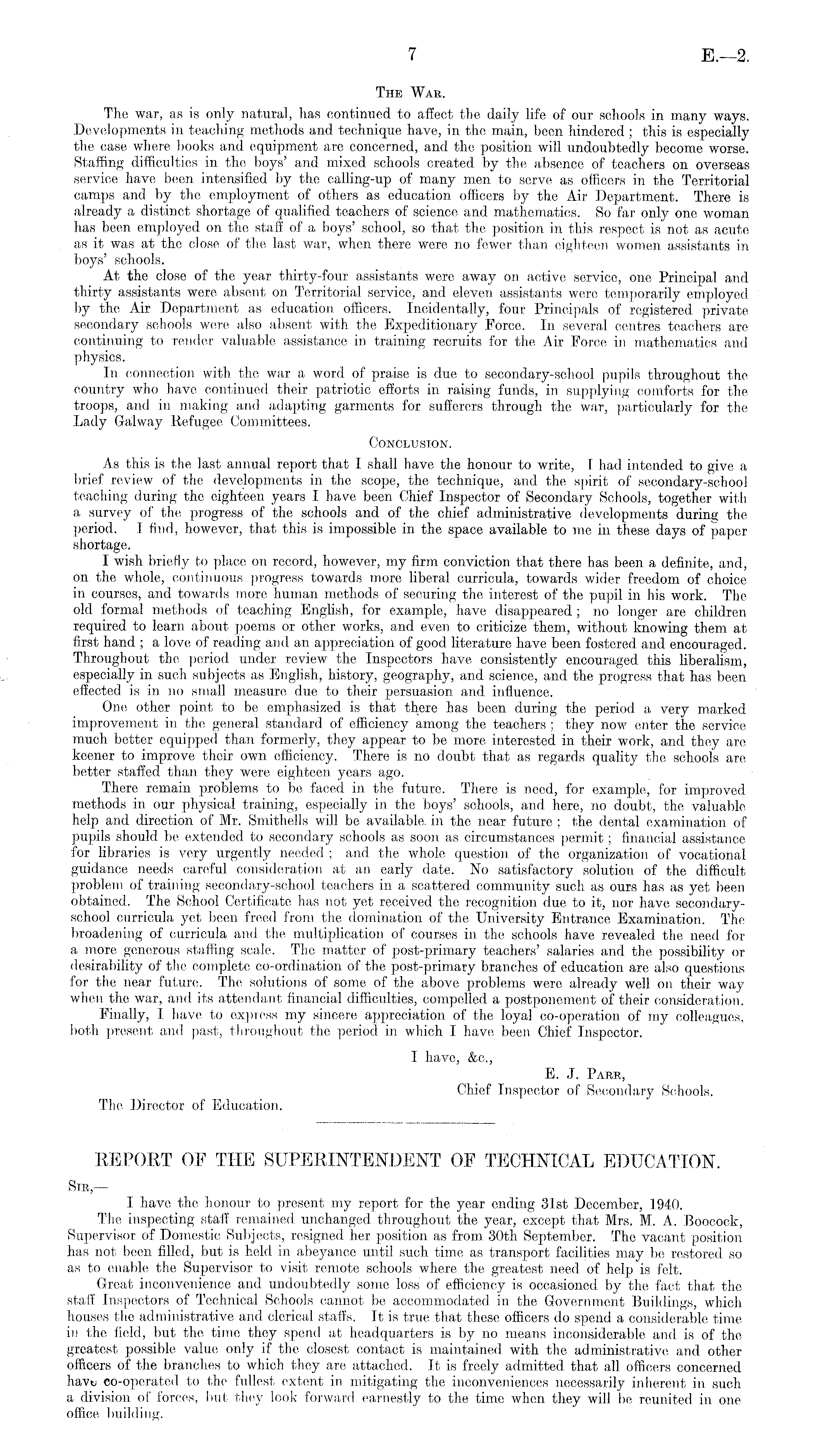 The War. The war, as is only natural, has continued to affect the daily life of our schools in many ways. Developments in teaching methods and technique have, in the main, been hindered ; this is especially the case where books and equipment are concerned, and the position will undoubtedly become worse. Staffing difficulties in the boys' and mixed schools created by the absence of teachers on overseas service have been intensified by the calling-up of many men to serve as officers in the Territorial camps and by the employment of others as education officers by the Air Department. There is already a distinct shortage of qualified teachers of science and mathematics. So far only one woman has been employed on the staff of a boys' school, so that the position in this respect is not as acute as it was at the close of the last war, when there were no fewer than eighteen women assistants in boys' schools. At the close of the year thirty-four assistants were away on active service, one Principal and thirty assistants were absent on Territorial service, and eleven assistants were temporarily employed by the Air Department as education officers. Incidentally, four Principals of registered private secondary schools were also absent with the Expeditionary Force. In several centres teachers are continuing to render valuable assistance in training recruits for the Air Force in mathematics and physics. In connection with the war a word of praise is due to secondary-school pupils throughout the country who have continued their patriotic efforts in raising funds, in supplying comforts for the troops, and in making and adapting garments for sufferers through the war, particularly for the Lady Galway Refugee Committees. Conclusion. As this is the last annual report that I shall have the honour to write, I had intended to give a brief review of the developments in the scope, the technique, and the spirit of secondary-school teaching during the eighteen years I have been Chief Inspector of Secondary Schools, together with a survey of the progress of the schools and of the chief administrative developments during the period. I find, however, that this is impossible in the space available to me in these days of paper shortage. I wish briefly to place on record, however, my firm conviction that there has been a definite, and, on the whole, continuous progress towards more liberal curricula, towards wider freedom of choice in courses, and towards more human methods of securing the interest of the pupil in his work. The old formal methods of teaching English, for example, have disappeared ; no longer are children required to learn about poems or other works, and even to criticize them, without knowing them, at first hand ; a love of reading and an appreciation, of good literature have been fostered and encouraged. Throughout the period under review the Inspectors have consistently encouraged this liberalism, especially in. such subjects as English, history, geography, and science, and the progress that has been effected is in no small measure due to their persuasion and influence. One other point to be emphasized is that there has been during the period a very marked improvement in the general standard of efficiency among the teachers ; they now enter the service much better equipped than formerly, they appear to be more interested in their work, and they are keener to improve their own efficiency. There is no doubt that as regards quality the schools are better staffed than they were eighteen years ago. There remain problems to be faced in the future. There is need, for example, for improved methods in our physical training, especially in. the boys' schools, and. here, no doubt, the valuable help and direction of Mr. Smithells will be available, in the near future ; the dental examination of pupils should be extended to secondary schools as soon as circumstances permit; financial assistance for libraries is very urgently needed ; and the whole question of the organization of vocational guidance needs careful consideration at an early date. No satisfactory solution of the difficult problem of training secondary-school teachers in a scattered community such, as ours has as yet been obtained. The School Certificate has not yet received the recognition due to it, nor have secondaryschool curricula yet been freed from the domination of the University Entrance Examination. The broadening of curricula and the multiplication of courses in the schools have revealed the need for a more generous staffing scale. The matter of post-primary teachers' salaries and the possibility or desirability of the complete co-ordination of the post-primary branches of education are also questions for the near future. The solutions of some of the above problems were already well on their way when the war, and its attendant financial difficulties, compelled a postponement of their consideration. Finally, I have to express my sincere appreciation of the loyal co-operation of my colleagues, both present and past, throughout the period in which I have been Chief Inspector. I have, &c., E. J. Pare, Chief Inspector of Secondary Schools. The Director of Education.