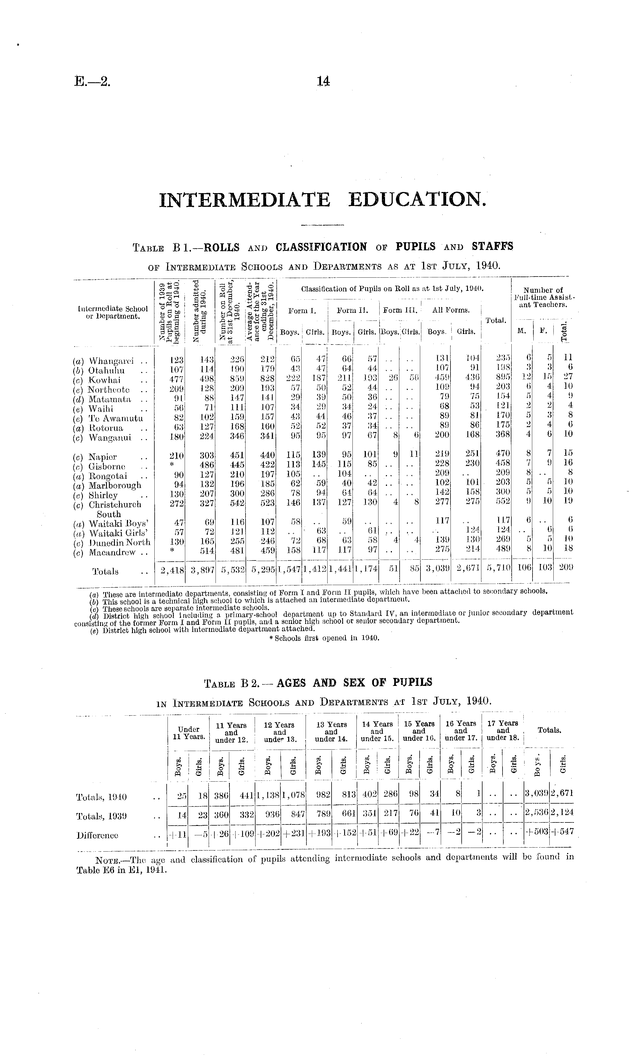 Table B1.—ROLLS and CLASSIFICATION of PUPILS and STAFFS of Intermediate Schools and Departments as at 1st July, 1940.