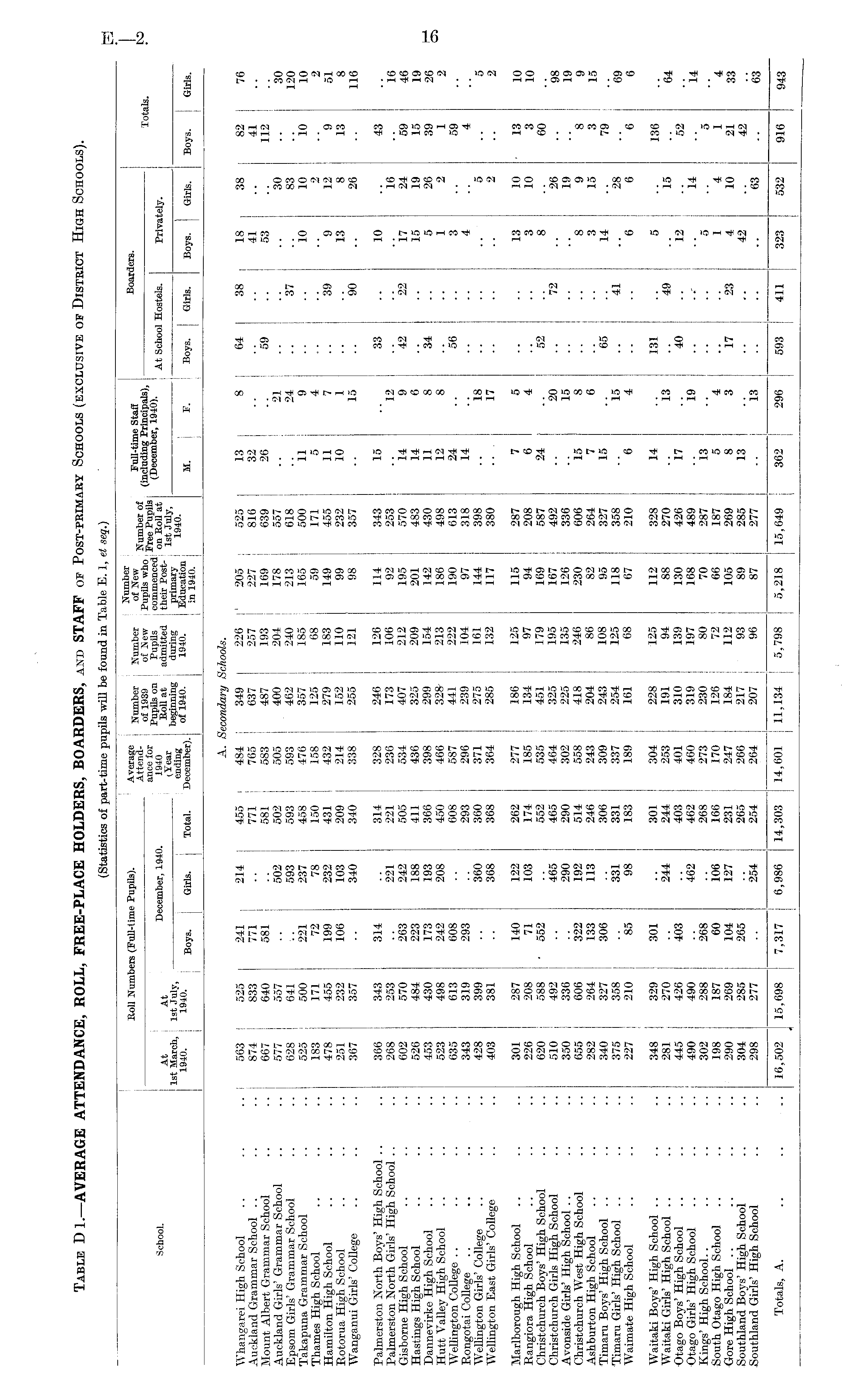(Statistics of part-time pupils will be found in Table E. 1, et seq.) Boll Numbers (Poll-time Pupils). Average Numbcr Number ofNew . Pull-time Staff Boarders. ; of 1939 of Hew Pupils who (including Principals), Totals. L i . . ' Pupils on Pupils commenced (December, 1940). ai s»i,™i -d • * t School. At At December, 1940. 1940 jtc,u a t admitted their Post- At Sch ° o1 Hostels. Puvately. 1st March, 1st July, ; 1 ; ; beginning during primary laYr, j ; j 1940. 1940. Boys _ Girls. Total. December). of 19i0 ' 1940 ' 11 M. P. Boys, j Girls. Boys. Girls. Boys. Girls. A. Secondary Schools. Whangarei High School .. .. .. 563 525 241 214 455 484 349 226 1 205 525 13 8 64 38 18 38 82 76 Auckland Grammar School .. .. .. 874 833 771 .. 771 765 637 257 227 816 32 j .. .. .. 41 .. 41 Mount Albert Grammar School .. .. 667 640 581 .. 581 583 487 193 169 639 26 .. 59 .. 53 .. 112 Auckland Girls' Grammar School .. .. 577 557 .. 502 502 505 400 204 178 557 .. 21 .. .. .. 30 .. 30 Epsom Girls' Grammar School .. .. 628 641 j .. 593 593 593 462 240 213 618 .. 24 .. 37 .. 83 .. 120 Takapuna Grammar School .. .. 525 500 221 237 458 476 357 185 165 500 11 9 .. .. 10 10 10 10 Thames High School .. .. .. 183 171 72 78 150 158 125 68 59 171 5 4.. .. .. 2 2 Hamilton High School .. .. .. 478 455 199 232 431 432 279 183 149 455 111 7 39 9 12 9 51 Rotorua High School .. .. .. 251 232 106 103 209 214 152 110 99 232 10 1 .. 13 8 13 8 Wanganui Girls' College .. .. .. 367 357 .. 340 340 338 255 121 98 357 .. 15 .. 90 .. 26 .. 116 Palmerston North Boys' High School .. .. 366 343 314 .. 314 328 246 126 114 343 15 .. 33 .. 10 .. 43 Palmerston North Girls' High School .. .. 268 253 .. 221 221 236 173 106 92 253 .. 12 .. .. .. 16 .. 16 Gisborne High School .. .. .. 602 570 263 242 505 534 407 212 195 570 14 9 42 22 17 24 59 46 Hastings High School .. .. .. 526 484 223 188 411 436 325 209 201 483 14 6 .. 15 19 15 19 Dannevirke High School .. .. .. 453 430 173 193 366 398 299 154 142 430 11 8 34 5 26 39 26 Hutt Valley High School .. .. .. 523 498 242 208 450 466 328- 213 186 498 12 8 .. 1 2 1 2 Wellington College .. .. .. .. 635 613 608 .. 608 587 441 222 190 613 24 .. 56 .. 3 .. 59 Rongotai College .. .. .. .. 343 319 293 .. 293 296 239 104 97 318 14 .. .. .. 4 4 Wellington Girls' College .. .. .. 428 399 .. 360 360 371 275 161 144 398 .. 18 .. .. .. 5 .. 5 Wellington East Girls' College .. .. 403 381 .. 368 368 364 285 132 117 380 .. 17 .. .. .. 2 .. 2 Marlborough High School .. .. .. 301 287 140 122 262 277 186 125 115 287 7 5 .. 13 10 13 10 Rangiora High School .. .. .. 226 208 71 103 174 185 134 97 94 208 6 4 .. 3 10 3 10 Christchurch Boys' High School .. .. 620 588 -552 .. 552 535 451 179 169 587 24 .. 52 .. 8 .. 60 Christchurch Girls High School .. .. 510 492 .. 465 465 464 325 195 167 492 .. 20 .. 72 .. 26 .. 98 Avonside Girls' High School .. .. .. 350 336 290 290 302 225 135 126 336 .. 15 .. .. .. 19 .. 19 Christchurch West High School .. .. 655 606 i 322 192 514 558 418 246 230 606 15 8 .. 8 9 8 9 Ashburton High School .. .. .. 282 264 133 113 246 243 204 86 82 264 7 6 .. 3 15 3 15 Timaru Boys' High School .. .. .. 340 327 I 306 .. 306 309 243 108 95 327 15 .. 65 14 79 Timaru Girls' High School .. .. .. 375 358 .. 331 331 337 254 125 118 358 .. 15 .. 41 .. 28 .. 69 Waimate High School .. .. .. 227 210 85 98 183 189 161 68 67 210 6 4 .. 6 6 6 6 Waitaki Boys' High School .. .. .. 348 329 301 .. 301 304 228 125 112 328 14 .. 131 .. 5 .. 136 Waitaki Girls' High School .. .. .. 281 270 .. 244 244 253 191 94 88 270 .. 13 .. 49 .. 15 .. 64 •Otago Boys' High School .. .. .. 445 426 403 .. 403 401 310 139 130 426 17 .. 40 .. 12 .. 52 Otago Girls' High School .. .. .. 490 490 .. 462 462 460 319 197 168 489 .. 19 ..- .. 14 14 Kings' High School.. .. .. .. 302 288 268 .. 268 273 230 80 70 287 13 .. .. .. 5 5 South Otago High School .. .. .. 198 187 60 106 166 170 126 72 66 187 5 4 .. 1 4 1 4 Gore High School .. .. .. .. 290 269 104 127 231 247 184 112 105 269 8 3 17 23 4 10 21 33 Southland Boys' High School .. .. 304 285 265 .. 265 266 217 93 89 285 13 .. .. .. 42 42 Southland Girls' High School .. .. 298 277 .. 254 254 264 207 96 87 277 .. 13 .. .. .. 63 .. 63 Totals, A. .. .. .. 16,502 15,698 7,317 6,986 14,303 14,601 11,134 5,798 5,218 15,649 362 296 593 411 323 532 916 943