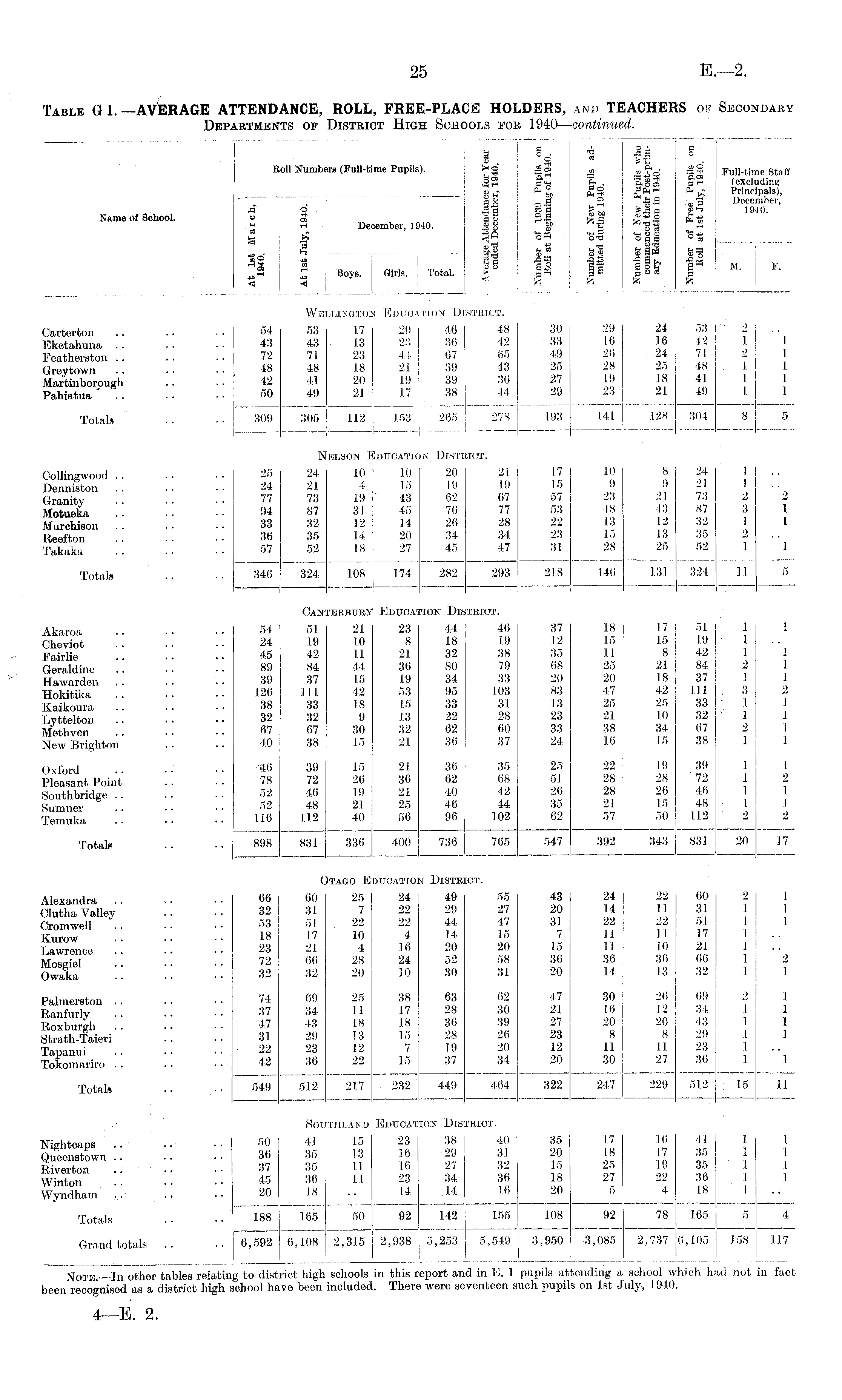 Table G1.—AVERAGE ATTENDANCE, ROLL, FREE-PLACE HOLDERS, and TEACHERS of Secondary Departments of District High Schools for 1940—continued.