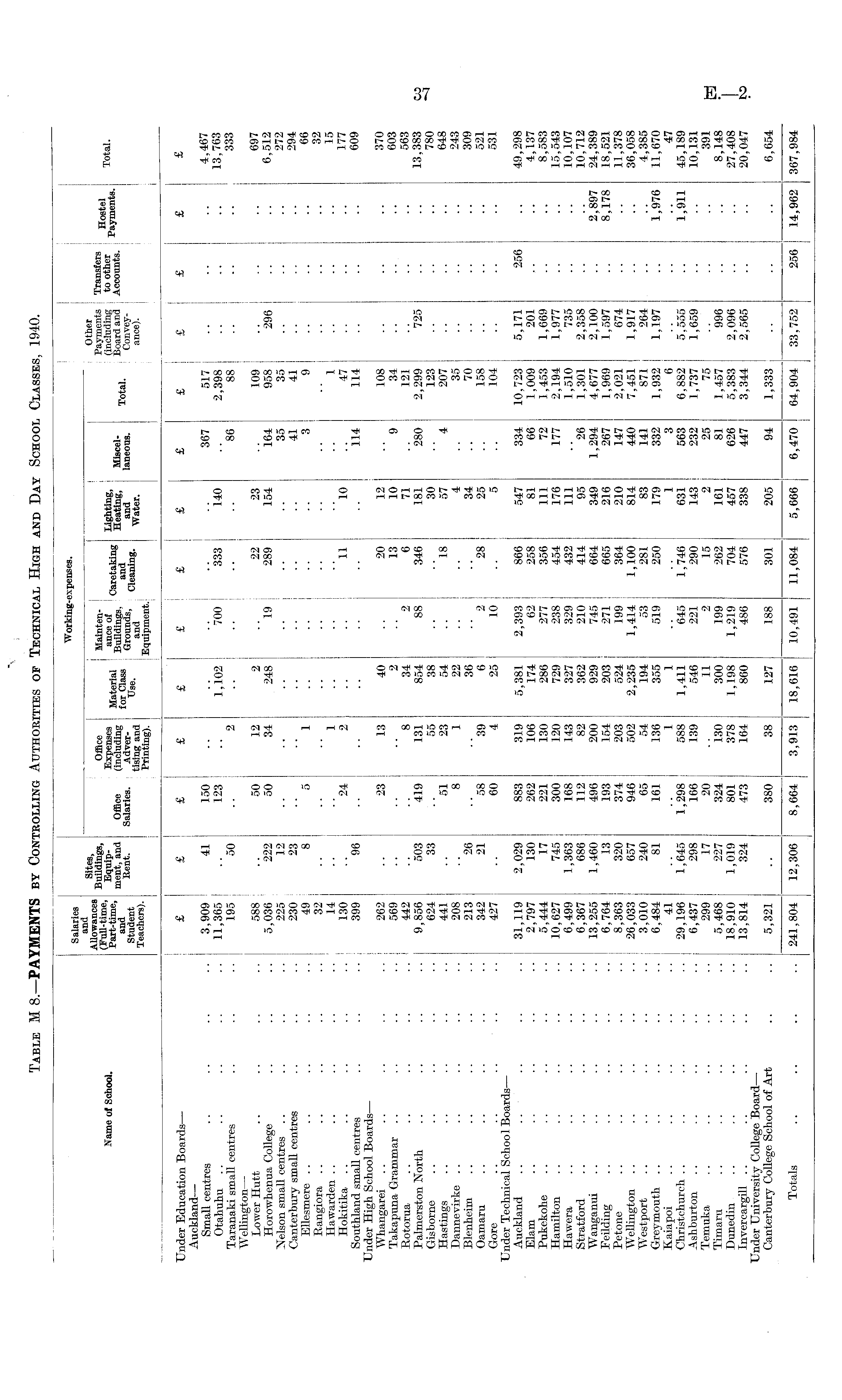 _ , . Working-expenses. Salaries Sites, I ; 1 1 i i j Other ™!?ii S Buildings, Office Hainten- ! : Payments Transfers Hrwtel Name of School, Equip- Expenses Mat „. M ance of Caretakin[ ,! Lighting, (including toother p a ™ ent9 Total. ' ment, and Office (including Buildings. g Heating, Miscel- Tnf oi Board and Accounts. fieit. Salaries. Adver- Ground, p,™!, ! and i laneous. i TotaL Conveytisingand Use - and Cleamng. , Water _ | ance) _ ieacnersj. Printing). Equipment.: Under Education Boards — £ £ £ ££ £ £ £ £ £ £ £ £;£ Auckland — Small centres .. .. .. •• j 3,909 41 150 .. .. .. .. .. 367 517 1 .. .. •* 4,467 Otahuhu .. .. .. .. .. 11,365 .. 123 .. 1,102 700 333 140 .. 2,398: .. .. .. | 13,763 Taranaki small centres .. .. .. I 195 50 .. 2 j .. .. 86 88 j .. .. 333 Wellington — Lower Hutt .. .. .. .. 588 .. 50 12 2 I 22 23 .. 109 j .. .. 697 Horowhenua College .. .. .. 5,036 222 50 34 248 j 19 289 154 164 958 j 296 .. .. 6,512 Nelson small centres .. .. .. .. 225 12 .. .. • - ■ • ■ • • • 35 [ .. .. .. 272 Canterbury small centres .. .. .. 230 23 .. .. • • i ■ • • • • • 41 41 j .. .. ■. 294 Ellesmere .. .. .. .. .. 49 8 5 1 .. .. .. .. 3 9 j .. . • 66 Rangiora .. .. .. .. .. 32 .. .. .. J .. .. .. .. • • I • • • • • • Hawarden .. .. .. .. .. 14 .. .. 1 .... .. .. .. 1 .. .. .. 15 Hokitika .. .. .. .. .. 130 .. 24 2 .. 11 10 .. 47 S .. .. 177 Southland small centres .. .. .. 399 96 .. .. .. .. .. .. 114 114 .. .. .. 609 Under High School Boards — Whangarei .. .. .. .. .. 262 .. 23 13 40 .. 20 12 .. 108 .. .. .. 370 Takapuna Grammar .. .. .. .. 569 .. .. .. 2 .. 13 10 9 34 .. .. .. 603 Rotorua .. .. .. .. . . 442 .. .. 8 34 2 6 71 .. 121 .. .. .. 563 Palmerston North .. .. .. .. 9,856 503 419 131 854 88 346 181 280 2,299 725 .. .. 13,383 Gisborne .. .. .. .. .. 624 33 .. 55 38 .. .. 30 .. 123 .. .. .. 780 Hastings .. .. .. .. .. 441 .. 51 23 54 .. 18 57 4 207 .. .. .. 648 Dannevirke .. .. .. .. .. 208 .. 8 1 22 .. .. 4 .. 35 I .. .. 243 Blenheim .. .. .. .. .. 213 26 .. .. 36 .. .. 34 .. 70 .. .. .. 309 Oamaru .. .. .. .. .. 342 21 58 39 6 2 28 25 .. 158 .. .. 521 Gore .. .. .... .. 427 .. 60 4 25 10 .. 5 .. 104 .. .. 531 Under Technical School Boards — Auckland .. .. .. .. .. 31,119 2,029 883 319 5,381 2,393 866 547 334 10,723 J 5,171 256 .. 49,298 Elam .. .. .. .. .. 2,797 130 262 106 174 62 258 81 66 1,009 J 201 .. .. 4,137 Pukekohe .. .. .. .. .. 5,444 17 221 130 286 277 356 111 72 1,453 1,669 .. .. 8,583 Hamilton .. .. .. .. .. 10,627 745 300 120 729 238 454 176 177 2,194 1,977 .. .. 15,543 Hawera .. .. .. .. .. 6,499 1,363 168 143 327 329 432 111 .. 1,510 735 .. .. 10,107 Stratford .. .. .. .. .. 6,367 686 112 82 362 210 414 95 26 1,301 2,358 .. .. 10,712 Wanganui .. .. .. .. .. 13,255 1,460 496 200 929 745 664 349 1,294 4,677 2,100 .. 2,897 24,389 Eeilding .. .. .. .. .. 6,764 13 193 154 203 271 665 216 267 1,969 1,597 .. 8,178 18,521 Petone .. .. .. .. .. 8,363 320 374 203 524 199 364 210 147 2,021 j 674 .. .. 11,378 Wellington .. .. .. .. .. 26,033 657 946 502 2,235 1,414 1,100 814 440 7,451 j 1,917 .. .. 36,058 Westport .. .. .. .. .. 3,010 240 65 54 194 53 281 83 141 871 264 .. .. 4,385 Greymouth .. .. .. .. .. 6,484 81 161 136 355 519 250 179 332 1,932 1,197 .. 1,976 11,670 Kaiapoi .. .. .. .. .. 41 .. .. 1 1 .. .. 1 3 6 .. .. .. 47 Christchurch .. .. .. .. .. 29,196 1,645 1,298 588 1,411 645 1,746 631 563 6,882 5,555 .. 1,911 45,189 Ashburton .. .. .. .. .. 6,437 298 166 139 546 221 290 143 232 1,737 1,659 .. .. 10,131 Temuka .. .. .. .. .. 299 17 20 11 2 15 2 25 75 .. .. 391 Timaru .. .. .. .. .. 5,468 227 324 130 300 199 262 161 81 1,457 996 .. .. 8,148 Dunedin .. .. .. .. .. 18,910 1,019 801 378 1,198 1,219 704 457 626 5,383 2,096 .. .. 27,408 Invercargill .. .. .. .. .. 13,814 324 473 164 860 486 576 338 447 3,344 2,565 .. .. 20,047 Under University College Board —• Canterbury College School of Art .. .. 5,321 .. 380 38 127 188 301 205 94 1,333 .. .. .. 6,654 Totals .. .. .. .. 241,804 12,306 8,664 3,913 18,616 10,491 11,084 5,666 6,470 64,904 33,752 256 14,962 367,984