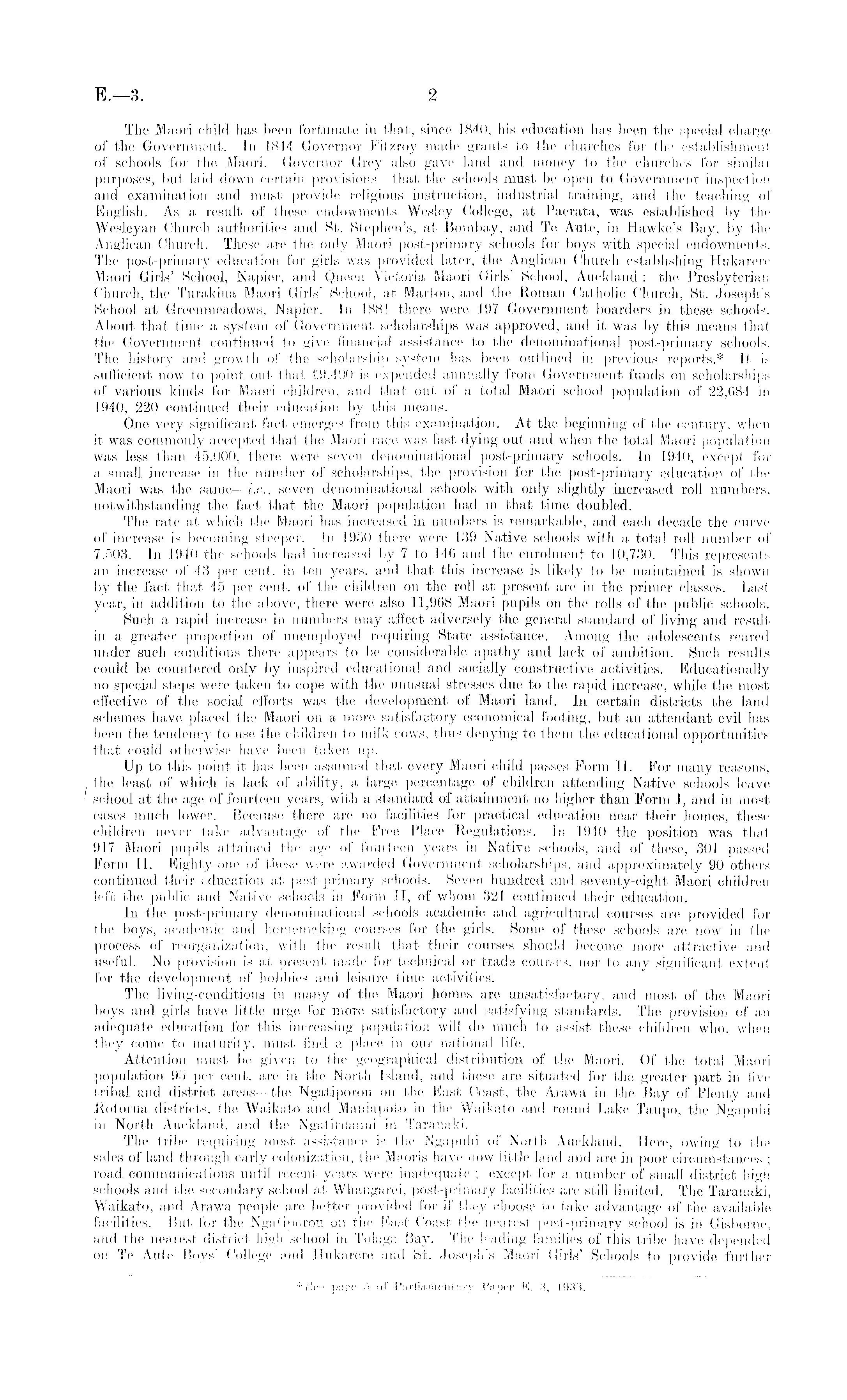 The Maori child has been fortunate in that, since 1840, his education has been the special charge of the Government. In 1844 Governor Fitzroy made grants to the churches for the establishment of schools for the Maori. Governor Grey also gave land and money to the churches for similar purposes, but laid down certain provisions—that the schools must be open to Government inspection and examination and must provide religious instruction, industrial training, and the teaching of English. As a result of these endowments Wesley College, at Paerata, was established by the Wesleyan Church authorities and St. Stephen's, at Bombay, and Te Aute, in Hawke's Bay, by the Anglican Church. These are the only Maori post-primary schools for boys with special endowments. The post-primary education for girls was provided later, the Anglican Church establishing Hukarere Maori Girls' School, Napier, and Queen Victoria Maori Girls' School, Auckland ; the Presbyterian Church, the Turakina Maori Girls' School, at Marton, and the Roman Catholic Church, St. Joseph's School at Greenmeadows, Napier. In 1881 there were 197 Government boarders in these schools. About that time a system of Government scholarships was approved, and it was by this means that the Government continued to give financial assistance to the denominational post-primary schools. The history and growth of the scholarship system has been outlined in previous reports.* It is sufficient now to point out that £9,400 is expended annually from Government funds on scholarships of various kinds for Maori children, and that out of a total Maori school population of 22,684 in 1940, 220 continued their education by this means. One very significant fact emerges from this examination. At the beginning of the century, when it was commonly accepted that the Maori race was fast dying out and when the total Maori population was less than 45,000, there were seven denominational post-primary schools. In 1940, except for a small increase in the number of scholarships, the provision for the post-primary education of the Maori was the same —i.e., seven denominational schools with, only slightly increased roll numbers, notwithstanding the fact that the Maori population had in that time doubled. The rate at which the Maori has increased in numbers is remarkable, and each decade the curve of increase is becoming steeper. In 1930 there were 139 Native schools with a total roll number of 7,503. In 1940 the schools had increased by 7to 146 and the enrolment to 10,730. This represents an increase of 43 per cent, in ten years, and that this increase is likely to be maintained is shown by the fact that 45 per cent, of the children on the roll at present are in the primer classes. Last year, in addition to the above, there were also 11,968 Maori pupils on the rolls of the public schools. Such a rapid increase in numbers may affect adversely the general standard of living and result in a greater proportion of unemployed requiring State assistance. Among the adolescents reared under such conditions there appears to be considerable apathy and lack of ambition. Such results could be countered only by inspired educational and socially constructive activities. Educationally no special steps were taken to cope with the unusual stresses due to the rapid increase, while the most effective of the social efforts was the development of Maori land. In certain districts the land schemes have placed the Maori on a more satisfactory economical footing, but an attendant evil has been the tendency to use the children to milk cows, thus denying to them the educational opportunities that could otherwise have been taken up. Up to this point it has been assumed that every Maori child passes Form 11. For many reasons, the least of which is lack of ability, a large percentage of children attending Native schools leave / school at the age of fourteen years, with a standard of attainment no higher than Form I, and in most cases much lower. Because there are no facilities for practical education near their homes, these j children never take advantage of the Free Place Regulations. In 1940 the position was that j 917 Maori pupils attained the age of fourteen years in Native schools, and of these, 301 passed 1 Form 11. Eighty-one of these were awarded Government scholarships, and approximately 90 others continued their education at post-primary schools. Seven hundred and seventy-eight Maori children left the public and Native schools in Form 11, of whom 321 continued their education. In the post-primary denominational schools academic and agricultural courses are provided for the boys, academic and homemaking courses for the girls. Some of these schools are now in the process of reorganization, with the result that their courses should become more attractive and useful. No provision is at present made for technical or trade courses, nor to any significant extent for the development of hobbies and leisure time activities. The living-conditions in many of the Maori homes are unsatisfactory, and most of the Maori ! boys and girls have little urge for more satisfactory and satisfying standards. Ttie provision of an adequate education for this increasing population will do much to assist these children who, when they come to maturity, must find a place in our national life. Attention must be given to the geographical distribution of the Maori. Of the total Maori population 95 per cent, are in the North Island, and these are situated for the greater part in five tribal and district areas—the Ngatiporou on the East Coast, the Arawa in the Bay of Plenty and Rotorua districts, the Waikato and Maniapoto in the Waikato and round Lake Taupo, the Ngapuhi in North Auckland, and the Ngatiruanui in Taranaki. The tribe requiring most assistance is the Ngapuhi of North Auckland. Here, owing to the sales of land through early colonization, the Maoris have now little land and are in poor circumstances ; road communicat