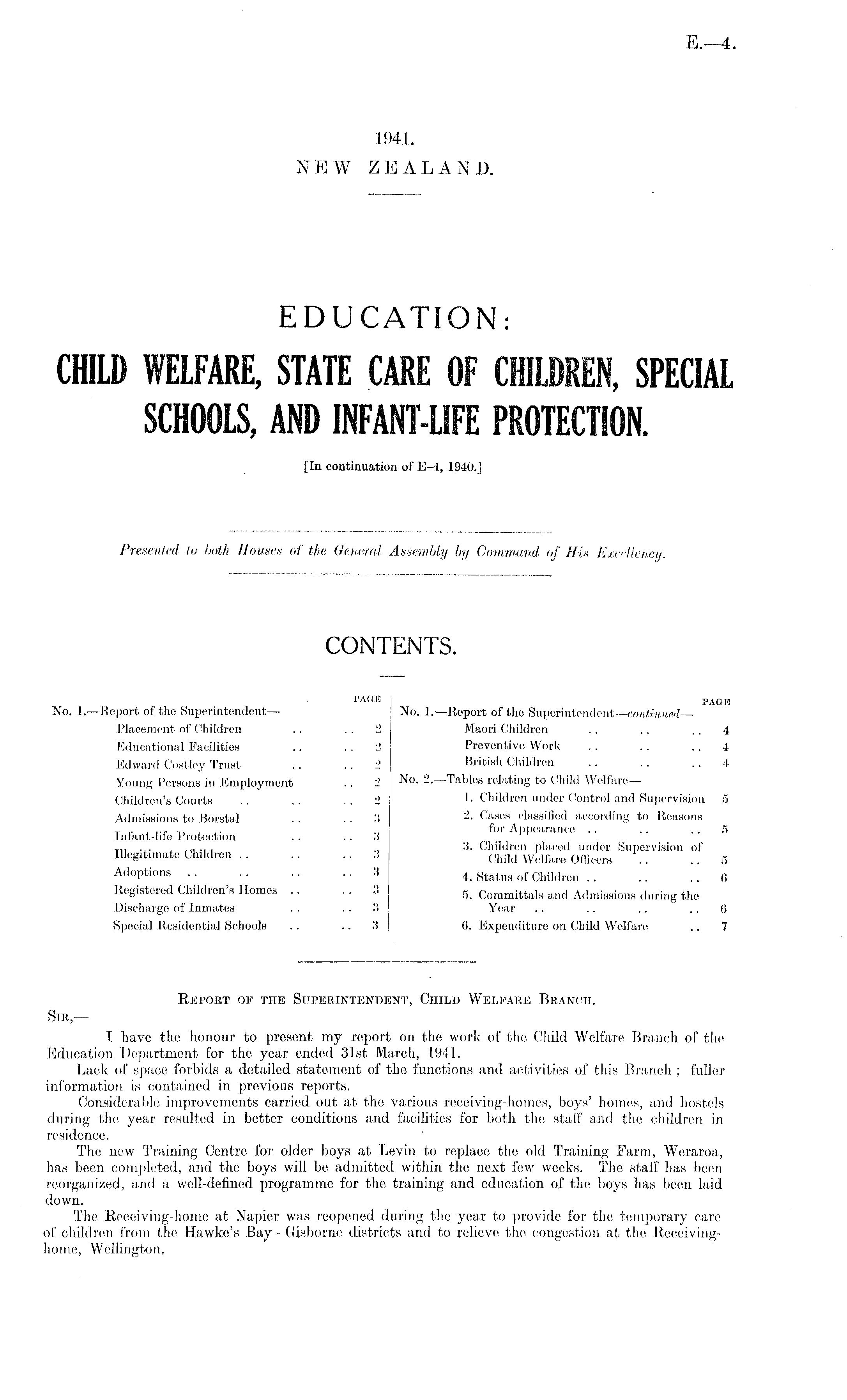 Report op the Superintendent, Child Welfare Branch. Sir,— I have the honour to present my report on the work of the Child Welfare Branch of the Education Department for the year ended 31st March, 1941. Lack of space forbids a detailed statement of the functions and activities of this Branch ; fuller information is contained in previous reports. Considerable improvements carried out at the various receiving-homes, boys' homes, and hostels during the year resulted in better conditions and facilities for both the staff and the children in residence. The new Training Centre for older boys at Levin to replace the old Training Farm, Weraroa, has been completed, and the boys will be admitted within the next few weeks. The staff has been reorganized, and a well-defined programme for the training and education of the boys has been laid down. The Receiving-home at Napier was reopened during the year to provide for the temporary care of children from the Hawke's Bay - Gisborne districts and to relieve the congestion at the Receivinghome, Wellington,