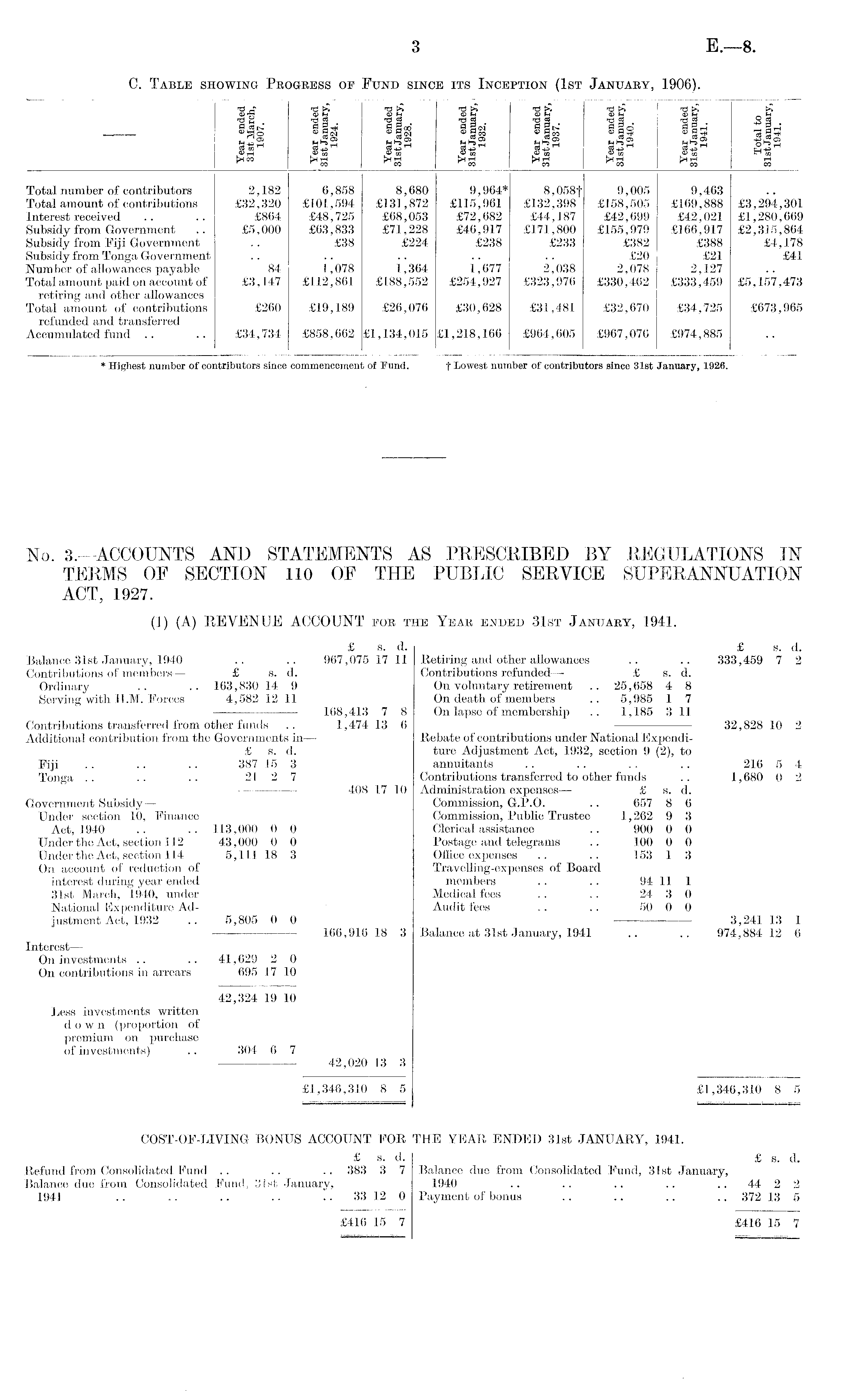 No. 3.—ACCOUNTS AND STATEMENTS AS PRESCRIBED BY REGULATIONS IN TERMS OF SECTION 110 OF THE PUBLIC SERVICE SUPERANNUATION ACT, 1927. (1) (A) REVENUE ACCOUNT foe the Year ended 31st January, 1941. £ s. d. £ g. d. Balance 31st January, 1940 .. .. 967,075 17 11 Retiring and other allowances .. .. 333,459 7 2 Contributions of members — £ s. d. Contributions refunded— £ s. d. Ordinary .. .. 163,830 14 9 On voluntary retirement .. 25,658 4 8 Serving with H.M. Forces 4,582 12 11 On death of members .. 5,985 1 7 168,413 7 8 On lapse of membership .. 1,185 311 Contributions transferred from other funds .. 1,474 13 6 32,828 10 2 Additional contribution from the Governments in— Rebate of contributions under National Expendi- £ s. d. ture Adjustment Act, 1932, section 9 (2), to Fiji .. .. .. 387 15 3 annuitants .. .. . . .. 216 5 4 Tonga .. .. .. 21 2 7 Contributions transferred to other funds .. 1,680 0 2 408 17 10 Administration expenses— £ s. d. Government Subsidy— Commission, G.P.O. .. 657 8 6 Under section 10, Finance Commission, Public Trustee 1,262 9 3 Act, 1940 .. .. 113,000 0 0 Clerical assistance .. 900 0 0 Under the Act, section 112 43,000 0 0 Postage and telegrams .. 100 0 0 Underthe Act, section 114 5,111 18 3 Office expenses .. .. 153 1 3 On account of reduction of Travelling-expenses of Board interest during year ended members .. .. 94 11 1 31st March, 1940, under Medical fees .. .. 24 3 0 National Expenditure Ad- Audit fees .. .. 50 0 0 justment Act, 1932 .. 5,805 0 0 3,241 13 1 ■ 166,916 18 3 Balance at 31st January, 1941 .. .. 974,884 12 6 Interest — On investments .. .. 41,629 2 0 On contributions in arrears 695 17 10 42,324 19 10 Less investments written down (proportion of premium on purchase of investments) .. 304 6 7 — 42,020 13 3 £1,346,310 8 5 £1,346,310 8 5 COST-OF-LIVING BONUS ACCOUNT FOR THE YEAR ENDED 31st JANUARY, 1941. £ s. d. £ s. d. Refund from Consolidated Fund .. .. .. 383 3 7 Balance due from Consolidated Fund, 31st January, Balance due from Consolidated Fund, 31st January, 1940 .. .. .. .. 44 22 1941 .. .. .. .. .. 33 12 0 Payment of bonus .. .. .. .. 372 13 5 £416 15 7 £416 15 7