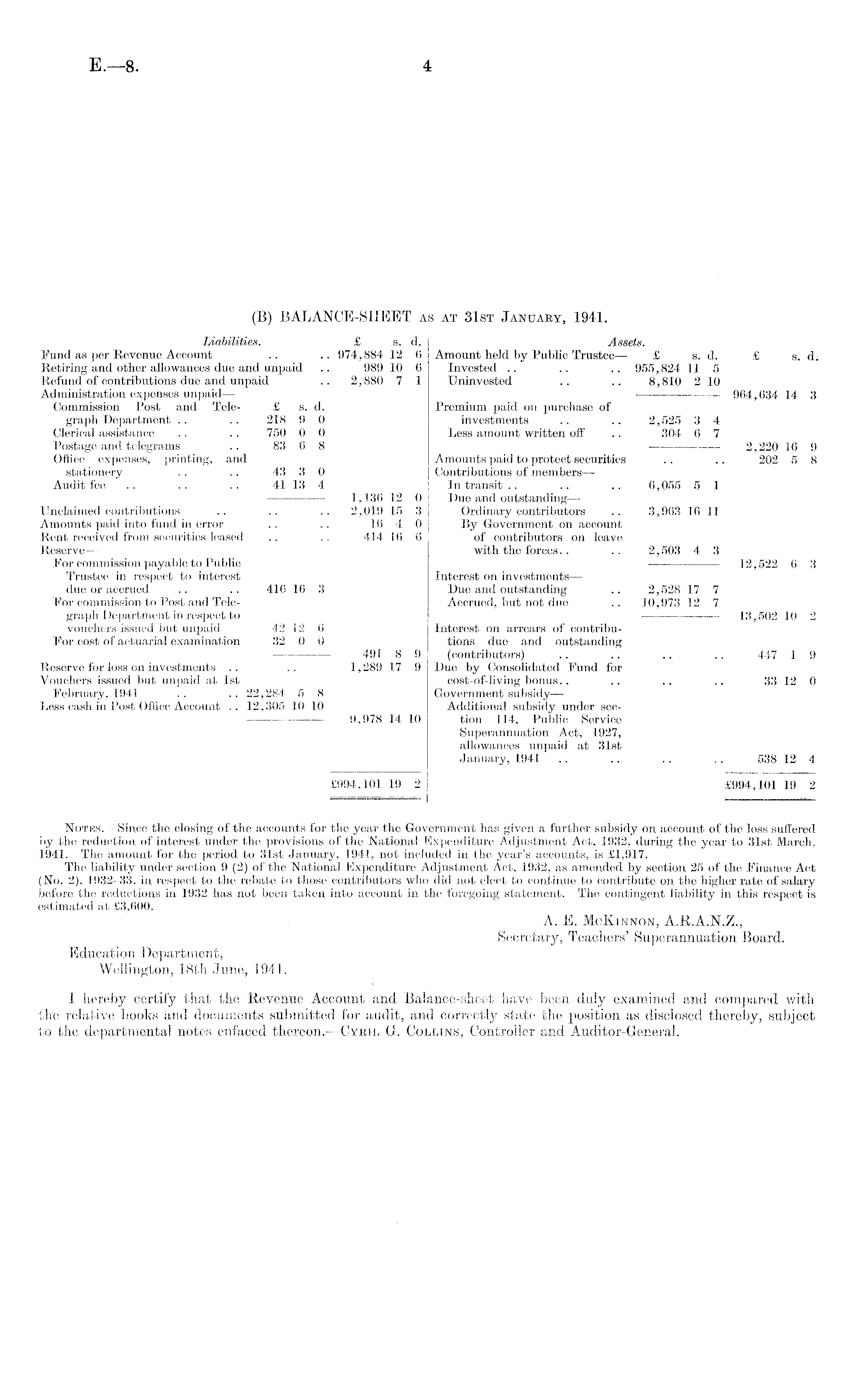 (B) BALANCE-SHEET as at 31st January, 1941. Liabilities. £ s. d. Assets. Fund as per Revenue Account .. .. 974,884 12 6 Amount held by Public Trustee — £ s. d. £ s. d. Retiring and other allowances due and unpaid .. 989 10 6 Invested .. .. .. 955,824 II 5 Refund of contributions due and unpaid .. 2,880 7 1 Uninvested .. .. 8,810 210 Administration expenses unpaid—■ — 964,634 14 3 Commission Post and Tele- £ s. d. Premium paid on purchase of graph Department .. .. 218 9 0 investments .. .. 2,525 3 4 Clerical assistance .. .. 750 0 0 Less amount written off .. 304 6 7 Postage and telegrams .. 83 6 8 2,220 16 9 Office expenses, printing, and Amounts paid to protect securities .. .. 202 5 8 stationery .. .. 43 3 0 Contributions of members— Audit fee .. .. .. 41 13 4 In transit .. .. .. 6,055 5 1 1,136 12 0 Due and outstandingUnclaimed contributions .. .. .. 2,019 15 3 Ordinary contributors .. 3,963 16 11 Amounts paid into fund in error .. .. 16 4 0 By Government on account Rent received from securities leased .. .. 414 16 6 of contributors on leave Reserve — with the forces.. .. 2,503 4 3 For commission payable to Public 12,522 6 3 Trustee in respect to interest Interest on investments — due or accrued .. .. 416 16 3 Due and outstanding .. 2,528 17 7 For commission to Post and Tele- Accrued, but not due .. 10,973 12 7 graph Department in respect to 13,502 10 2 vouchers issued but unpaid 4-2 12 6 Interest on arrears of contribuFor cost of actuarial examination 32 0 0 tions duo and outstanding — 491 8 9 (contributors) .. .. .. .. 447 1 9 Reserve for loss on investments .. .. 1,289 17 9 Due by Consolidated Fund for Vouchers issued but unpaid at Ist cost-of-living bonus.. .. .. .. 33 12 0 February, 1941 .. .. 22,284 5 8 Government subsidy— Less cash in Post Office Account .. 12,305 10 10 Additional subsidy under sec9,978 14 10 tion 114, Public Service Superannuation Act, 1927, allowances unpaid at 31st January, 1941 .. .. .. .. 538 12 4 £994,101 19 2 £994,101 19 2 Notes. —Since the closing of the accounts for the year the Government has given a further subsidy on account of the loss suffered by the reduction of interest under the provisions of the National Expenditure Adjustment Act, 1932, during the year to 31st March, 1941. The amount for the period to 31st January, 1941, not included in the year's accounts, is £1,917. The liability under section 9 (2) of the National Expenditure Adjustment Act, 1932, as amended by section. 25 of the Finance Act (No. 2), 1932-33, in respect to the rebate to those contributors who did not elect to continue to contribute on the higher rate of salary before the reductions in 1932 has not been taken into account in the foregoing statement. The contingent liability in this respect is estimated at £3,600. A. E. MCKinnon, A.R.A.X.Z.. Secretary, Teachers' Superannuation Board. Education Department, Wellington, 18th June, 1941. I hereby certify that the Revenue Account and Balance-sheet have been duly examined and compared with the relative books and documents submitted for audit, and correctly state the position as disclosed thereby, subject to the departmental notes enfaced thereon. —Cyril G. Collins, Controller and Auditor-General.