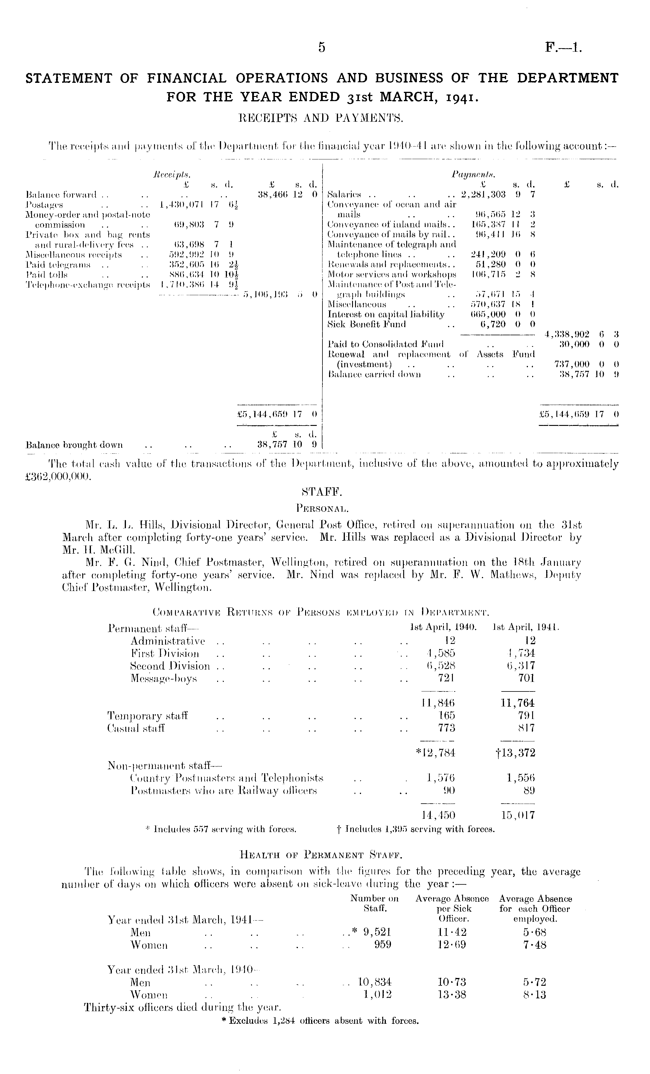 The receipts and payments of the Department for the financial year 1940-41 arc shown in the following account: — Receipts. Payments. £ s. d. £ s. d. £ a. d. £ s. d. Balance forward .. .. .. .. 38,460 12 0 Salaries .. .. .. 2,281,303 9 7 Postages .. .. 1,430,071 17 6J Conveyance of ocean and air Money-order and postal-note mails .. .. 96,565 12 3 commission .. .. 69,803 7 9 Conveyance of inland mails.. 165,387 11 2 Private box and bag rents Conveyance of mails by rail.. 96,411 16 8 and rural-delivery fees .. 63,698 7 1 Maintenance of telegraph and Miscellaneous receipts .. 592,992 10 9 telephone lines .. .. 241,209 0 6 Paid telegrams .. .. 352,605 16 2£ Renewals and replacements.. 51,280 0 0 Paid tolls .. .. 886,634 10 lOf Motor services and workshops 106,715 2 8 Telephone-exchange receipts 1,710,386 14 9j Maintenance of Post and Tele5,106,193 5 0 graph buildings .. 57,671 15 4 Miscellaneous .. .. 570,637 18 1 Interest on capital liability 665,000 0 0 Sick Benefit Fund .. 6,720 0 0 4,338,902 6 3 Paid to Consolidated Fund .. .. 30,000 0 0 Renewal and replacement of Assets Fund (investment) .. .. .. .. 737,000 0 0 Balance carried down .. .. .. 38,757 10 9 £5,144,659 17 0 £5,144,659 17 0 £ s. d. Balance brought down .. .. .. 38,757 10 9 The total cash value of the transactions of the Department, inclusive of the above, amounted to approximately £362,000,000. STAFF. Personal. Mr. L. L. Hills, Divisional Director, General Post Office, retired on superannuation on the 31st March after completing forty-one years' service. Mr. Hills was replaced as a Divisional Director by Mr. H. McGill. Mr. F. G. Nind, Chief Postmaster, Wellington, retired on superannuation on the 18th January after completing forty-one years' service. Mr. Nind was replaced by Mr. F. W. Mathews, Deputy Chief Postmaster, Wellington. Comparative Returns of Persons employed in Department. Permanent staff — Ist April, 1940. Ist April, 1941. Administrative .. .. .. . . . . 12 12 First Division .. .. .. .. '.. 4,585 4,734 Second Division .. .. .. .. .. 6,528 6,317 Message-boys .. .. .. .. .. 721 701 11,846 11,764 Temporary staff .. .. .. .. .. 165 791 Casual staff .. . . . . . . . . 773 817 *12,784 f13,372 Non-permanent staff— Country' Postmasters and Telephonists .. .. 1,576 1,556 Postmasters who are Railway officers .. .. 90 89 14,450 15,017 * Includes 557 serving with forces. t Includes 1,395 serving with forces. Health of Permanent Staff. The following table shows, in comparison with the figures for the preceding year, the average number of days on which officers were absent on sick-leave during the year: — Number on Average Absence Average Absenoe Staff. per Sick for each Officer Year ended 31st March, 1941— Officer. employed.. Men .. .. .. ..*9,521 11-42 5-68 Women .. .. .. .. 959 12-69 7-48 Year ended 31st March, 1940 — Men .. .. .. 10,834 10-73 5-72 Women .. .. 1,012 13-38 8-13 Thirty-six officers died during the year. * Excludes 1,284 officers absent with forces.