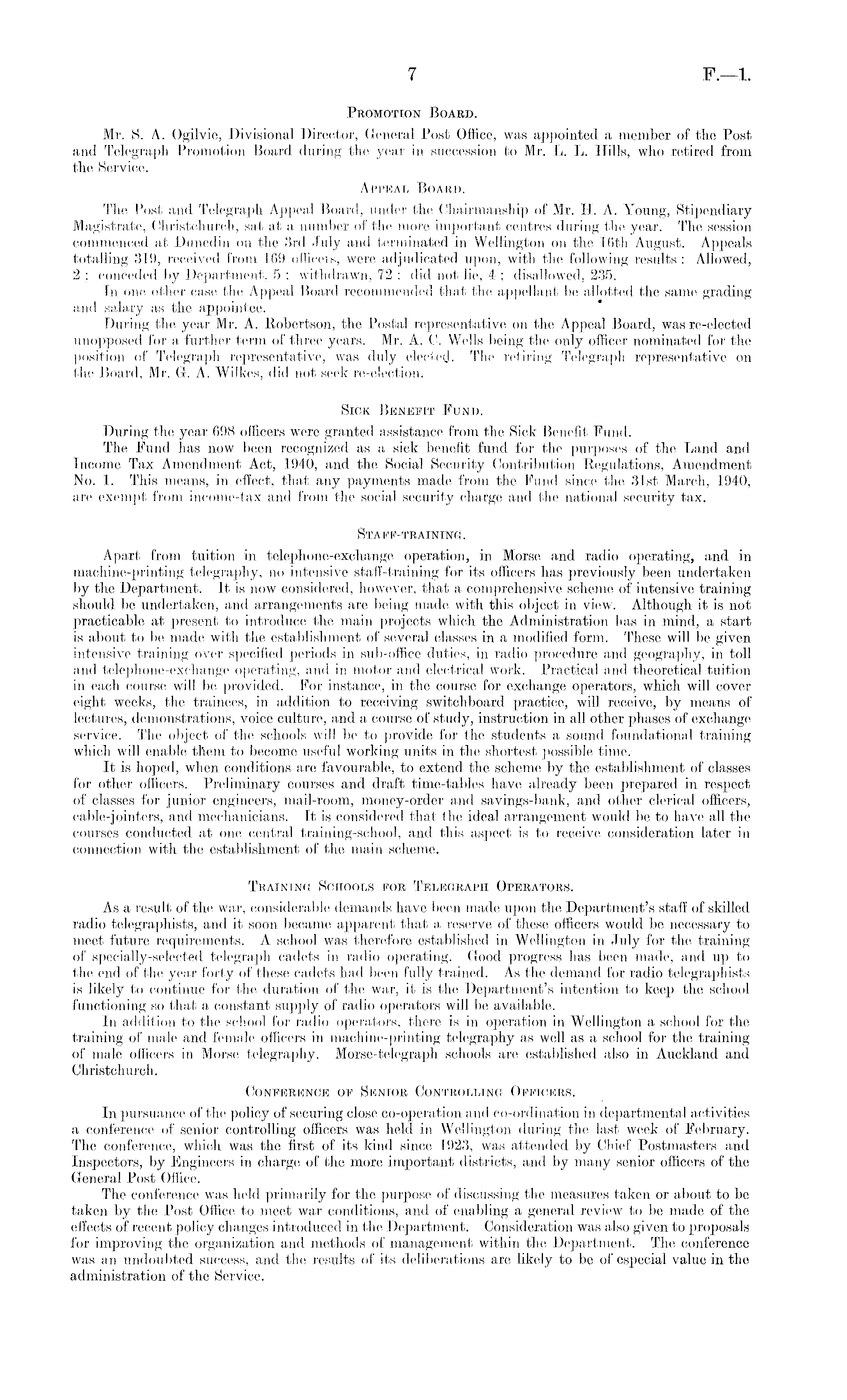 Promotion Boaed. Mr. S. A. Ogilvie, Divisional Director, General Post Office, was appointed a member of the Post and Telegraph Promotion Board during the year in succession to Mr. L. L. Hills, who retired from the Service. Appeal Board. The Post and Telegraph Appeal Board, under the Chairmanship of Mr. H. A. Young, Stipendiary Magistrate, Christchurch, sat at a number of the more important centres during the year. The session commenced at Dunedin on the 3rd July and terminated in Wellington on the 16th August. Appeals totalling 319, received from 169 officers, were adjudicated upon, with the following results : Allowed, 2 ; conceded by Department, 5 ; withdrawn, 72 ; did not lie, 4 ; disallowed, 235. In one other case the Appeal Board recommended that the appellant be allotted the same grading and salary as the appointee. During the year Mr. A. Robertson, the Postal representative on the Appeal Board, was rc-elected unopposed for a further term of three years. Mr. A. C. Wells being the only officer nominated for the position of Telegraph representative, was duly elected. The retiring Telegraph representative on the Board, Mr. G. A. Wilkes, did not seek re-election, Siok Benefit Fund. During the year 698 officers were granted assistance from the Sick Benefit Fund. The Fund has now been recognized as a sick benefit fund for the purposes of the Land and Income Tax Amendment Act, 1940, and the Social Security Contribution Regulations, Amendment No. 1. This means, in effect, that any payments made from the Fund since the 31st, March, 1940, are exempt from income-tax and from the social security charge and the national security tax. Staff-training. Apart from tuition in telephone-exchange operation, in Morse and radio operating, and in machine-printing telegraphy, no intensive staff-training for its officers has previously been undertaken by the Department. It is now considered, however, that a comprehensive scheme of intensive training shoulcj be undertaken, and arrangements are being made with this object in view. Although it is not practicable at present to introduce the main projects which the Administration has in mind, a start is about to be made with the establishment of several classes in a modified form. These will be given intensive training over specified periods in sub-office duties, in radio procedure and geography, in toll and telephone-exchange operating, and in motor and electrical work. Practical and theoretical tuition in each course will be provided. For instance, in the course for exchange operators, which will cover eight weeks, the trainees, in addition to receiving switchboard practice, will receive, by means of lectures, demonstrations, voice cultiire, and a course of study, instruction in all other phases of exchange service. The object of the schools will be to provide for the students a sound foundational training which will enable them to become useful working units in the shortest possible time. It is hoped, when conditions are favourable, to extend, the scheme by the establishment of classes for other officers. Preliminary courses and draft time-tables have already been prepared in respect of classes for junior engineers, mail-room, money-order and savings-bank, and other clerical officers, cable-jointers, and mechanicians. It is considered that the ideal arrangement would be to have all the courses conducted at one central training-school, and this aspect is to receive consideration later in connection with the establishment of the main scheme. Training Schools for Telegraph Operators. As a result of the war, considerable demands have been made upon the Department's staff of skilled radio telegraphists, and it soon became apparent that a reserve of these officers would be necessary to meet future requirements. A school was therefore established in Wellington in July for the training of specially-selected telegraph cadets in radio operating. Good progress has been made, and up to the end of the year forty of these cadets had been fully trained. As the demand for radio telegraphists is likely to continue for the duration of the war, it is the Department's intention to keep the school functioning so that a constant supply of radio operators will be available. In addition to the school for radio operators, there is in operation in Wellington a school for the training of male and female officers in machine-printing telegraphy as well as a school for the training of male officers in Morse telegraphy. Morse-telegraph schools are established also in Auckland and Christchurch. Conference of Senior Controlling Officers. In pursuance of the policy of securing close co-operation and co-ordination in departmental activities a conference of senior controlling officers was held in Wellington during the last week of February. The conference, which was the first of its kind since 1923, was attended by Chief Postmasters and Inspectors, by Engineers in charge of the more important districts, and by many senior officers of the General Post Office. The conference was held primarily for the purpose of discussing the measures taken or about to be taken by the Post Office to meet war conditions, and of enabling a general review to be made of the effects of recent policy changes introduced in the Department. Consideration was also given to proposals for improving the organization and methods of management within the Department. The conference was an undoubted success, and the results of its deliberations are likely to be of especial value in the administration of the Service,