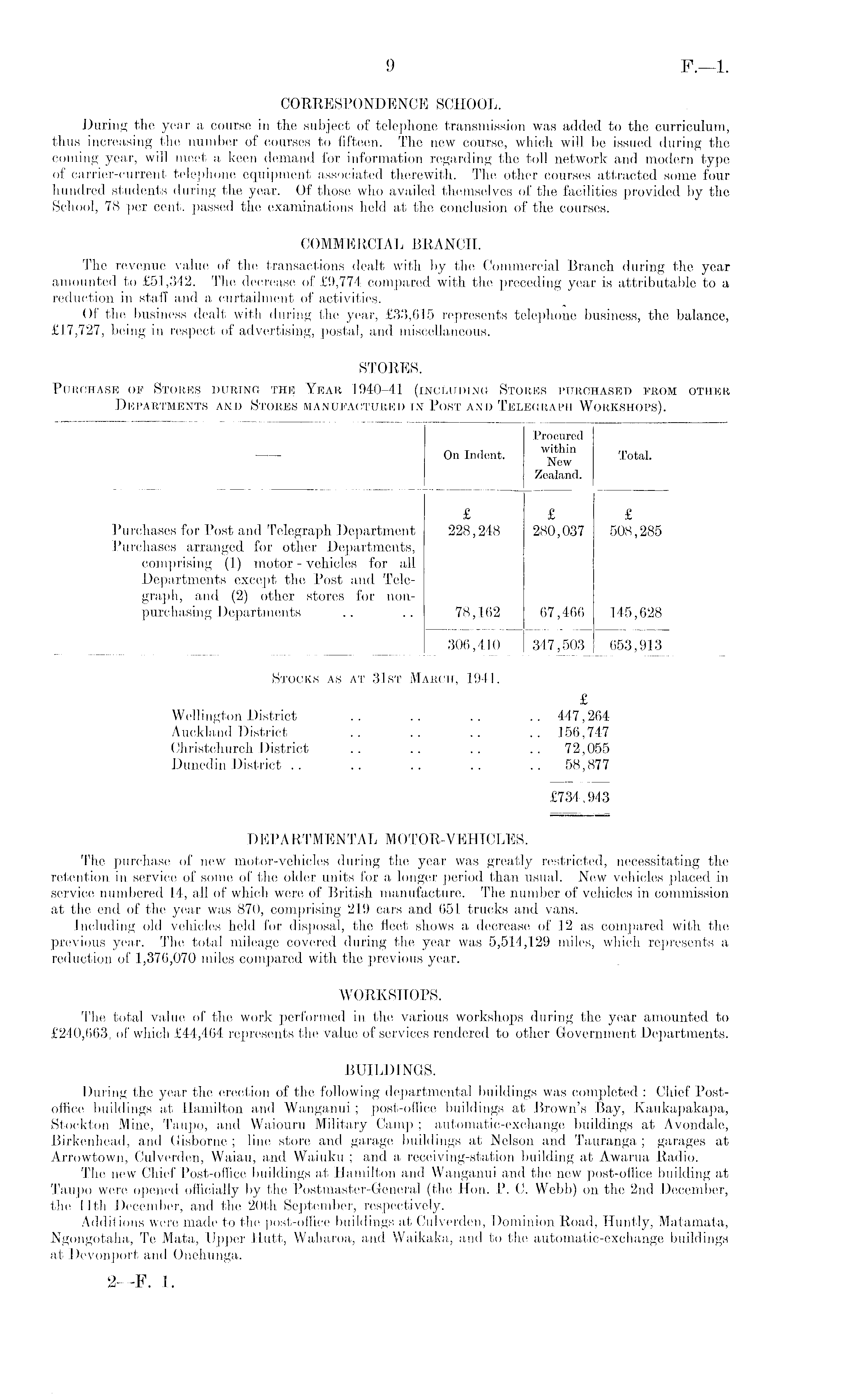 Stocks as at 31st March, 1941. £ Wellington District .. .. .. .. 447,264 Auckland District .. .. .. .. 156,747 Christchurch District .. .. .. .. 72,055 Duncdin District .. .. .. .. .. 58,877 £734,943 DEPARTMENTAL MOTOR-VEHICLES. The purchase of new motor-vehicles during the year was greatly restricted, necessitating the retention in service of some of the older units for a longer period than usual. New vehicles placed in service numbered 14, all of which were of British manufacture. The number of vehicles in commission at the end of the year was 870, comprising 219 cars and 651 trucks and vans. Including old vehicles held for disposal, the fleet shows a decrease of 12 as compared with the previous year. The total mileage covered during the year was 5,514,129 miles, which represents a reduction of 1,376,070 miles compared with the previous year. WORKSHOPS. The total value of the work performed in the various workshops during the year amounted to £240,663, of which £44,464 represents the value of services rendered to other Government Departments. BUILDINGS. During the year the erection of the following departmental buildings was completed : Chief Postoffice buildings at Hamilton and Wanganui; post-office buildings at Brown's Bay, Kaukapakapa, Stockton Mine, Taupo, and Waiouru Military Camp ; automatic-exchange buildings at Avondale, Birkenhead, and Gisborne ; line store and garage buildings at Nelson and Tauranga ; garages at Arrowtown, Culverden, Waiau, and Waiuku ; and a receiving-station building at Awarua Radio. The new Chief Post-office buildings at Hamilton and Wanganui and the new post-office building at Taupo were opened officially by the Postmaster-General (the Hon. P. C. Webb) on the 2nd December, the 11th December, and the 20th September, respectively. Additions were made to the post-office buildings at Culverden, Dominion Road, Huntly, Matamata, Ngongotaha, Te Mata, Upper Hutt, Waharoa, and Waikaka, and to the automatic-exchange buildings at Devonport and Onehunga.