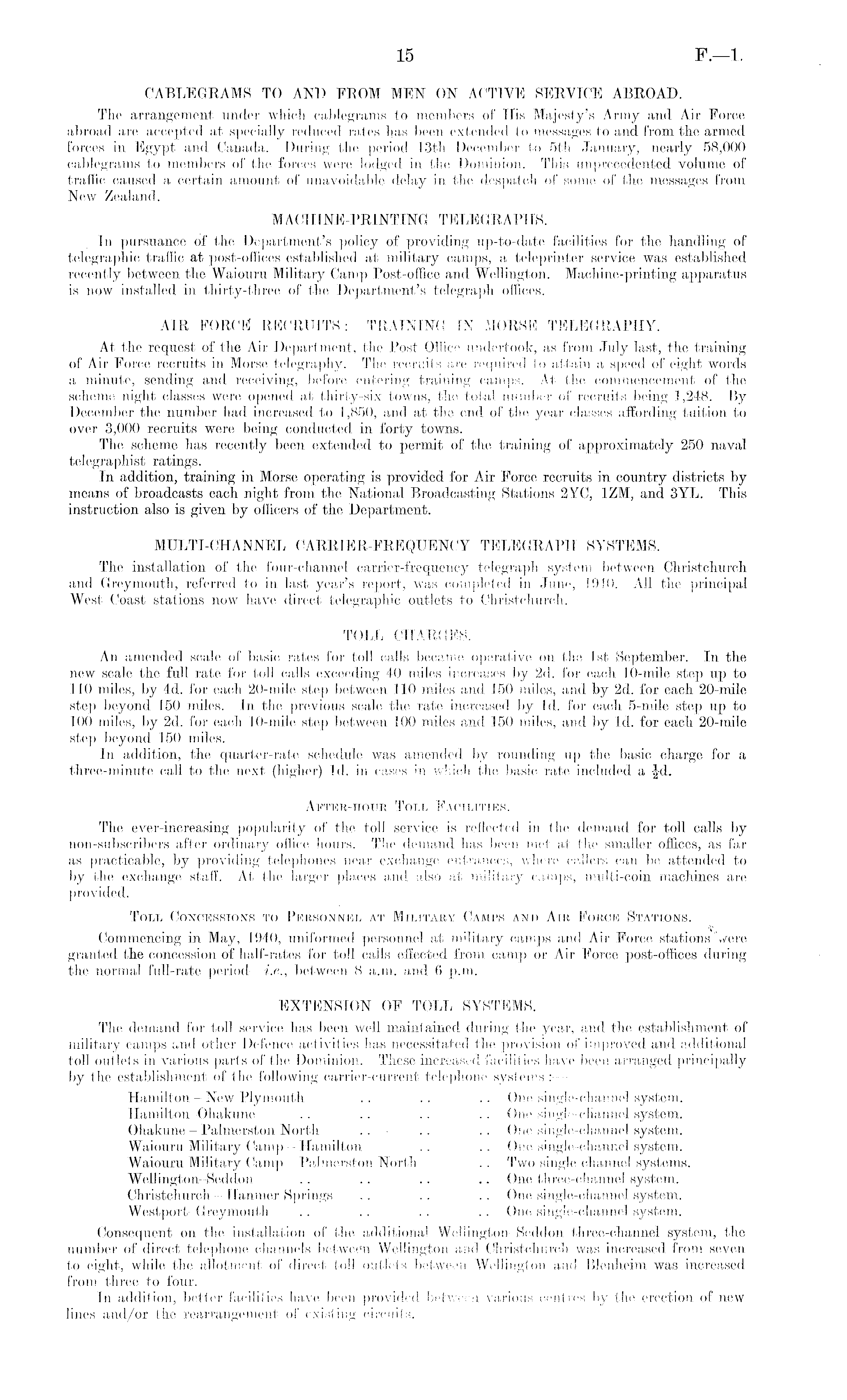 CABLEGRAMS TO AND FROM MEN ON ACTIVE SERVICE ABROAD. The arrangement under which cablegrams to members of His Majesty's Army and Air Force abroad are accepted at specially reduced rates has been extended to messages to and from the armed forces in Egypt and Canada. During the period 13th December to sth January, nearly 58,000 cablegrams to members of the forces were lodged in the Dominion. This unprecedented volume of traffic caused a certain amount of unavoidable delay in the despatch of some of the messages from New Zealand. MACHINE-PRINTING TELEGRAPHS. In pursuance of the Department's policy of providing up-to-date facilities for the handling of telegraphic traffic at post-offices established at military camps, a teleprinter service was established recently between the Waiouru Military Camp Post-office and Wellington. Machine-printing apparatus is now installed in thirty-three of the Department's telegraph offices. AIR FORCE RECRUITS: TRAINING TN MORSE TELEGRAPHY. At the request of the Air Department, the Post Office undertook, as from July last, the training of Air Force recruits in Morse telegraphy. The recruits are required to attain a speed of eight words a minute, sending and receiving, before entering training camps. At the commencement of the scheme night classes were opened at thirty-six towns, the total number of recruits being 1,248. By December the number had increased to 1,850, and at the end of the year classes affording tuition to over 3,000 recruits were being conducted in forty towns. The scheme has recently been extended to permit of the training of approximately 250 naval telegraphist ratings. In addition, training in Morse operating is provided for Air Force recruits in country districts by means of broadcasts each night from the National Broadcasting Stations 2YC, IZM, and 3YL. This instruction also is given by officers of the Department. MULTI-CHANNEL CARRIER-FREQUENCY TELEGRAPH SYSTEMS. The installation of the four-channel carrier-frequency telegraph system between Christchurch and Greymouth, referred to in last year's report, was completed in June, 1940. All the principal West Coast stations now have direct telegraphic outlets to Christchurch. TOLL CHARGES. An amended scale of basic rates for toll calls became operative on the Ist September. In the new scale the full rate for toll calls exceeding 40 miles increases by 2d. for each 10-mile step up to 110 miles, by 4d. for each 20-mile step between 110 miles and 150 miles, and by 2d. for each 20-mile step beyond 150 miles. In the previous scale the rate increased by Id. for each 5-mile step up to 100 miles, by 2d. for each 10-mile step between 100 miles and 150 miles, and by Id. for each 20-mile step beyond 150 miles. In addition, the quarter-rate schedule was amended by rounding up the basic charge for a three-minute call to the next (higher) Id. in cases in which the basic rate included a Jd. After-hour Toll Facilities. The ever-increasing popularity of the toll service is reflected in the demand for toll calls by non-subscribers after ordinary office hours. The demand has been met at the smaller offices, as far as practicable, by providing telephones near exchange entrances, where callers can be attended to by the exchange staff. At the larger places and also at military camps, multi-coin machines are provided. Toll Concessions to Personnel at Military Camps and Air Force Stations. Commencing in May, 1940, uniformed personnel at military camps and Air Force stations^>/ere granted the concession of half-rates for toll calls effected from camp or Air Force post-offices during the normal full-rate period —i.e., between 8 a.m. and 6 p.m. EXTENSION OF TOLL SYSTEMS. The demand for toll service has been well maintained during the year, and the establishment of military camps and other Defence activities has necessitated the provision of improved and additional toll outlets in various parts of the Dominion. These increased facilities have been arranged principally by the establishment of the following carrier-current telephone systems : — Hamilton - New Plymouth .. .. .. One single-channel system. Hamilton-Ohakune .. .. .. . . One single-channel system. Ohakune - Palmerston North .. ■ .. .. One single-channel system. Waiouru Military Camp - Hamilton .. .. One single-channel system. Waiouru Military Camp - Palmerston North . . Two single channel systems. Wellington-Seddon . . . . .. .. One three-channel system. Christchurch - Hanmer Springs . . . . . . One single-channel system. Westport-Greymouth . . .. .. . . One single-channel system. Consequent on the installation of the additional Wellington-Seddon three-channel system, the number of direct telephone channels between Wellington and Christchurch was increased from seven to eight, while the allotment of direct toll outlets between Wellington and Blenheim was increased from three to four. In addition, better facilities have been provided between various centres by the erection, of new lines and/or the rearrangement of existing circuits.