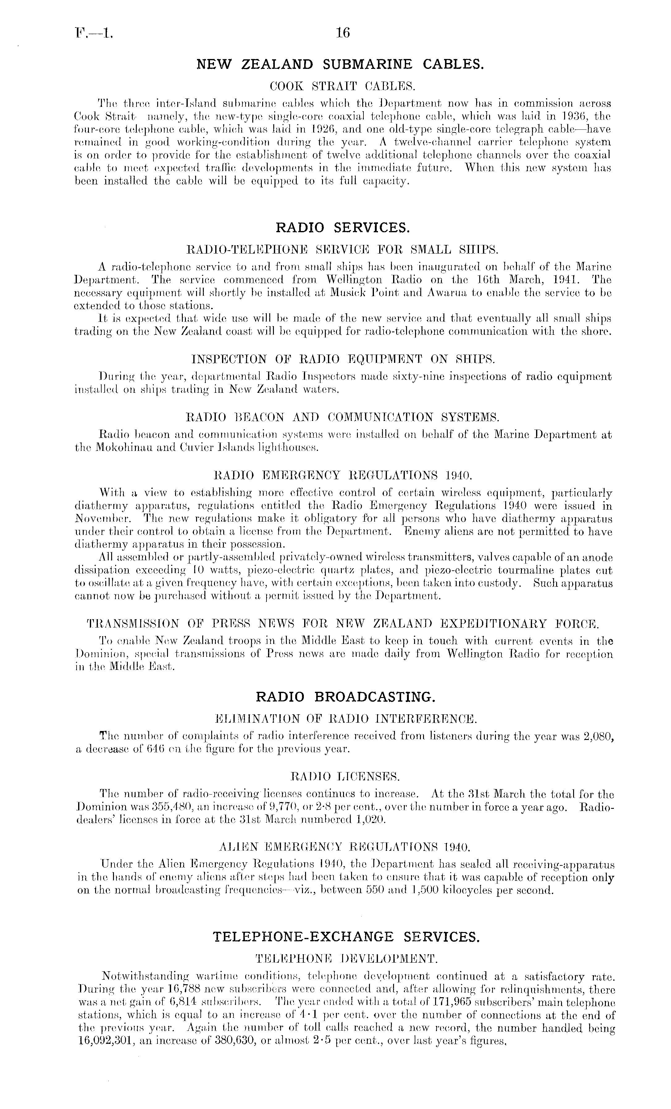NEW ZEALAND SUBMARINE CABLES. COOK STRAIT CABLES. The three inter-Island Submarine cables which the Department now has in commission across Cook Strait —namely, the new-type single-core coaxial telephone cable, which was laid in 1936, the four-core telephone cable, which was laid in 1926, and one old-type single-core telegraph cable —have remained in good working-condition during the year. A twelve-channel carrier telephone system is on order to provide for the establishment of twelve additional telephone channels over the coaxial cable to meet expected traffic developments in the immediate future. When this new system has been installed the cable will be equipped to its full capacity. RADIO SERVICES. RADIO-TELEPHONE SERVICE FOR SMALL SHIPS. A radio-telephone service to and from small ships has been inaugurated on behalf of the Marine Department. The service commenced from Wellington Radio on the 16th March, 1941. The necessary equipment will shortly be installed at Musick Point and Awarua to enable the service to be extended to those stations. It is expected that wide use will be made of the new service and that eventually all small ships trading on the New Zealand coast will be equipped for radio-telephone communication with the shore. INSPECTION OF RADIO EQUIPMENT ON SHIPS. During the year, departmental Radio Inspectors made sixty-nine inspections of radio equipment installed on ships trading in New Zealand waters. RADIO BEACON AND COMMUNICATION SYSTEMS. Radio beacon and communication systems were installed on behalf of the Marine Department at the Mokohinau and Cuvier Islands lighthouses. RADIO EMERGENCY REGULATIONS 1940. With a view to establishing more effective control of certain wireless equipment, particularly diathermy apparatus, regulations entitled the Radio Emergency Regulations 1940 were issued in November. The new regulations make it obligatory for all persons who have diathermy apparatus under their control to obtain a license from the Department. Enemy aliens are not permitted to have diathermy apparatus in their possession. All assembled or partly-assembled privately-owned wireless transmitters, valves capable of an anode dissipation exceeding 10 watts, piezo-electric quartz plates, and piezo-electric tourmaline plates cut to oscillate at a given frequency have, with certain exceptions, been taken into custody. Such apparatus cannot now be purchased without a permit issued by the Department. TRANSMISSION OF PRESS NEWS FOR NEW ZEALAND EXPEDITIONARY FORCE. To enable New Zealand troops in the Middle East to keep in touch with current events in the Dominion, special transmissions of Press news are made daily from Wellington Radio for reception in the Middle East. RADIO BROADCASTING. ELIMINATION OF RADIO INTERFERENCE. The number of complaints of radio interference received from listeners during the year was 2,080, a decrease of 646 on the figure for the previous year. RADIO LICENSES. The number of radio-receiving licenses continues to increase. At the 31st March the total for the Dominion was 355,480, an increase of 9,770, or 2-8 per cent., over the number in force a year ago. Radiodealers' licenses in force at the 31st March numbered 1,020. ALIEN EMERGENCY REGULATIONS 1940. Under the Alien Emergency Regulations 1940, the Department has sealed all receiving-apparatus in the hands of enemy aliens after steps had been taken to ensure that it was capable of reception only on the normal broadcasting frequencies —viz., between 550 and 1,500 kilocycles per second. TELEPHONE-EXCHANGE SERVICES. TELEPHONE DEVELOPMENT. Notwithstanding wartime conditions, telephone development continued at a satisfactory rate. During the year 16,788 new subscribers were connected and, after allowing for relinquishments, there was a net gain of 6,814 subscribers. The year ended with a total of 171,965 subscribers' main telephone stations, which is equal to an increase of 4-1 per cent, over the number of connections at the end of the previous year. Again the number of toll calls reached a new record, the number handled being 16,092,301, an increase of 380,630, or almost 2-5 per cent., over last year's figures,