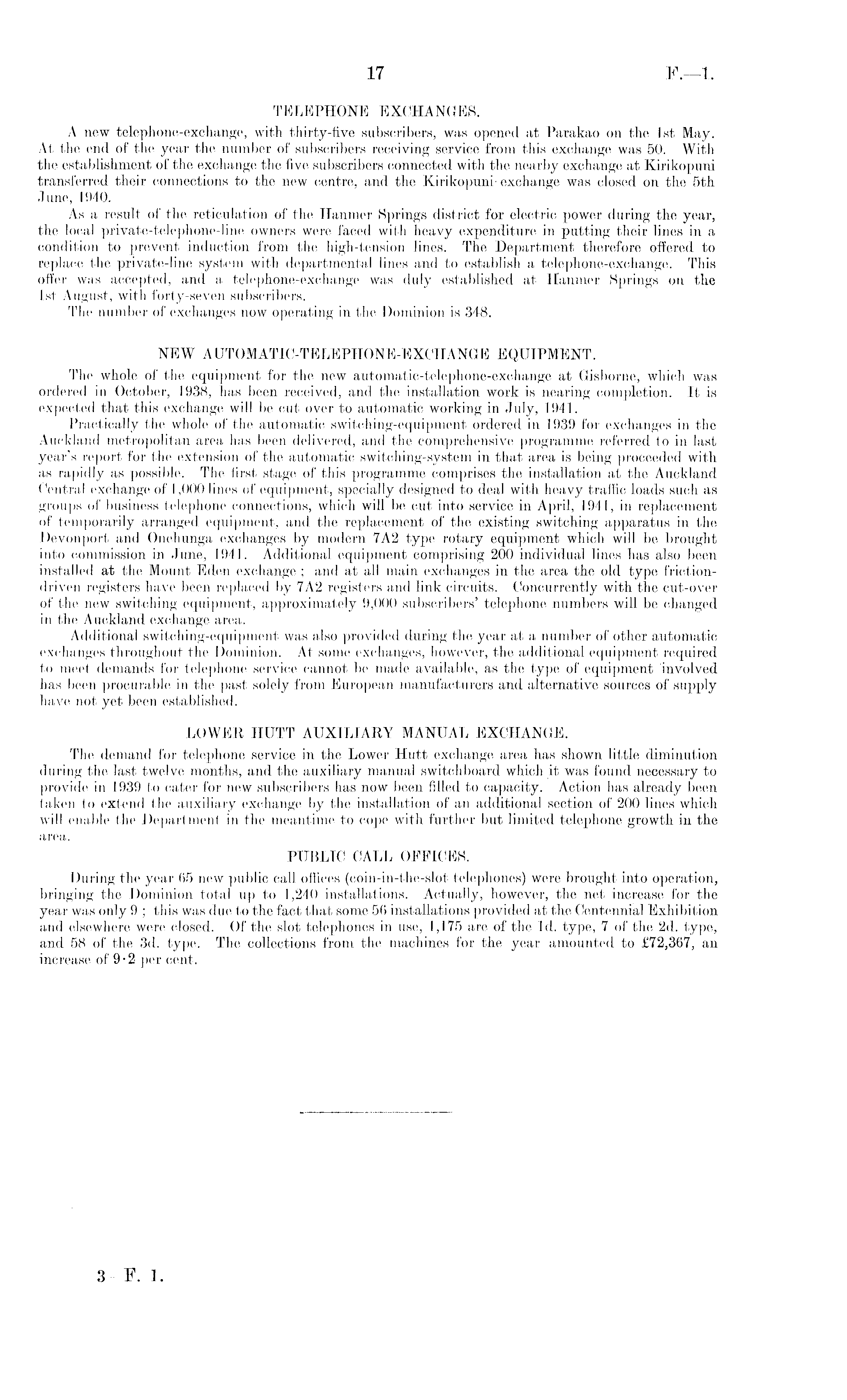 TELEPHONE EXCHANGES. A new telephone-exchange, with thirty-five subscribers, was opened at Parakao on the Ist May. At the end of the year the number of subscribers receiving service from this exchange was 50. With the establishment of the exchange the five subscribers connected with the nearby exchange at Kirikopuni transferred their connections to the new centre, and the Kirikopuni-exchange was closed on the sth June, 1940. As a result of the reticulation of the Hanmer Springs district for electric power during the year, the local private-telephone-line owners were faced with heavy expenditure in putting their lines in a condition to prevent induction from the high-tension lines. The Department therefore offered to replace the private-line system with departmental lines and to establish a telephone-exchange. This offer was accepted, and a telcphone-exchange was duly established at Hanmer Springs on the Ist August, with forty-seven subscribers. The number of exchanges now operating in the Dominion is 348. NEW AUTOMATIC-TELEPHONE-EXCHANGE EQUIPMENT. The whole of the equipment for the new automatic-telephone-exchange at Gisborne, which was ordered in October, 1938, has been received, and the installation work is nearing completion. It is expected that this exchange will be cut over to automatic working in July, 1941. Practically the whole of the automatic switching-equipment ordered in 1939 for exchanges in the Auckland metropolitan area has been delivered, and the comprehensive programme referred to in last year's report for the extension of the automatic switching-system in that area is being proceeded with as rapidly as possible. The first stage of this programme comprises the installation at the Auckland Central exchange of 1,000 lines of equipment, specially designed to deal with heavy traffic loads such as groups of business telephone connections, which will be cut into service in April, 1941, in replacement of temporarily arranged equipment, and the replacement of the existing switching apparatus in the Devonport and Onehunga exchanges by modern 7A2 type rotary equipment which will be brought into commission in June, 1941. Additional equipment comprising 200 individual lines has also been installed at the Mount Eden exchange ; and at all main exchanges in the area the old type frictiondriven registers have been replaced by 7A2 registers and link circuits. Concurrently with the cut-over of the new switching equipment, approximately 9,000 subscribers' telephone numbers will be changed in the Auckland exchange area. Additional switching-equipment was also provided during the year at a number of other automatic exchanges throughout the Dominion. At some exchanges, however, the additional equipment required to meet demands for telephone service cannot be made available, as the type of equipment involved has been procurable in the past solely from European manufacturers and alternative sources of supply have not yet been established. LOWER HUTT AUXILIARY MANUAL EXCHANGE. The demand for telephone service in the Lower Hutt exchange area has shown little diminution during the last twelve months, and the auxiliary manual switchboard which it was found necessary to provide in 1939 to cater for new subscribers has now been filled to capacity. Action has already been taken to extend the auxiliary exchange by the installation of an additional section of 200 lines which will enable the Department in the meantime to cope with further but limited telephone growth in the area. PUBLIC CALL OFFICES. During the year 65 new public call offices (coin-in-the-slot telephones) were brought into operation, bringing the Dominion total up to 1,240 installations. Actually, however, the net increase for the year was only 9 ; this was due to the fact that some 56 installations jirovided at the Centennial Exhibition and elsewhere were closed. Of the slot telephones in use, 1,175 are of the Id. type, 7of the 2d. type, and 58 of the 3d. type. The collections from the machines for the year amounted to £72,367, an increase of 9 • 2 per cent.