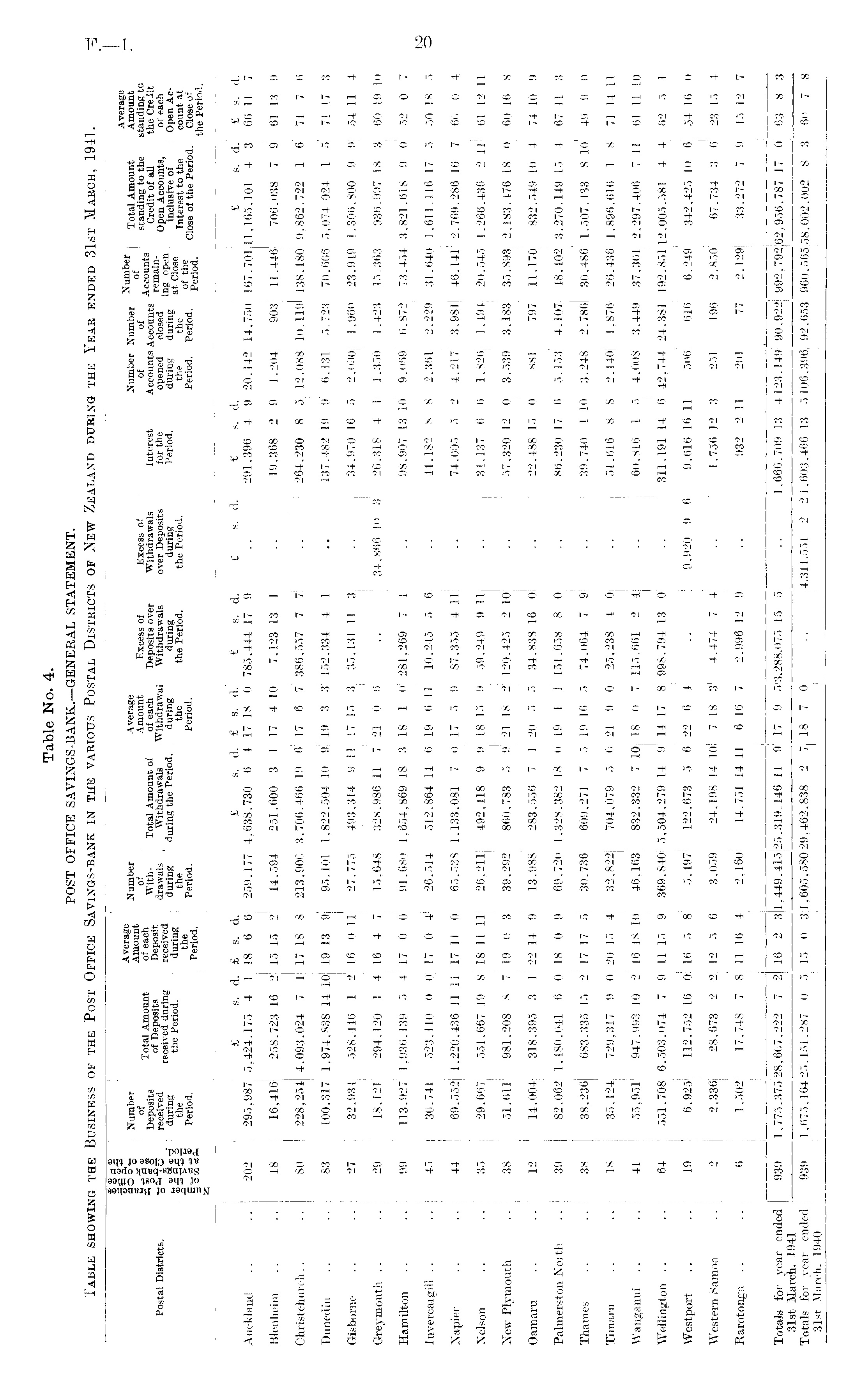 Table No. 4. POST OFFICE SAVINGS-BANK.— GENERAL STATEMENT. Table showing the Business of the Post Office Savings-bank in the various Postal Districts of New Zealand during the Year ended 31st March, 1941.