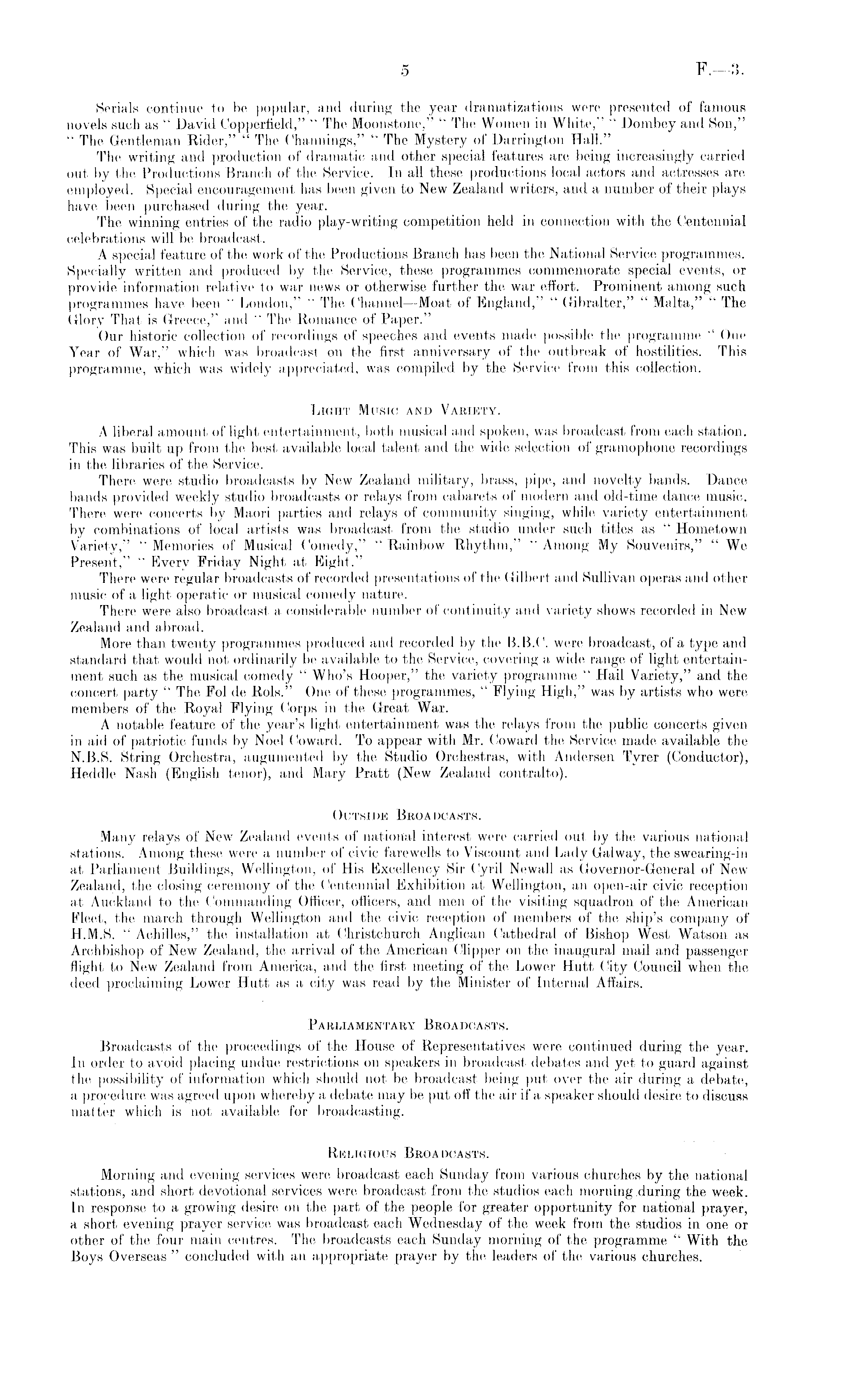 Serials continue to be popular, and during the year dramatizations were presented of famous novels such as " David Copperfield," " The Moonstone," " The Women in White," " Dombey and Son," " The Gentleman Rider," " The Channings," " The Mystery of Darrington Hall." The writing and production of dramatic and other special features are being increasingly carried out by the Productions Branch of the Service. In all these productions local actors and actresses are employed. Special encouragement has been given to New Zealand writers, and a number of their plays have been purchased during the year. The winning entries of the radio play-writing competition held in connection with the Centennial celebrations will be broadcast. A special feature of the work of the Productions Branch has been the National Service programmes. Specially written and produced by the Service, these programmes commemorate special events, or provide information relative to war news or otherwise further the war effort. Prominent among such programmes have been " London," " The Channel —Moat of England," " Gibralter," " Malta," " The Glory That is Greece," and " The Romance of Paper." Our historic collection of recordings of speeches and events made possible the programme " One Year of War," which was broadcast on the first anniversary of the outbreak of hostilities. This programme, which was widely appreciated, was compiled by the Service from this collection. Light Music and Variety. A liberal amount of light entertainment, both musical and spoken, was broadcast from each station. This was built up from the best available local talent and the wide selection of gramophone recordings in the libraries of the Service. There were studio broadcasts by New Zealand military, brass, pipe, and novelty bands. Dance bands provided weekly studio broadcasts or relays from cabarets of modern and old-time dance music. There were concerts by Maori parties and relays of community singing, while variety entertainment by combinations of local artists was broadcast from the studio under such titles as " Hometown Variety," " Memories of Musical Comedy," " Rainbow Rhythm," " Among My Souvenirs," " We Present," " Every Friday Night at Eight." There were regular broadcasts of recorded presentations of the Gilbert and Sullivan operas and other music of a light operatic or musical comedy nature. There were also broadcast a considerable number of continuity and variety shows recorded in New Zealand and abroad. More than twenty programmes produced and recorded by the 8.8.C. were broadcast, of a type and standard that would not ordinarily be available to the Service, covering a wide range of light entertainment such as the musical comedy " Who's Hooper," the variety programme " Hail Variety," and the concert party " The Fol de Rols." One of these programmes, " Flying High," was by artists who were members of the Royal Flying Corps in the Great War. A notable feature of the year's light entertainment was the relays from the public concerts given in aid of patriotic funds by Noel Coward, To appear with Mr. Coward the Service made available the N.B.S. String Orchestra, augumented by the Studio Orchestras, with Andersen Tyrer (Conductor), Heddle Nash (English tenor), and Mary Pratt (New Zealand contralto). Outside Broadcasts. Many relays of New Zealand events of national interest were carried out by the various national stations. Among these were a number of civic farewells to Viscount and Lady Galway, the swearing-in at Parliament Buildings, Wellington, of His Excellency Sir Cyril Newall as Governor-General of New Zealand, the closing ceremony of the Centennial Exhibition at Wellington, an open-air civic reception at Auckland to the Commanding Officer, officers, and men of the visiting squadron of the American Fleet, the march through Wellington and the civic reception of members of the ship's company of H.M.S. " Achilles," the installation at Christchurch Anglican Cathedral of Bishop West Watson as Archbishop of New Zealand, the arrival of the American Clipper on the inaugural mail and passenger flight to New Zealand from America, and the first meeting of the Lower Hutt City Council when the deed proclaiming Lower Hutt as a city was read by the Minister of Internal Affairs. Parliamentary Broadcasts. Broadcasts of the proceedings of the House of Representatives were continued during the year. In order to avoid placing undue restrictions 011 speakers in broadcast debates and yet to guard against the possibility of information which should not be broadcast being put over the air during a debate, a procedure was agreed upon whereby a debate may be put off the air if a speaker should desire to discuss matter which is not available for broadcasting. Religious Broadcasts. Morning and evening services were broadcast each Sunday from various churches by the national stations, and short devotional services were broadcast from the studios each morning .during the week. In response to a growing desire on the part of the people for greater opportunity for national prayer, a short evening prayer service was broadcast each Wednesday of the week from the studios in one or other of the four main centres. The broadcasts each Sunday morning of the programme " With the Boys Overseas " concluded with an appropriate prayer by the leaders of the various churches.