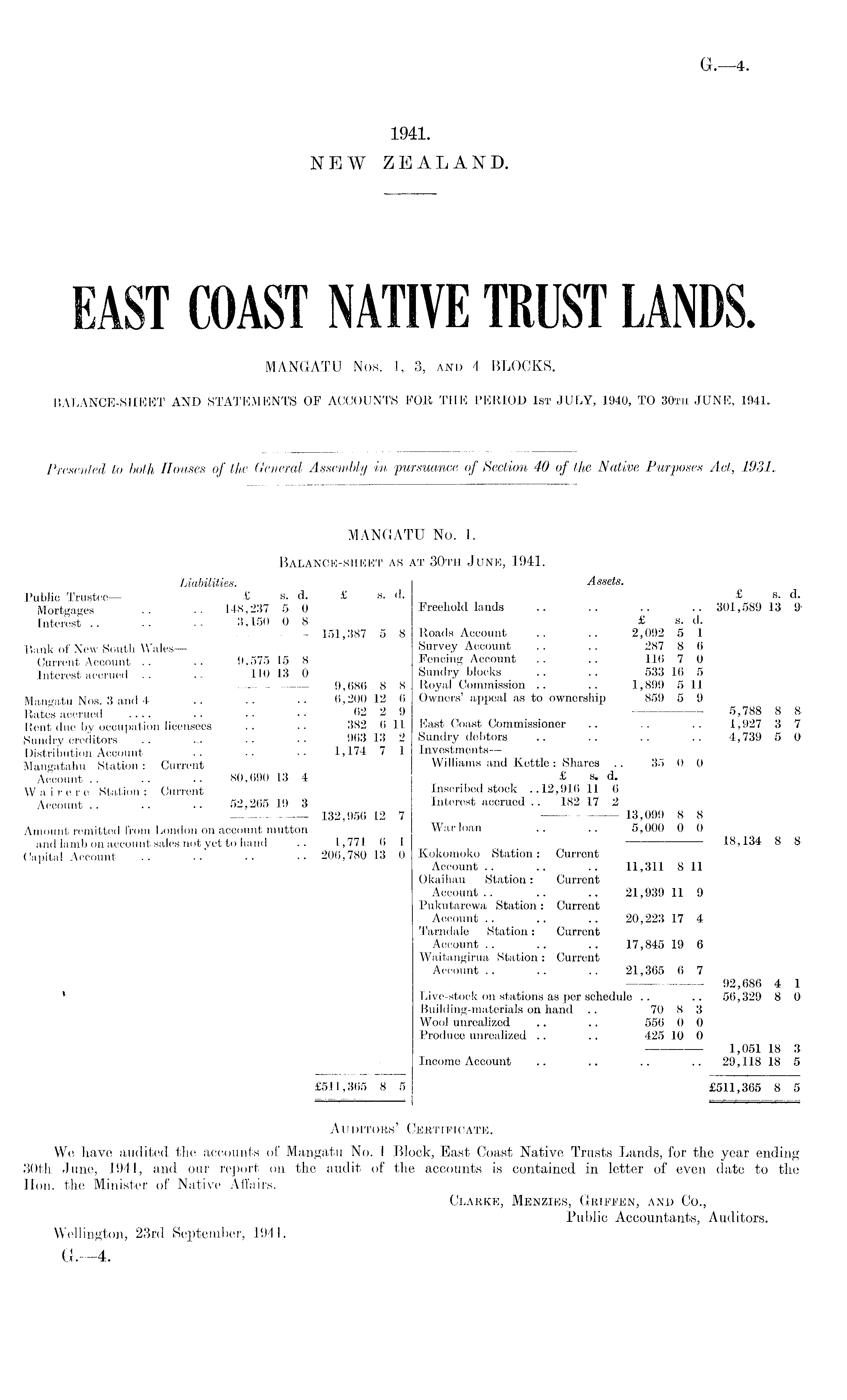 Auditors' Certificate. We have audited the accounts of Mangatu No. 1 Block, Bast Coast Native Trusts Lands, for the year ending 30th June, 1941, and our report on the audit of the accounts is contained in letter of even date to the Hon. the Minister of Native Affairs.