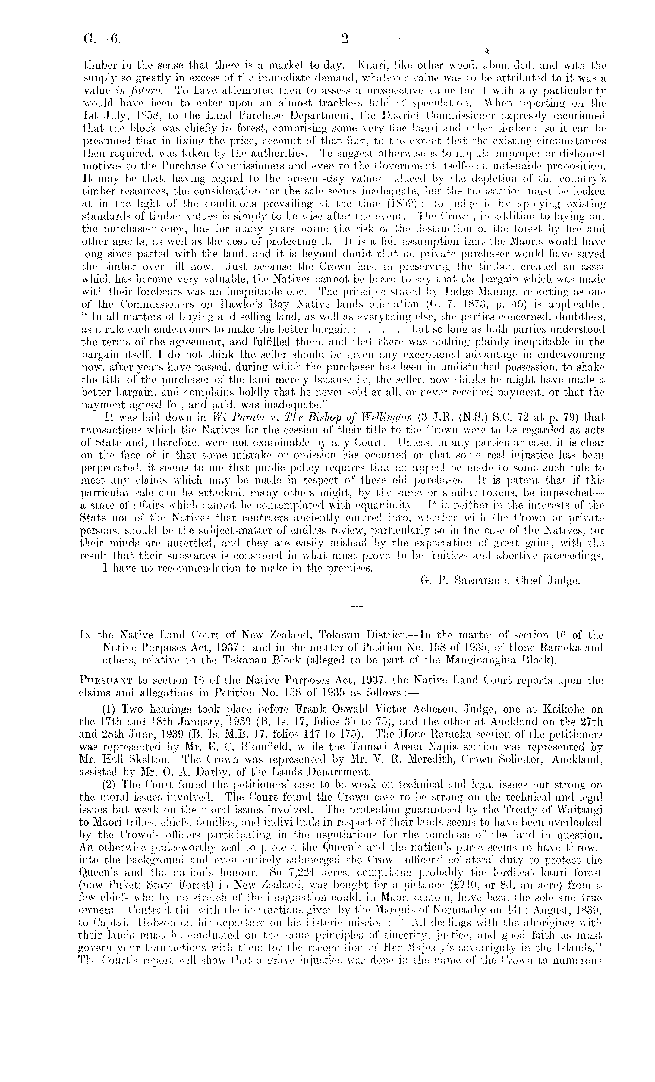 In the Native Land Court of New Zealand, Tokerau District. —In the matter of section 16 of the Native Purposes Act, 1937 ; and in the matter of Petition No. 158 of 1935, of Hone Rameka and others, relative to the Takapau Block (alleged to be part of the Manginangina Block). Pursuant to section 16 of the Native Purposes Act, 1937, the Native Land Court reports upon the claims and allegations in Petition No. 158 of 1935 as follows : — (1) Two hearings took place before Frank Oswald Victor Acheson, Judge, one at Kaikohe on the 17th and 18th January, 1939 (B. Is. 17, folios 35 to 75), and the other at Auckland on the '27th and 28th June, 1939 (B. Is. M.B. 17, folios 147 to 175). The Hone Rameka section of the petitioners was represented by Mr. E. C. Blomfield, while the Tamati Arena Napia section was represented by Mr. Hall Skelton. The Crown was represented by Mr. V. R. Meredith, Crown Solicitor, Auckland, assisted by Mr. 0. A. Darby, of the Lands Department. (2) The Court found the petitioners' case to be weak on technical and legal issues but strong on the moral issues involved. The Court found the Crown case to be strong on the technical and legal issues but weak on the moral issues involved. The protection guaranteed by the Treaty of Waitangi to Maori tribes, chiefs, families, and individuals in respect of their lands seems to have been overlooked by the Crown's officers participating in the negotiations for the purchase of the land in question. An otherwise praiseworthy zeal to protect the Queen's and the nation's purse seems to have thrown into the background and even entirely submerged the Crown officers' collateral duty to protect the Queen's and the nation's honour. So 7,224 acres, comprising probably the lordliest kauri forest (now Puketi State Forest) in New Zealand, was bought for a pittance (£240, or Bd. an acre) from a few chiefs who by no stretch of the imagination could, in Maori custom, have been the sole and true owners. Contrast this with the instructions given by the Marquis of Normanby on 14th August, 1839, to Captain Hobson on his departure on his historic mission : " All dealings with the aborigines with their lands must be conducted on the same principles of sincerity, justice, and good faith as must govern your transactions with them for the recognition of Her Majesty's sovereignty in the Islands." The Court's report will show that a grave injustice was done in the name of the Crown to numerous