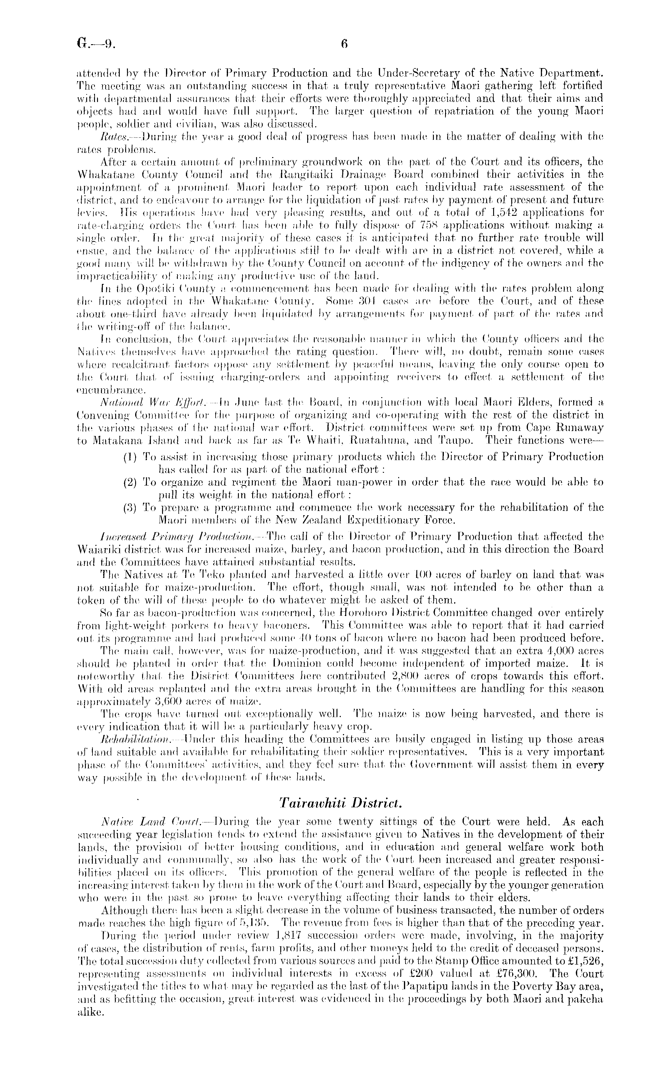 attended by the Director of Primary Production and the Under-Secretary of the Native Department. The meeting was an outstanding success in that a truly representative Maori gathering left fortified with departmental assurances that their efforts were thoroughly appreciated and that their aims and objects had and would have full support. The larger question of repatriation of the young Maori people, soldier and civilian, was also discussed. Rates. —During the year a good deal of progress has been made in the matter of dealing with the rates problems. After a certain amount of preliminary groundwork on the part of the Court and its officers, the Whakatane County Council and the Rangitaiki Drainage Board combined their activities in the appointment of a prominent Maori leader to report upon each individual rate assessment of the district, and to endeavour to arrange for the liquidation of past rates by payment of present and future levies. His operations have had very pleasing results, and out of a total of 1,542 applications for rate-charging orders the Court has been able to fully dispose of 758 applications without making a single order. In the great majority of these cases it is anticipated that no further rate trouble will ensue, and the balance of the applications still to be dealt with are in a district not covered, while a good many will be withdrawn by the County Council on account of the indigency of the owners and the impracticability of making any productive use of the land. In the Opotiki County a commencement has been made for dealing with the rates problem along the lines adopted in the Whakatane County. Some 304 cases are before the Court, and of these about one-third have already been liquidated by arrangements for payment of part of the rates and the writing-off of the balance. In conclusion, the Court appreciates the reasonable manner in which the County officers and the Natives themselves have approached the rating question. There will, no doubt, remain some cases where recalcitrant factors oppose any settlement by peaceful means, leaving the only course open to the Court that of issuing charging-orders and appointing receivers to effect a settlement of the encumbrance. National War Effort. —In June last the Board, in conjunction with local Maori Elders, formed a Convening Committee for the purpose of organizing and co-operating with the rest of the district in the various phases of the national war effort. District committees were set up from Cape Runaway to Matakana Island and back as far as Te Whaiti, Ruatahuna, and Taupo. Their functions were— (1) To assist in increasing those primary products which the Director of Primary Production has called for as part of the national effort: (2) To organize and regiment the Maori man-power in order that the race would be able to pull its weight in the national effort: (3) To prepare a programme and commence the work necessary for the rehabilitation of the Maori members of the New Zealand Expeditionary Force. Increased Primary Production.—The, call of the Director of Primary Production that affected the Waiariki district was for increased maize, barley, and bacon production, and in this direction the Board and the Committees have attained substantial results. The Natives at Te Teko planted and harvested a little over 100 acres of barley on land that was not suitable for maize-production. The effort, though small, was not intended to be other than a token of the will of these people to do whatever might be asked of them. So far as bacon-production was concerned, the Horohoro District Committee changed over entirely from light-weight porkers to heavy baconers. This Committee was able to report that it had carried out its programme and had produced some 40 tons of bacon where no bacon had been produced before. The main call, however, was for maize-production, and it was suggested that an extra 4,000 acres should be planted in order that the Dominion could become independent of imported maize. It is noteworthy that the District Committees here contributed 2,800 acres of crops towards this effort. With old areas replanted and the extra areas brought in the Committees are handling for this season approximately 3,600 acres of maize. The crops have turned out exceptionally well. The maize is now being harvested, and there is every indication that it will be a particularly heavy crop. Rehabilitation. —Under this heading the Committees are busily engaged in listing up those areas of land suitable and available for rehabilitating their soldier representatives. This is a very important phase of the Committees' activities, and they feel sure that the Government will assist them in every way possible in the development of these lands. Tairawhiti District. Native Land Court. —During the year some twenty sittings of the Court were held. As each succeeding year legislation tends to extend the assistance given to Natives in the development of their lands, the provision of better housing conditions, and in education and general welfare work both individually and communally, so also has the work of the Court been increased and greater responsibilities placed on its officers. This promotion of the general welfare of the people is reflected in the increasing interest taken by them in the work of the Court and Board, especially by the younger generation who were in the past so prone to leave everything affecting their lands to their elders. Although there has been a slight decrease in the volume of business transacted, the number of orders made reaches the high figure of 5,135. The revenue from fees is higher than that of the preceding year, During the period under review 1,817 succession orders were made, involving, in the majority of cases, the distribution of rents, farm profits, and other moneys held to the credit of deceased persons. The total succession duty collected from various sources and paid to the Stamp Office amounted to £1,5