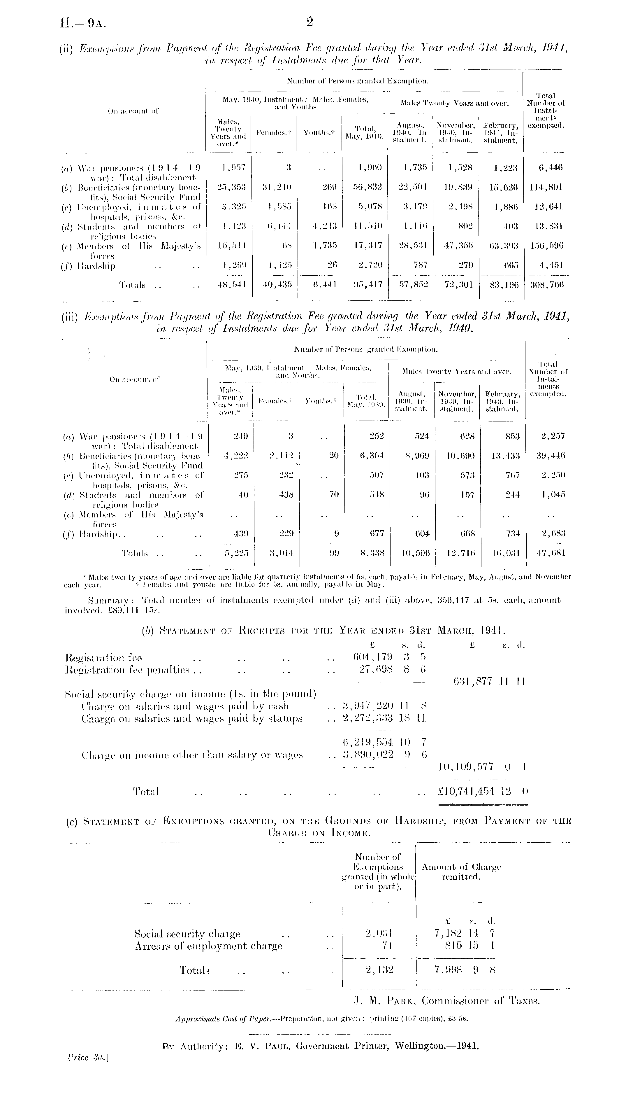 Summary : Total number of instalments exempted under (ii) and (iii) above, 356,447 at ss. each, amount involved, £89,111 15s. (b) Statement of Receipts for the Year ended 31st March, 1941. £ s. d. £ s. d. Registration fee .. .. .. .. 604,179 3 5 Registration fee penalties .. .. .. .. 27,698 8 6 —_ 631,877 II 11 Social security charge on income (Js. in the pound)- - Charge on salaries and wages paid by cash .. 3,947, 220 11 8 Charge on salaries and wages paid by stamps .. 2,272,333 18 11 6,219,554 10 7 Charge on income other than salary or wages .. 3,890,022 9 6 — 10,109,577 0 1 Total .. .. .. .. .. .. £10,741,454 12 0