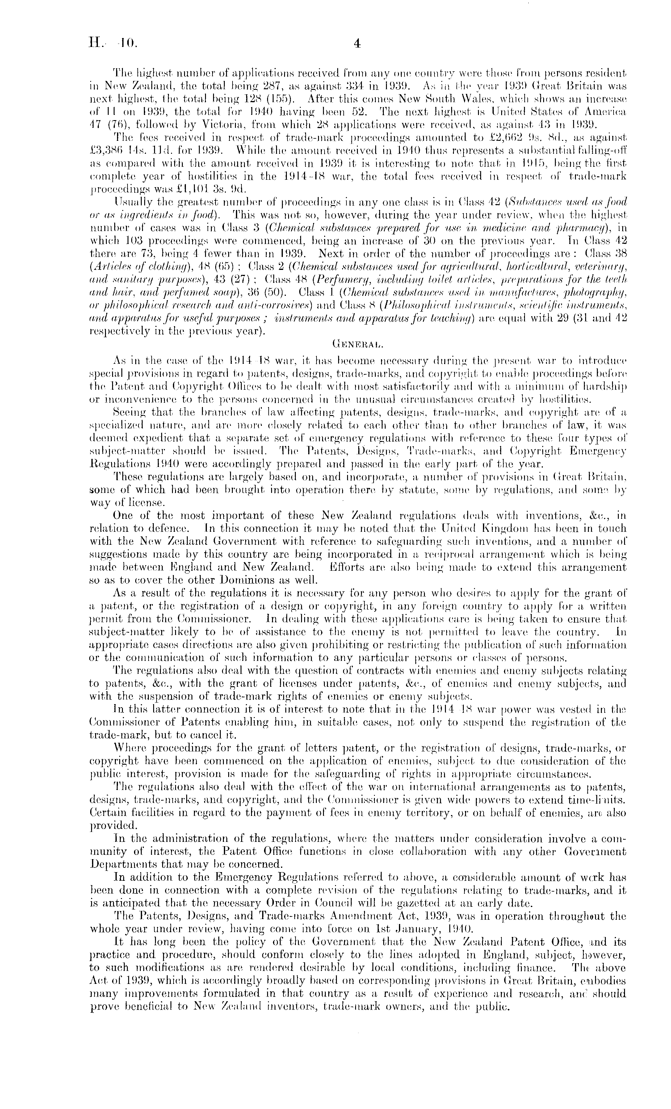 The highest number of applications received from any one country were those from persons resident in New Zealand, the total being 287, as against 334 in 1939. As in the year 1939 Great Britain was next highest, the total being 128 (155). After this comes New South Wales, which shows an increase of 11 on 1939, the total for 1940 having been 52. The next highest is United States of America 47 (76), followed by Victoria, from which 28 applications were received, as against 43 in 1939. The fees received in respect of trade-mark proceedings amounted to £2,662 9s. Bd., as against £3,386 14s. lid. for 1939. While the amount received in 1940 thus represents a substantial falling-off as compared with the amount received in 1939 it is interesting to note that in .1915, being the first complete year of hostilities in the 1914-18 war, the total fees received in respect of trade-mark proceedings was £1,101 3s. 9d. Usually the greatest number of proceedings in any one class is in Class 42 (Substances used as food or as ingredients in food). This was not so, however, during the year under review, when the highest number of cases was in Class 3 (Chemical substances prepared for use in medicine and pharmacy), in which 103 proceedings were commenced, being an increase of 30 on the previous year. In Class 42 there are 73, being 4 fewer than in 1939. Next in order of the number of proceedings are : Class 38 (Articles of clothing), 48 (65) ; Class 2 (Chemical substances used for agricultural, horticultural, veterinary, and sanitary -purposes), 43 (27) ; Class 48 (Perfumery, including toilet articles, preparations for the teeth and hair, and perfumed soap), 36 (50). Class 1 (Chemical substances used in manufactures, photography, or philosophical research and anti-corrosives) and Class 8 (Philosophical instruments, scientific instruments, and apparatus for useful purposes ; instruments and apparatus for teaching) are equal with 29 (31 and 42 respectively in the previous year). Genekal. As in the case of the 1914-18 war, it has become necessary during the present war to introduce special provisions in regard to patents, designs, trade-marks, and copyright to enable proceedings before the Patent and Copyright Offices to be dealt with most satisfactorily and with a minimum of hardship or inconvenience to the persons concerned in the unusual circumstances created by hostilities. Seeing that the branches of law affecting patents, designs, trade-marks, and copyright are of a specialized nature, and arc more closely related to each other than to other branches of law, it was deemed expedient that a separate set of emergency regulations with reference to these four typos of subject-matter should be issued. The Patents, Designs, Trade-marks, and Copyright Emergency Regulations 1940 were accordingly prepared and passed in the early part of the year. These regulations are largely based on, and incorporate, a number of provisions in Great Britain, some of which had been brought into operation there by statute, some by regulations, and some by way of license. One of the most important of these New Zealand regulations deals with inventions, &c„ in relation to defence. In this connection it may be noted that the United Kingdom has been in touch with the New Zealand Government with reference to safeguarding such inventions, and a number of suggestions made by this country are being incorporated in a reciprocal arrangement which is being made between England and New Zealand. Efforts are also being made to extend this arrangement so as to cover the other Dominions as well. As a result of the regulations it is necessary for any person who desires to apply for the grant of a patent, or the registration of a design or copyright, in any foreign country to apply for a written permit from the Commissioner. In dealing with these applications care is being taken to ensure that subject-matter likely to be of assistance to the enemy is not permitted to leave the country. In appropriate cases directions are also given prohibiting or restricting the publication of such information or the communication of such information to any particular persons or classes of persons. The regulations also deal with the question of contracts with enemies and enemy subjects relating to patents, &c., with the grant of licenses under patents, &c., of enemies and enemy subjects, and with the suspension of trade-mark rights of enemies or enemy subjects. In this latter connection it is of interest to note that in the 1914 -18 war power was vested in the Commissioner of Patents enabling him, in suitable cases, not only to suspend the registration, of tie trade-mark, but to cancel it. Where proceedings for the grant of letters patent, or the registration of designs, trade-marks, or copyright have been commenced on the application of enemies, subject to diie consideration of the public interest, provision is made for the safeguarding of rights in appropriate circumstances. The regulations also deal with the effect of the war on international arrangements as to patents, designs, trade-marks, and copyright, and the Commissioner is given wide powers to extend time-li:mts. Certain facilities in regard to the payment of fees in enemy territory, or on behalf of enemies, are also provided. In the administration of the regulations, where the matters under consideration involve a community of interest, the Patent Office functions in close collaboration with any other Government Departments that may be concerned. In addition to the Emergency Regulations referred to above, a considerable amount of wcrk has been done in connection with a complete revision of the regulations relating to trade-marks, and it is anticipated that the necessary Order in Council will be gazetted at an early date. The Patents, Designs, and Trade-marks Amendment Act, 1939, was in operation throughout the whole year under review, having come into force on Ist January, 1940. It has long been the pol