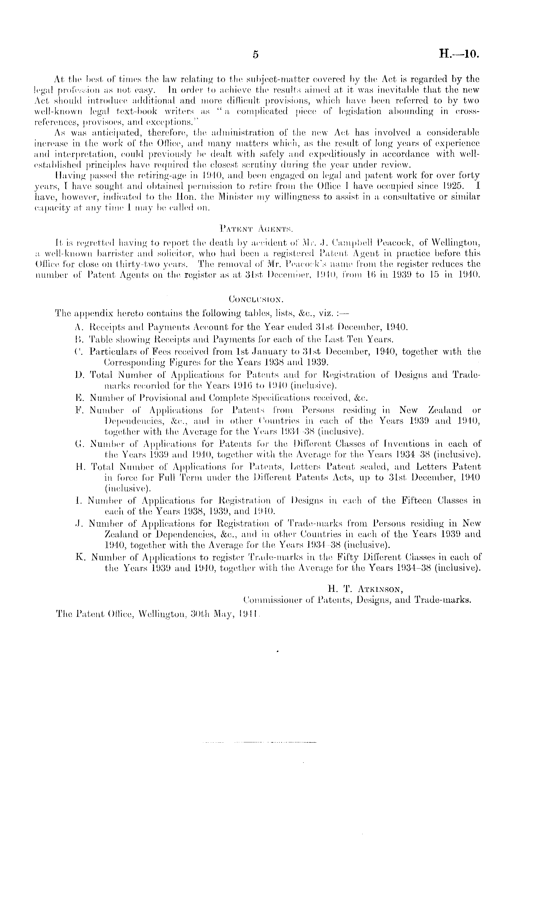 At the best of times the law relating to the subject-matter covered by the Act is regarded by the legal profession as not easy. In order to achieve the results aimed at it was inevitable that the new Act should introduce additional and more difficult provisions, which have been referred to by two well-known legal text-book writers as " a complicated piece of legislation abounding in crossreferences, provisoes, and exceptions." As was anticipated, therefore, the administration of the new Act has involved a considerable increase in the work of the Office, and many matters which, as the result of long years of experience and interpretation, could previously be dealt with safely and expeditiously in accordance with wellestablished principles have required the closest scrutiny during the year under review. Having passed the retiring-age in 1940, and been engaged on legal and patent work for over forty years, I have sought and obtained permission to retire from the Office I have occupicd since 1925. I have, however, indicated to the Hon. the Minister my willingness to assist in a consultative or similar capacity at any time I may be called on. Patent Agents. It is regretted having to report the death by accident of Mr. J. Campbell Peacock, of Wellington, a well-known barrister and solicitor, who had been a registered Patent Agent in practice before this Office for close on thirty-two years. The removal of Mr. Peacock's name from the register reduces the number of Patent Agents on the register as at 31st December, 1940, from 16 in 1939 to 15 in 1940. Conclusion. The appendix hereto contains the following tables, lists, &c., viz. : — A. Receipts and Payments Account for the Year ended 31st December, 1940. 15. Table showing Receipts and Payments for each of the Last Ten Years. C. Particulars of Fees received from Ist January to 31st December, 1940, together with the Corresponding Figures for the Years 1938 and 1939. D. Total Number of Applications for Patents and for Registration of Designs and Trademarks recorded for the Years 1916 to 1940 (inclusive). E. Number of Provisional and Complete Specifications received, &c. F. Number of Applications for Patents from Persons residing in New Zealand or Dependencies, &c., and in other Countries in each of the Years 1939 and 1940, together with the Average for the Years 1934-38 (inclusive). G. Number of Applications for Patents for the Different Classes of Inventions in each of the Years 1939 and 1940, together with the Average for the Years 1934-38 (inclusive). H. Total Number of Applications for Patents, Letters Patent sealed, and Letters Patent in force for Full Term under the Different Patents Acts, up to 31st December, 1940 (inclusive). I. Number of Applications for Registration of Designs in each of the Fifteen Classes in each of the Years 1938, 1939, and 1940. J. Number of Applications for Registration of Trade-marks from Persons residing in New Zealand or Dependencies, &c., and in other Countries in each of the Years 1939 and 1940, together with the Average for the Years 1934-38 (inclusive). K. Number of Applications to register Trade-marks in the Fifty Different Classes in each of the Years 1939 and 1940, together with the Average for the Years 1934-38 (inclusive). H. T. Atkinson, Commissioner of Patents, Designs, and Trade-marks. The Patent Office, Wellington, 30th May, 1941.