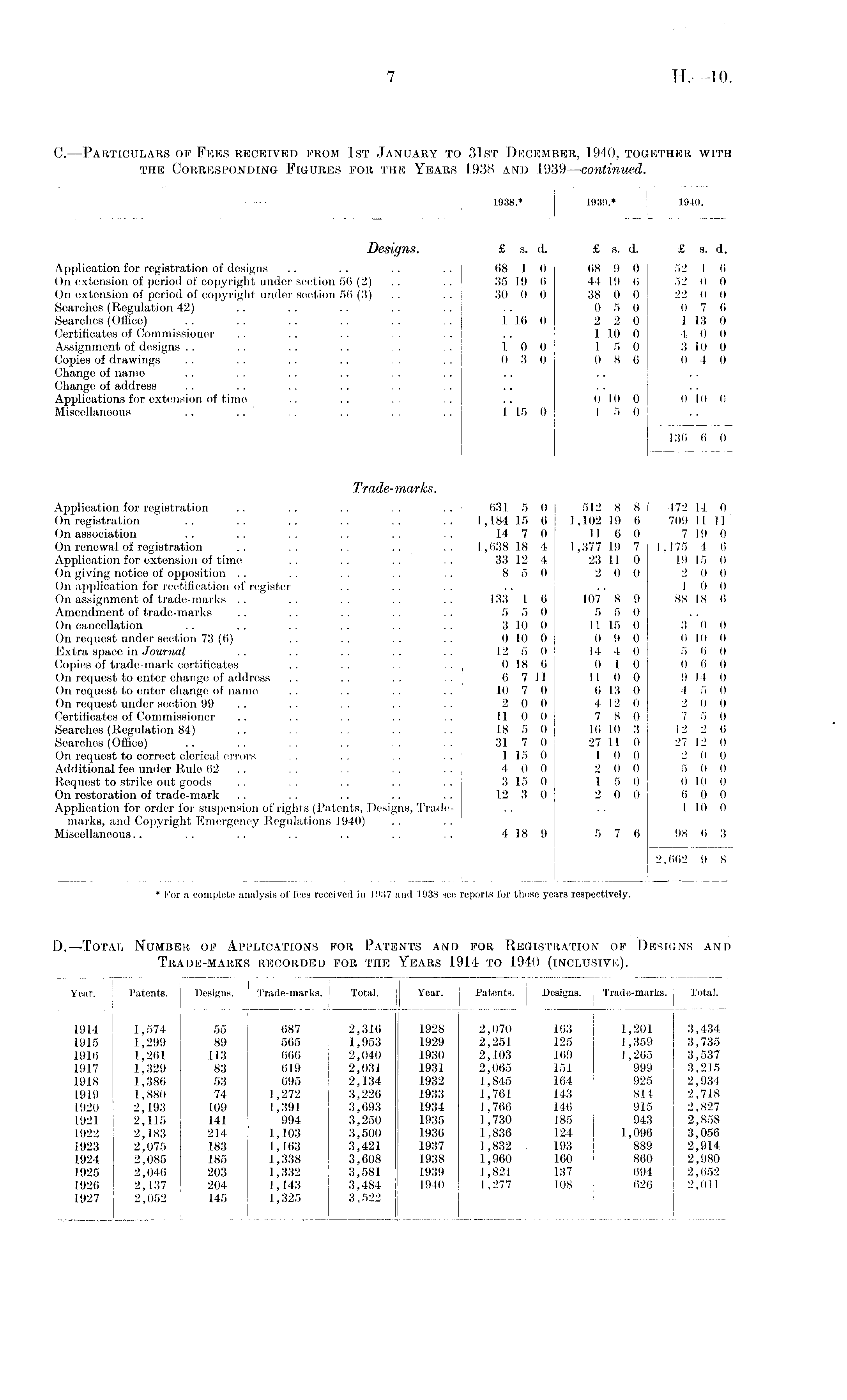 D.—Total Number of Applications for Patents and for Registration of Designs and Trade-marks recorded for the Years 1914 to 1940 (inclusive).