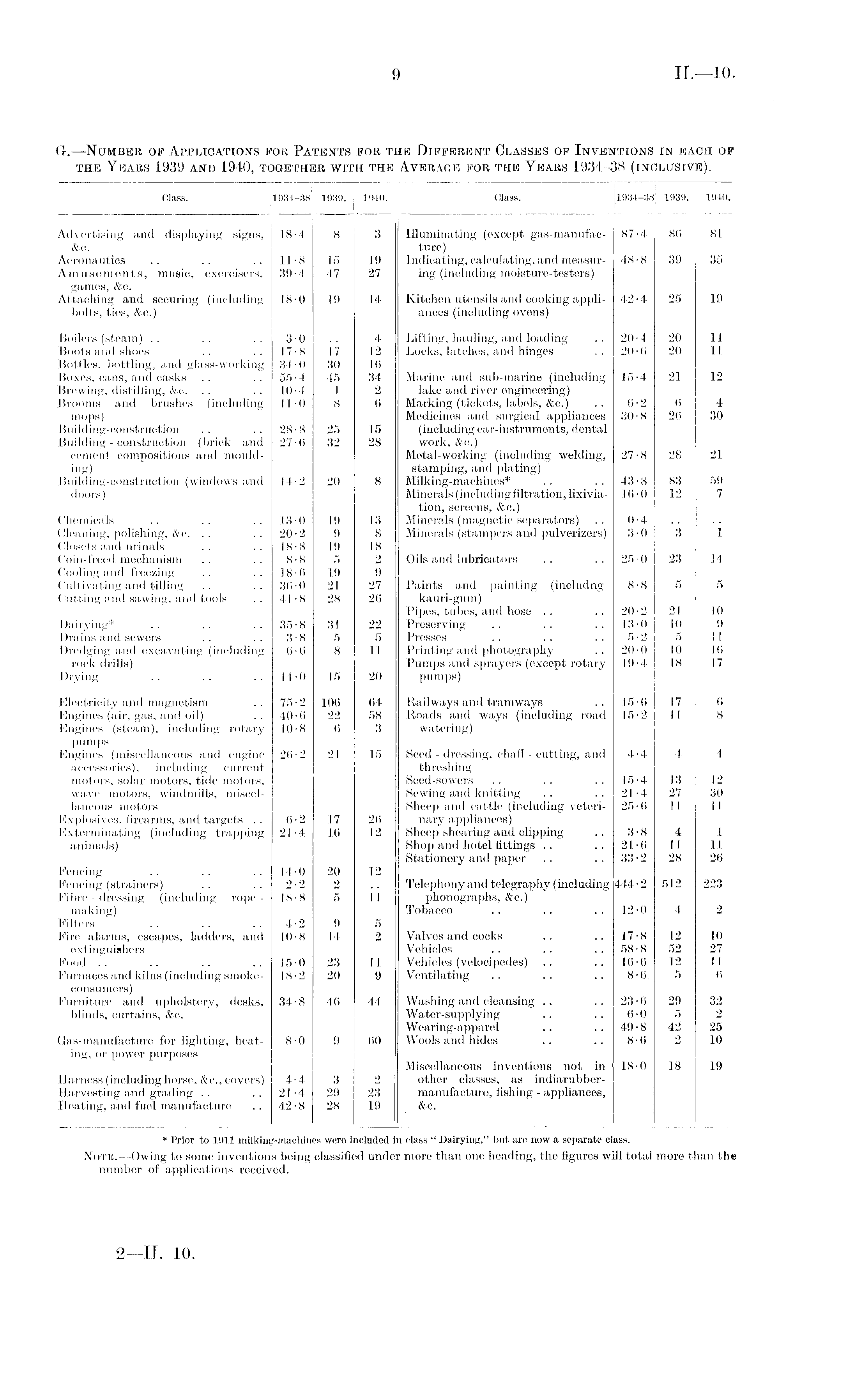G. —Number of Applications for Patents for the Different Classes of Inventions in each of the Years 1939 and 1940, together with the Average for the Years 1931-38 (inclusive).