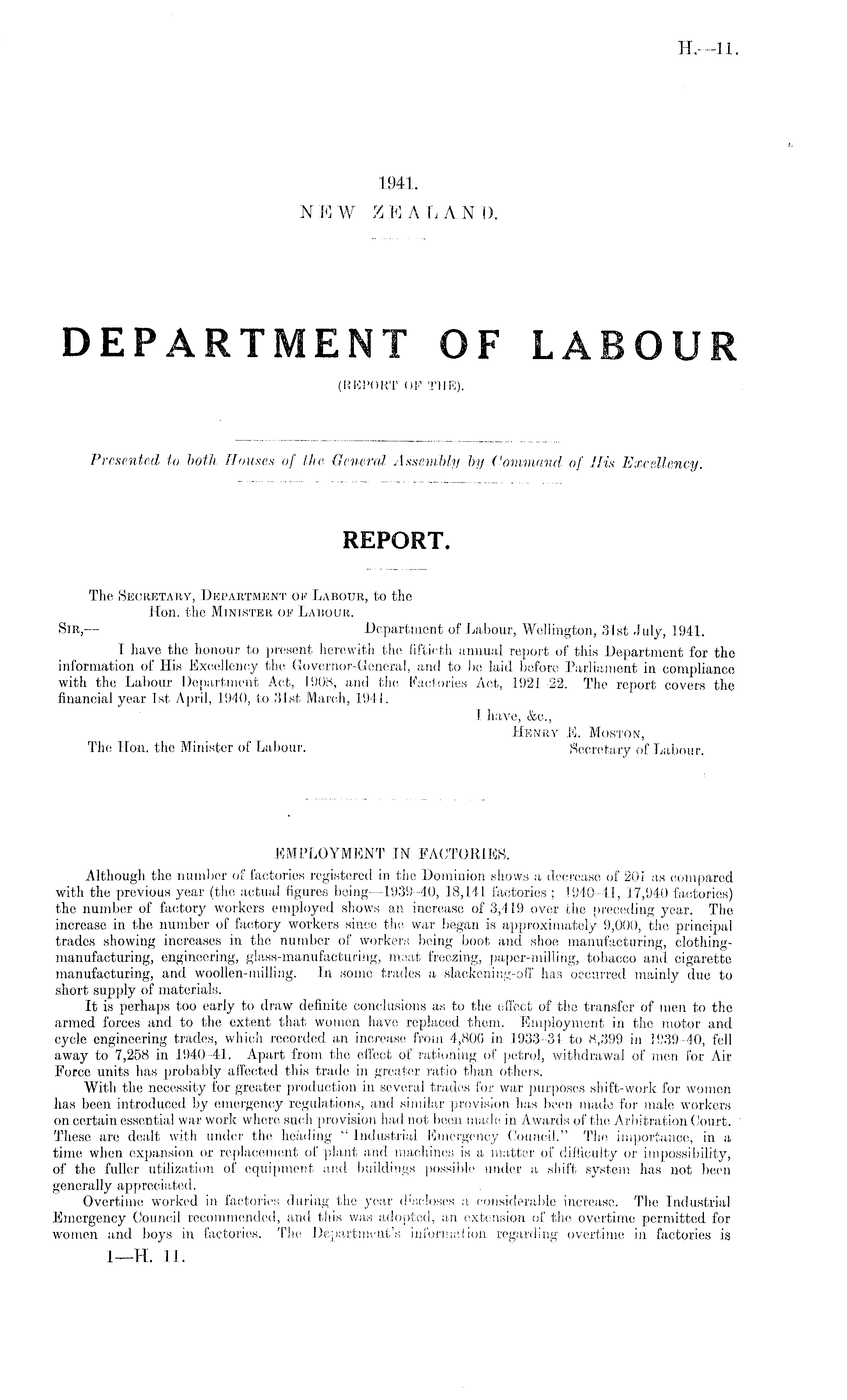 The Secretary, Department op Labour, to the Hon. the Minister op Labour. Sir,— Department of Labour, Wellington, 31st July, 194-1. I have the honour to present herewith the fiftieth annual report of this Department for the information of His Excellency the Governor-General, and to be laid before Parliament in compliance with the Labour Department Act, 1908, and the Factories Act, 1921-22. The report covers the financial year Ist April, 1940, to 31st March, 1941. I have, &c., Henry E. Moston, The Hon. the Minister of Labour. Secretary of Labour.