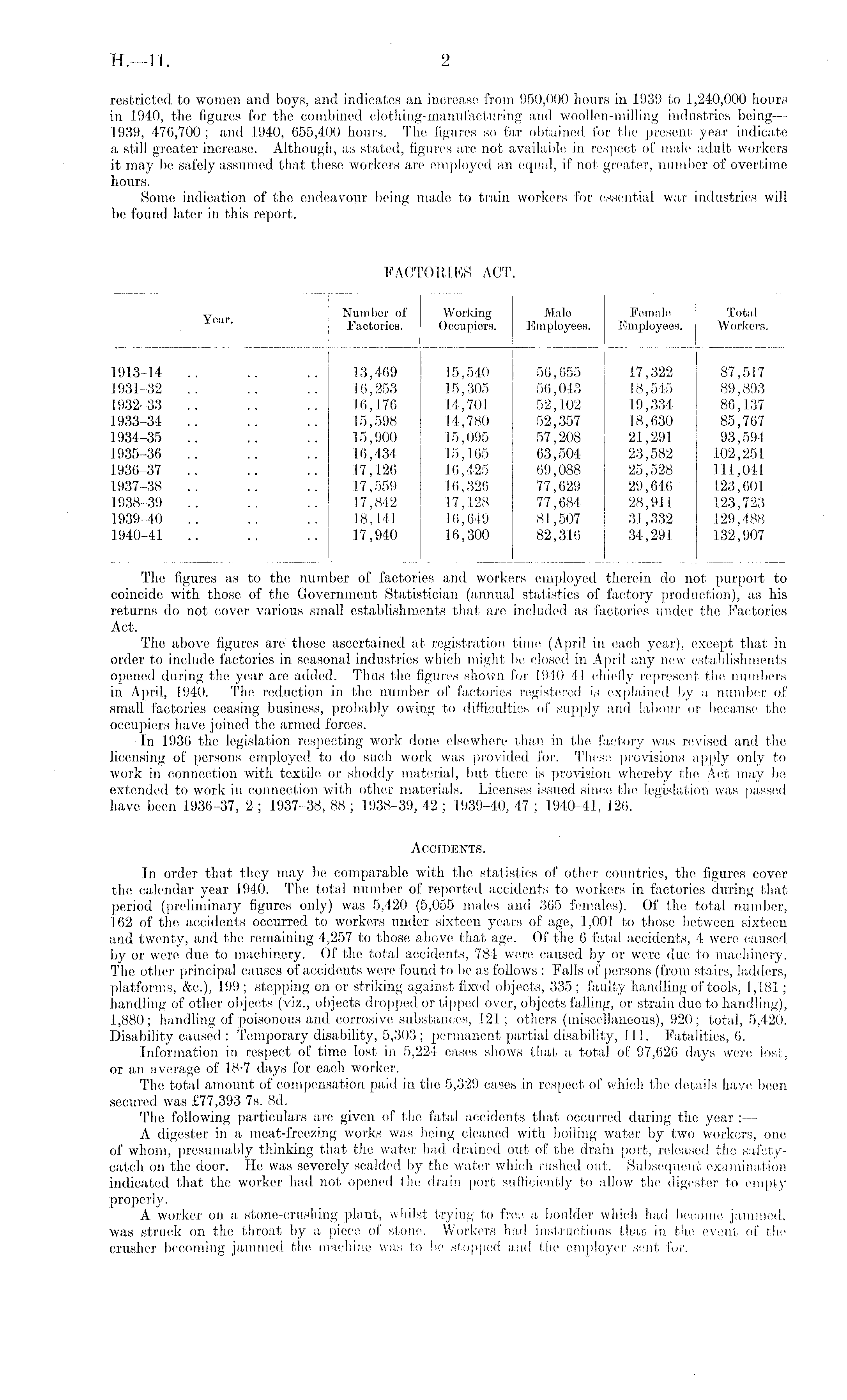 The figures as to the number of factories and workers employed therein do not purport to coincide with those of the Government Statistician (annual statistics of factory production), as his returns do not cover various small establishments that are included as factories under the Factories Act. The above figures are those ascertained at registration time (April in each year), except that in order to include factories in seasonal industries which might be closed in April any new establishments opened during the year are added. Thus the figures shown for 1940-41 chiefly represent the numbers in April, 1940. The reduction in the number of factories registered is explained by a number of small factories ceasing business, probably owing to difficulties of supply and labour or because the occupiers have joined the armed forces. In 1936 the legislation respecting work done elsewhere than in the factory was revised and the licensing of persons employed to do such work was provided for. These provisions apply only to work in connection with textile or shoddy material, but there is provision whereby the Act may be extended to work in connection with other materials. Licenses issued since the legislation was passed have been 1936-37, 2 ; 1937-38, 88 ; 1938-39, 42 ; 1939-40, 47 ; 1940-41, 126. Accidents. In order that they may be comparable with the statistics of other countries, the figures cover the calendar year 1940. The total number of reported accidents to workers in factories during that period (preliminary figures only) was 5,420 (5,055 males and 365 females). Of the total number, 162 of the accidents occurred to workers under sixteen years of age, 1,001 to those between sixteen and twenty, and the remaining 4,257 to those above that age. Of the 6 fatal accidents, 4 were caused by or were due to machinery. Of the total accidents, 784 were caused by or were due to machinery. The other principal causes of accidents were found to be as follows : Falls of persons (from stairs, ladders, platforms, &c.), 199 ; stepping on or striking against fixed objects, 335 ; faulty handling of tools, 1,181; handling of other objects (viz., objects dropped or tipped over, objects falling, or strain due to handling), 1,880; handling of poisonous and corrosive substances, 121; others (miscellaneous), 920; total, 5,420. Disability caused: Temporary disability, 5,303; permanent partial disability, 111. Fatalities, 6. Information in respect of time lost in 5,224 cases shows that a total of 97,626 days were lost, or an average of 18-7 days for each worker. The total amount of compensation paid in the 5,329 cases in respect of which the details have been secured was £77,393 7s. Bd. The following particulars are given of the fatal accidents that occurred during the year : — A digester in a meat-freezing works was being cleaned with boiling water by two workers, one of whom, presumably thinking that the water had drained out of the drain port, released the safetycatch on the door. He was severely scalded by the water which rushed out. Subsequent examination indicated that the worker had not opened the drain port sufficiently to allow the digester to empty properly. A worker on a stone-crushing plant, whilst trying to free a boulder which had become jammed, was struck on the throat by a piece of stone. Workers had instructions that in the event of the crusher becoming jammed the machine was to bo stopped and the employer sent for.