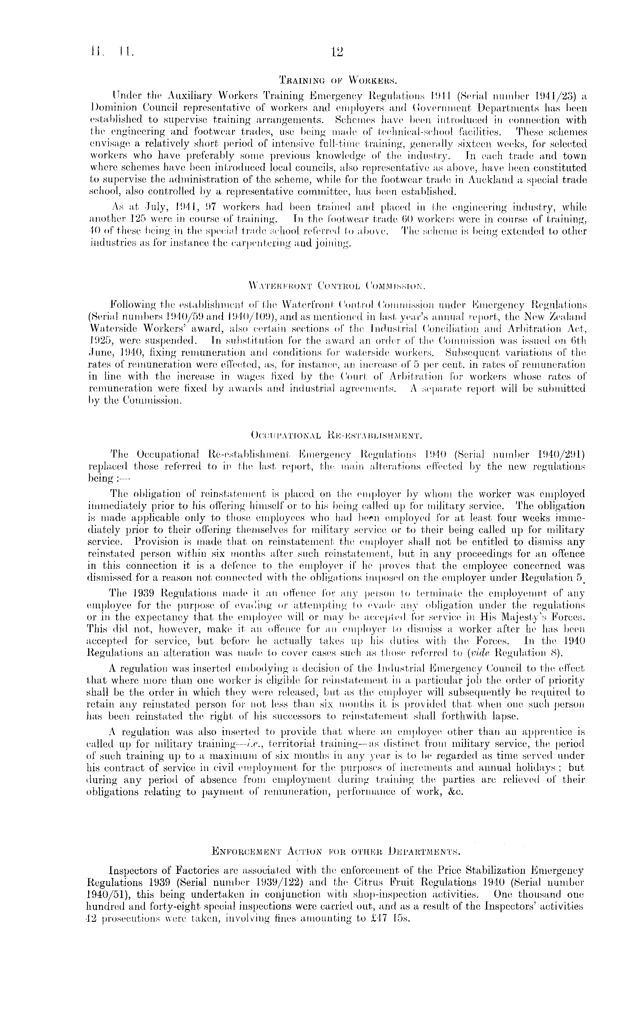 Training of Workers. Under the Auxiliary Workers Training Emergency Regulations 1941 (Serial number 1941/23) a Dominion Council representative of workers arj.fi employers and Government Departments has been established to supervise training arrangements. Schemes have been introduced in connection with the engineering and footwear trades, use being made of technical-school facilities. These schemes envisage a relatively short period of intensive full-time training, generally sixteen weeks, for selected workers who have preferably some previous knowledge of the industry. In each trade and town where schemes have been introduced local councils, also representative as above, have been constituted to supervise the administration of the scheme, while for the footwear trade in Auckland a special trade school, also controlled by a representative committee, has been established. As at July, 1941, 97 workers had been trained and placed in the engineering industry, while another 125 were in course of training. In the footwear trade 60 workers were in course of training, 40 of these being in the special trade school referred to above. The scheme is being extended to other industries as for instance the carpentering and joining. Waterfront Control Commission. * Following the establishment of the Waterfront Control Commission under Emergency Regulations (Serial numbers 1940/59 and 1940/109), and as mentioned in last year's annual report, the New Zealand Waterside Workers' award, also certain sections of the Industrial Conciliation and Arbitration Act, 1925, were suspended. In substitution for the award an order of the Commission was issued on 6th June, 1940, fixing remuneration and conditions for waterside workers. Subsequent variations of the rates of remuneration were effected, as, for instance, an increase of 5 per cent, in rates of remuneration in line with the increase in wages fixed by the Court of. Arbitration for workers whose rates of remuneration were fixed by awards and industrial agreements. A separate report will be submitted by the Commission. Occupational Re-establishment. The Occupational Re-establishment Emergency Regulations 1940 (Serial number 1940/291) replaced those referred to in the last report, the main alterations effected by the new regulations being : — The obligation of reinstatement is placed on the employer by whom the worker was employed immediately prior to his offering himself or to his being called up for military service. The obligation is made applicable only to those employees who had been employed for at least four weeks immediately prior to their offering themselves for military service or to their being called up for military service. Provision is made that on reinstatement the employer shall not be entitled to dismiss any reinstated person within six months after such reinstatement, but in any proceedings for an offence in this connection it is a defence, to the employer if he proves that the employee concerned was dismissed for a reason not connected with the obligations imposed on the employer under Regulation 5_ The 1939 Regulations made it an offence for any person to terminate the employemnt of any employee for the purpose of evading or attempting to evade any obligation under the regulations or in the expectancy that the employee will or may be accepted for service in His Majesty's Forces. This did not, however, make it ail offence for an employer" to dismiss a worker after he has been accepted for service, but before he actually takes up his duties with the Forces. In the 1940 Regulations an alteration was made to cover cases such as those referred to (vide Regulation 8). A regulation was inserted embodying a decision of the Industrial Emergency Council to the effect that where more than one worker is eligible for reinstatement in a particular job the order of priority shall be the order in which they were released, but as the employer will subsequently be required to retain any reinstated person for not less than six months it is provided that when one such person has been reinstated the right of his successors to reinstatement shall forthwith lapse. A regulation was also inserted to provide that where an employee other than an apprentice is called up for military training—i.e., territorial training—as distinct from military service, the period of such training up to a maximum of six months in any year is to be regarded as time served under his contract of service in civil employment for the purposes of increments and annual holidays ; but during any period of absence from employment during training the parties are relieved of their obligations relating to payment of remuneration, performance of work, &c. Enforcement Action for other Departments. Inspectors of Factories are associated with the enforcement of the Price Stabilization Emergency Regulations 1939 (Serial number 1939/122) and the Citrus Fruit Regulations 1940 (Serial number 1940/51), this being undertaken in conjunction with shop-inspection activities. One thousand one hundred and forty-eight special inspections were carried out, and as a result of the Inspectors' activities 42 prosecutions were taken, involving fines amounting to £47 15s.