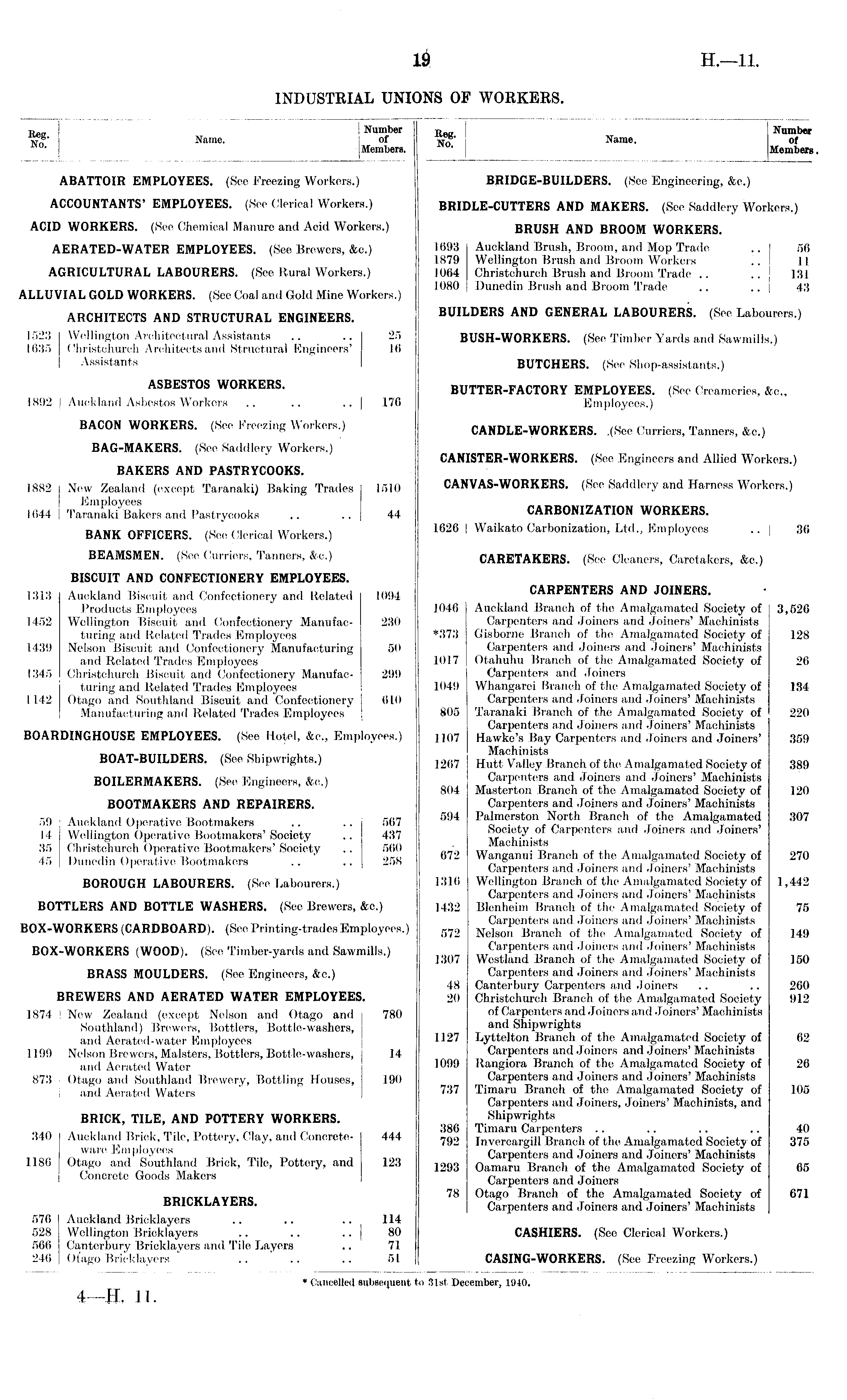 u„„ I Number t, | Number *£?" Name- I of No Name. of ™°- Members. ,0, j Members. ABATTOIR EMPLOYEES. (See Freezing Workers.) BRIDGE-BUILDERS. (See Engineering, &c.) ACCOUNTANTS' EMPLOYEES. (See Clerical Workers.) BRIDLE-CUTTERS AND MAKERS. (See Saddlery Workers.) ACID WORKERS. (See Chemical Manure and Acid Workers.) BRUSH AND BROOM WORKERS. AERATED-WATER EMPLOYEES. (See Brewers, &c.) '693 Auckland Brush, Broom, and Mop Trade ..I 56 1879 Wellington Brush and Broom Workers .. ! I I AGRICULTURAL LABOURERS. (See Rural Workers.) 1064 Christchureh Brush and Broom Trade .. ..J 131 , Dunedin Brush and Broom Trade .. .. 43 ALLUVIAL GOLD WORKERS. (See Coal and Gold Mine Workers.) ARCHITECTS AND STRUCTURAL ENGINEERS. BUILDERS AND GENERAL LABOURERS. (See Labourers.) 1523 Wellington Architectural Assistants .. .. 25 BUSH-WORKERS. (See Timber Yards and Sawmills.) 1635 Christchurch Architects and Structural Engineers' 16 Assistants BUTCHERS. (See Shop-assistants.) ASBESTOS WORKERS. BUTTER-FACTORY EMPLOYEES. (See Creameries, &c., 1892 [ Auckland Asbestos Workers .. .. .. J .176 Employees.) BACON WORKERS. (See Freezing Workers.) CANDLE-WORKERS. .(See Curriers, Tanners, &c.) BAG-MAKERS. (See Saddlery Workers.) CANISTER-WORKERS. (See Engineers and Allied Workers.) BAKERS AND PASTRYCOOKS. 1882 New Zealand (except Taranaki) Baking Trades 1510 CANVAS-WORKERS. (See Saddlery and Harness Workers.) 1644 Taranaki Bakers and Pastrycooks .. .. 44 CARBONIZATION WORKERS. BANK OFFICERS. (See Clerical Workers.) 1626 1 Waikato Carbonization, Ltd., Employees .. | 36 BEAMSMEN. (See Curriers, Tanners, &c.j CARETAKERS. (See Cleaners, Caretakers, &c.) BISCUIT AND CONFECTIONERY EMPLOYEES. 1313 Auckland Biscuit and Confectionery and Related 1094 CARPENTERS AND JOINERS. Products Employees 1046 Auckland Branch of the Amalgamated Society of 3,526 1452 Wellington Biscuit and Confectionery Manufac- 230 Carpenters and Joiners and Joiners' Machinists turing and Related Trades Employees *.373 Gisborne Branch of the Amalgamated Society of 128 1439 Nelson Biscuit and Confectionery Manufacturing 50 Carpenters and Joiners and Joiners' Machinists and Related Trades Employees 1017 Otahuhu Branch of the Amalgamated Society of 26 1345 Christchureh Biscuit and Confectionery Manufac- 299 Carpenters and Joiners turing and Related Trades Employees 1049 Whangarei Branch of the Amalgamated Society of 134 1142 Otago and Southland Biscuit and Confectionery 610 Carpenters and Joiners and Joiners'Machinists Manufacturing and Related Trades Employees 805 Taranaki Branch of the Amalgamated Society of 220 Carpenters and Joiners and Joiners' Machinists BOARDINGHOUSE EMPLOYEES. (See Hotel, &c., Employees.) 1107 Hawke's Bay Carpenters and Joiners and Joiners' 359 Machinists BOAT-BUILDERS. (See Shipwrights.) 1267 Hutt Valley Branch of the Amalgamated Society of 389 BOILERMAKERS. (See Engineers, &c.) ' Carpenters and Joiners and Joiners'Machinists 804 Masterton Branch ot the Amalgamated Society of 120 BOOTMAKERS AND REPAIRERS. Carpenters and Joiners and Joiners' Machinists 59 Auckland Operative Bootmakers .. .. 567 594 Palmerston North Branch of the Amalgamated 307 14 Wellington Operative Bootmakers' Society .. 437 Carpenters and Jo.ners and Joiners 35 Christchurch Operative Bootmakers' Society .. 560 ■ ac in ! a .j , , , , . , „ . . 45 Dunedin Operative Bootmakers .. .. 258 672 Wanganm Branch of the Amalgamated Society of 270 Carpenters and J oiners and »J oiners Machinists BOROUGH LABOURERS. (See Labourers.) 1316 Wellington Branch of the Amalgamated Society of 1,442 Carpenters and Joiners and Joiners' Machinists BOTTLERS AND BOTTLE WASHERS. (See Brewers, &c.) 1432 Blenheim Branch of the Amalgamated Society of 75 ,o . . Carpenters and Joiners and Joiners'Machinists BOX-WORKERS (CARDBOARD). (See Printing-trades Employees.) 572 Nelson Branch of the Amalgamated Society of 149 BOX-WORKERS (WOOD). (See Timber-yards and Sawmills.) , OA „ Carpeatws and Joiners and Joiners' Machinists J 1307 Westland Branch of the Amalgamated Society of 150 BRASS MOULDERS. (See Engineers, &c.) Carpenters and Joiners and Joiners' Machinists 48 Canterbury Carpenters and Joiners .. .. 260 BREWERS AND AERATED WATER EMPLOYEES. 20 Christchurch Branch of the Amalgamated Society 912 1874 ! New Zealand (except Nelson and Otago and 780 of Carpenters and Joiners and Joiners'Machinists Southland) Brewers, Bottlers, Bottle-washers, an( l Shipwrights and Aerated-water Employees H 27 Lyttelton Branch of the Amalgamated Society of 62 1199 Nelson Brewers, Malsters, Bottlers, Bottle-washers, 14 Carpenters and Joiners and .Joiners Machinists and Aerated Water 1099 Rangiora Branch of the Amalgamated Society of 26 873 Otago and Southland Brewery, Bottling Houses, 190 Carpenters and Joiners and Joiners'Machinists and Aerated Waters ' 737 Timaru Branch of the Amalgamated Society of 105 Carpenters and Joiners, Joiners' Machinists, and BRICK, TILE, AND POTTERY WORKERS. ( 340 Auckland Brick, Tile, Pottery, Clay, and Concrete- 444 790 InvejcargUl Branch of the Amalgamated Society of 375 .... ware Employees Carpenters and Joiners and Joiners'Machinists 1186 Otago and Southland Brick, Tile, Pottery, and 123 1293 Oamaru Branch of the Amalgamated Society of 65 Concrete Goods Makers Carpenters and Joiners RDirifi jvFDs 78 Otago Branch of the Amalgamated Society of 671 BRICKLAYERS. Carpenters and Joiners and Joiners' Machinists 576 Auckland Bricklayers ... .. .. j 114 528 Wellington Bricklayers .. .. .. J 80 CASHIERS. (See Clerical Workers.) 566 Canterbury Bricklayers and Tile Layers .. 71 246 Otago .. .. .. 51 CASING-WORKERS. (See Freezing Workers.) * Cancelled subsequent to 31st- December, 1940.