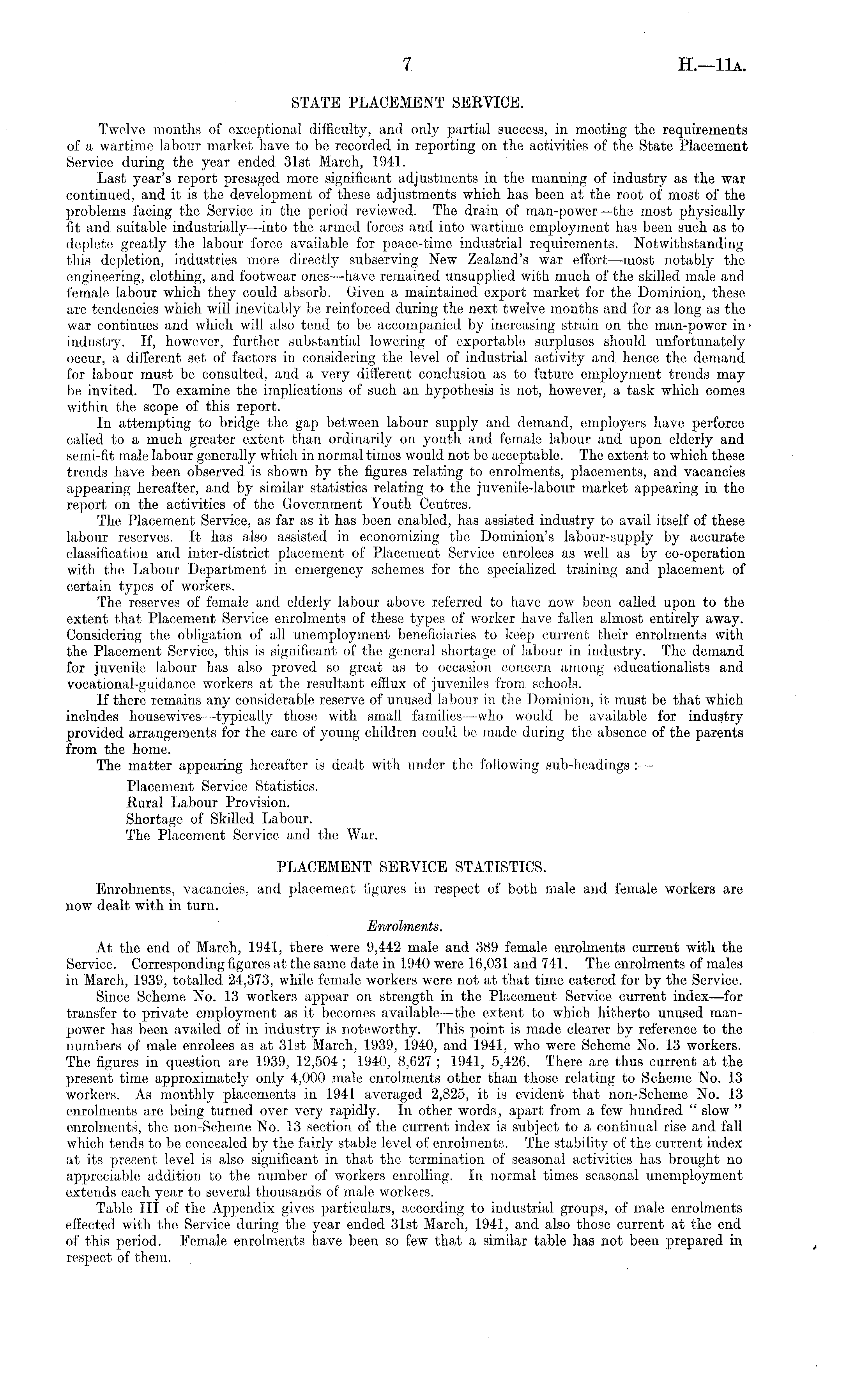 STATE PLACEMENT SERVICE. Twelve months of exceptional difficulty, and only partial success, in meeting the requirements of a wartime labour market have to be recorded in reporting on the activities of the State Placement Service during the year ended 31st March, 1941. Last year's report presaged more significant adjustments in the manning of industry as the war continued, and it is the development of these adjustments which has been at the root of most of the problems facing the Service in the period reviewed. The drain of man-power—the most physically fit and suitable industrially—into the armed forces and into wartime employment has been such as to deplete greatly the labour force available for peace-time industrial requirements. Notwithstanding this depletion, industries more directly subserving New Zealand's war effort—most notably the engineering, clothing, and footwear ones —have remained unsupplied with much of the skilled male and female labour which they could absorb. Given a maintained export market for the Dominion, these are tendencies which will inevitably be reinforced during the next twelve months and for as long as the war continues and which will also tend to be accompanied by increasing strain on the man-power in' industry. If, however, further substantial lowering of exportable surpluses should unfortunately occur, a different set of factors in considering the level of industrial activity and hence the demand for labour must be consulted, and a very different conclusion as to future employment trends may be invited. To examine the implications of such an hypothesis is not, however, a task which comes within the scope of this report. In attempting to bridge the gap between labour supply and demand, employers have perforce called to a much greater extent than ordinarily on youth and female labour and upon elderly and semi-fit male labour generally which in normal times would not be acceptable. The extent to which these trends have been observed is shown by the figures relating to enrolments, placements, and vacancies appearing hereafter, and by similar statistics relating to the juvenile-labour market appearing in the report on the activities of the Government Youth Centres. The Placement Service, as far as it has been enabled, has assisted industry to avail itself of these labour reserves. It has also assisted in economizing the Dominion's labour-supply by accurate classification and inter-district placement of Placement Service enrolees as well as by co-operation with the Labour Department in emergency schemes for the specialized training and placement of certain types of workers. The reserves of female and elderly labour above referred to have now been called upon to the extent that Placement Service enrolments of these types of worker have fallen almost entirely away. Considering the obligation of all unemployment beneficiaries to keep current their enrolments with the Placement Service, this is significant of the general shortage of labour in industry. The demand for juvenile labour has also proved so great as to occasion concern among educationalists and vocational-guidance workers at the resultant efflux of juveniles from schools. If there remains any considerable reserve of unused labour in the Dominion, it must be that which includes housewives —typically those with small families—who would be available for industry provided arrangements for the care of young children could be made during the absence of the parents from the home. The matter appearing hereafter is dealt with under the following sub-headings : — Placement Service Statistics. Rural Labour Provision. Shortage of Skilled Labour. The Placement Service and the War. PLACEMENT SERVICE STATISTICS. Enrolments, vacancies, and placement figures in respect of both male and female workers are now dealt with in turn. Enrolments. At the end of March, 1941, there were 9,442 male and 389 female enrolments current with the Service. Corresponding figures at the same date in 1940 were 16,031 and 741. The enrolments of males in March, 1939, totalled 24,373, while female workers were not at that time catered for by the Service. Since Scheme No. 13 workers appear on strength in the Placement. Service current index—for transfer to private employment as it becomes available —the extent to which hitherto unused manpower has been availed of in industry is noteworthy. This point is made clearer by reference to the numbers of male enrolees as at 31st March, 1939, 1940, and 1941, who were Scheme No. 13 workers. The figures in question are 1939, 12,504 ; 194-0, 8,627 ; 1941, 5,426. There are thus current at the present time approximately only 4,000 male enrolments other than those relating to Scheme No. 13 workers. As monthly placements in 1941 averaged 2,825, it is evident that non-Scheme No. 13 enrolments are being turned over very rapidly. In other words, apart from a few hundred " slow " enrolments, the non-Scheme No. 13 section of the current index is subject to a continual rise and fall which tends to be concealed by the fairly stable level of enrolments. The stability of the current index at its present level is also significant in that the termination of seasonal activities has brought no appreciable addition to the number of workers enrolling. In normal times seasonal unemployment extends each year to several thousands of male workers. Table 111 of the Appendix gives particulars, according to industrial groups, of male enrolments effected with the Service during the year ended 31st March, 1941, and also those current at the end of this period. Female enrolments have been so few that a similar table has not been prepared in respect of them.