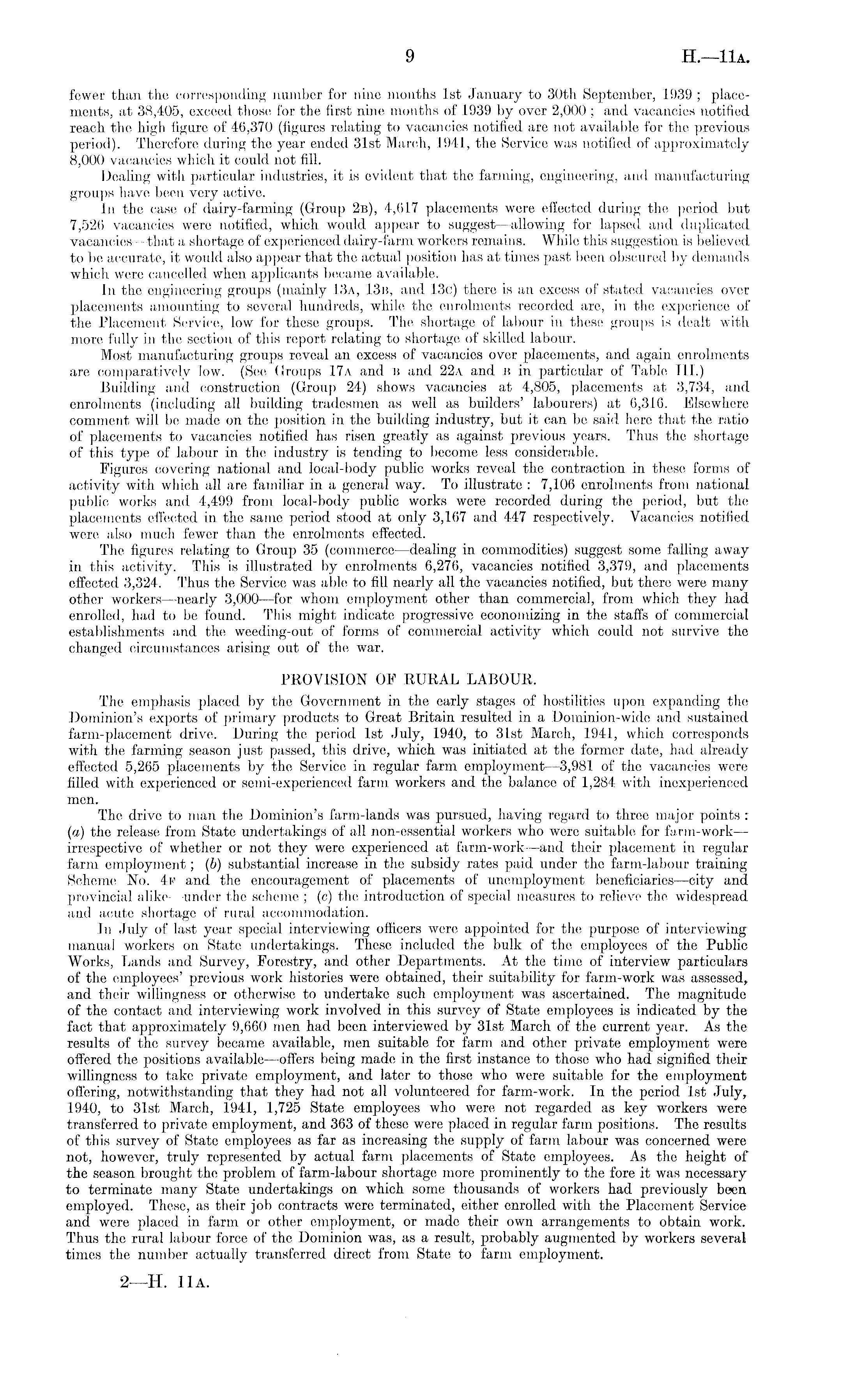 fewer than the corresponding number for nine months Ist January to 30th September, 1939 ; placements, at 38,405, exceed those for the first nine months of 1939 by over 2,000 ; and vacancies notified reach the high figure of 46,370 (figures relating to vacancies notified are not available for the previous period). Therefore during the year ended 31st March, 1941, the Service was notified of approximately 8,000 vacancies which it could not fill. Dealing with particular industries, it is evident that the farming, engineering, and manufacturing groups have been Very active. In the case of dairy-farming (Group 2b), 4,617 placements were effected during the period but 7,526 vacancies were notified, which would appear to suggest —allowing for lapsed and duplicated vacancies—that a shortage of experienced dairy-farm workers remains. While this suggestion is believed to be accurate, it would also appear that the actual position has at times past been obscured by demands which were cancelled when applicants became available. In the engineering groups (mainly 13a, 13b, and 13c) there is an excess of stated vacancies over placements amounting to several hundreds, while the enrolments recorded are, in the experience of the Placement Service, low for these groups. The shortage of labour in these groups is dealt with more fully in the section of this report relating to shortage of skilled labour. Most manufacturing groups reveal an excess of vacancies over placements, and again enrolments are comparatively low. (See Groups 17a and B and 22a and Bin particular of Table III.) Building and construction (Group 24) shows vacancies at 4,805, placements at 3,734, and enrolments (including all building tradesmen as well as builders' labourers) at 6,316. Elsewhere comment will be made on the position in the building industry, but it can be said here that the ratio of placements to vacancies notified has risen greatly as against previous years. Thus the shortage of this type of labour in the industry is tending to become less considerable. Figures covering national and local-body public works reveal the contraction in these forms of activity with which all are familiar in a general way. To illustrate : 7,106 enrolments from national public works and 4,499 from local-body public works were recorded during the period, but the placements effected in the same period stood at only 3,167 and 447 respectively. Vacancies notified were also much fewer than the enrolments effected. The figures relating to Group 35 (commerce —dealing in commodities) suggest some falling away in this activity. This is illustrated by enrolments 6,276, vacancies notified 3,379, and placements effected 3,324. Thus the Service was able to fill nearly all the vacancies notified, but there were many other workers —nearly 3,000 —for whom employment other than commercial, from which they had enrolled, had to be found. This might indicate progressive economizing in the staffs of commercial establishments and the weeding-out of forms of commercial activity which could not survive the changed circumstances arising out of the war. PROVISION OF RURAL LABOUR. The emphasis placed by the Government in the early stages of hostilities upon expanding the Dominion's exports of primary products to Great Britain resulted in a Dominion-wide and sustained farm-placement drive. During the period Ist July, 1940, to 31st March, 1941, which corresponds with the farming season just passed, this drive, which was initiated at the former date, had already effected 5,265 placements by the Service in regular farm employment —3,981 of the vacancies wore filled with experienced or semi-experienced farm workers and the balance of 1,284 with inexperienced men. The drive to man the Dominion's farm-lands was pursued, having regard to three major points : (a) the release from State undertakings of all non-essential workers who were suitable for farm-work— irrespective of whether or not they were experienced at farm-work —and their placement in regular farm employment; (b) substantial increase in the subsidy rates paid under the farm-labour training Scheme No. 4f and the encouragement of placements of unemployment beneficiaries—city and provincial alike —under the scheme ; (c) the introduction of special measures to relieve the widespread and acute shortage of rural accommodation. In July of last year special interviewing officers were appointed for the purpose of interviewing manual workers on State undertakings. These included the bulk of the employees of the Public Works, Lands and Survey, Forestry, and other Departments. At the time of interview particulars of the employees' previous work histories were obtained, their suitability for farm-work was assessed, and their willingness or otherwise to undertake such employment was ascertained. The magnitude of the contact and interviewing work involved in this survey of State employees is indicated by the fact that approximately 9,660 men had been interviewed by 31st March of the current year. As the results of the survey became available, men suitable for farm and other private employment were offered the positions available—offers being made in the first instance to those who had signified their willingness to take private employment, and later to those who were suitable for the employment offering, notwithstanding that they had not all volunteered for farm-work. In the period Ist July, 1940, to 31st March, 1941, 1,725 State employees who were not regarded as key workers were transferred to private employment, and 363 of these were placed in regular farm positions. The results of this survey of State employees as far as increasing the supply of farm labour was concerned were not, however, truly represented by actual farm placements of State employees. As the height of the season brought the problem of farm-labour shortage more prominently to the fore it was necessary to terminate many State undertakings on whi