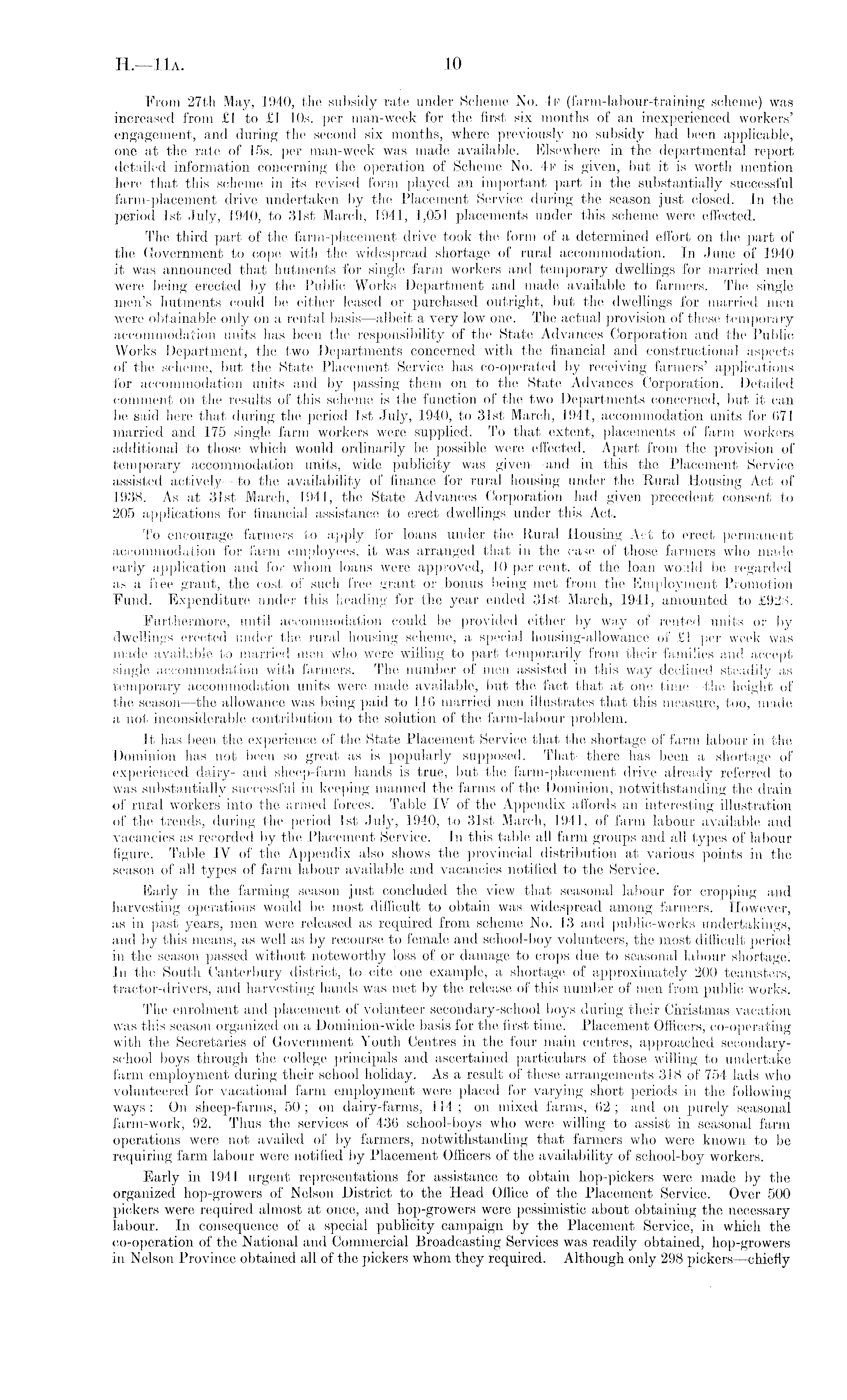From 27th May, 1940, the subsidy rate under Scheme No. 4f (farm-labour-training scheme) was increased from £1 to £1 10s. per man-week for the first six months of an inexperienced workers' engagement, and during the second six months, where previously no subsidy had been applicable, one at the rate of 15s. per man-week was made available. Elsewhere in the departmental report detailed information concerning the operation of Scheme No. 4f is given, but it is worth mention here that this scheme in its revised form played an important part in the substantially successful farm-placement drive undertaken by the Placement Service during the season just closed. In the period Ist July, 1940, to 31st March, 1941, 1,051 placements under this scheme were effected. The third part of the farm-placement drive took the form of a determined effort oh the part of the Government to cope with the widespread shortage of rural accommodation. In June of 1940 it was announced that hutments for single farm workers and temporary dwellings for married men were being erected by the Public Works Department and made available to farmers. The single men's hutments could be either leased or purchased outright, but the dwellings for married men were obtainable only on a rental basis —albeit a very low one. The actual provision of these temporary accommodation units has been the responsibility of the State Advances Corporation and the Public Works Department, the two Departments concerned with the financial and constructional aspects of the scheme, but the State Placement Service has co-operated by receiving farmers' applications for accommodation units and by passing them on to the State Advances Corporation. Detailed comment on the results of this scheme is the function of the two Departments concerned, but it can be said here that during the period Ist July, 1940, to 31st March, 1941, accommodation units for 671 married and 175 single farm workers were supplied. To that extent, placements of farm workers additional to those which would ordinarily be possible were effected. Apart from the provision of temporary accommodation units, wide publicity was given—and in this the Placement Service assisted actively —to the availability of finance for rural housing under the Rural Housing Act of 1938. As at 31st March, 1941, the State Advances Corporation had given precedent consent to 205 applications for financial assistance to erect dwellings under this Act. To encourage farmers to apply for loans under the Rural Housing Act to erect permanent accommodation for farm employees, it was arranged that in the case of those farmers who made early application and for whom loans were approved, 10 per cent, of the loan would be regarded as a free grant, the cost of such free grant or bonus being met from the Employment Promotion Fund. Expenditure under this heading for the year ended 31st March, 1941, amounted to £928. Furthermore, until accommodation could be provided either by way of rented units or by dwellings erected under the rural housing scheme, a special housing-allowance of £1 per week was made available to married men who were willing to part temporarily from their families and accept single accommodation with farmers. The number of men assisted in this way declined steadily as temporary accommodation units were made available, but the fact that at one time —the height of the season —the allowance was being paid to 116 married men illustrates that this measure, too, made a not inconsiderable contribution to the solution of the farm-labour problem. It has been the experience of the State Placement Service that the shortage of farm labour in the Dominion has not been so great as is popularly supposed. That- there has been a shortage of experienced dairy- and sheep-farm hands is true, but the farm-placement drive already referred to was substantially successful in keeping manned the farms of the Dominion, notwithstanding the drain of rural workers into the armed forces. Table IY of the Appendix affords an interesting illustration of the trends, during the period Ist July, 1940, to 31st March, 1941, of farm labour available and vacancies as recorded by the Placement Service. In this table all farm groups and all types of labour figure. Table IV of the Appendix also shows the provincial distribution at various points in the season of all types of farm labour available and vacancies notified to the Service. Early in the farming season just concluded the view that seasonal labour for cropping and harvesting operations would be most difficult to obtain was widespread among farmers. However, as in past years, men were released as required from scheme No. 13 and public-works undertakings, and by this means, as well as by recourse to female and school-boy volunteers, the most difficult period in the season passed without noteworthy loss of or damage to crops due to seasonal labour shortage. In the South Canterbury district, to cite one example, a shortage of approximately 200 teamsters, tractor-drivers, and harvesting hands was met by the release of this number of men from public works. The enrolment and placement of volunteer secondary-school boys during their Christmas vacation was this season organized on a Dominion-wide basis for the first time. Placement Officers, co-operating with the Secretaries of Government Youth Centres in the four main centres, approached secondaryschool boys through the college principals and ascertained particulars of those willing to undertake farm employment during their school holiday. As a result of these arrangements 318 of 754 lads who volunteered for vacational farm employment were placed for varying short periods in the following ways: On sheep-farms, 50; on dairy-farms, .114; on mixed farms, 62 ; and on purely seasonal farm-work, 92. Thus the services of 436 school-boys who were willing to assist in seasonal farm operations were not availed of by farmers, notwithstanding that farmer