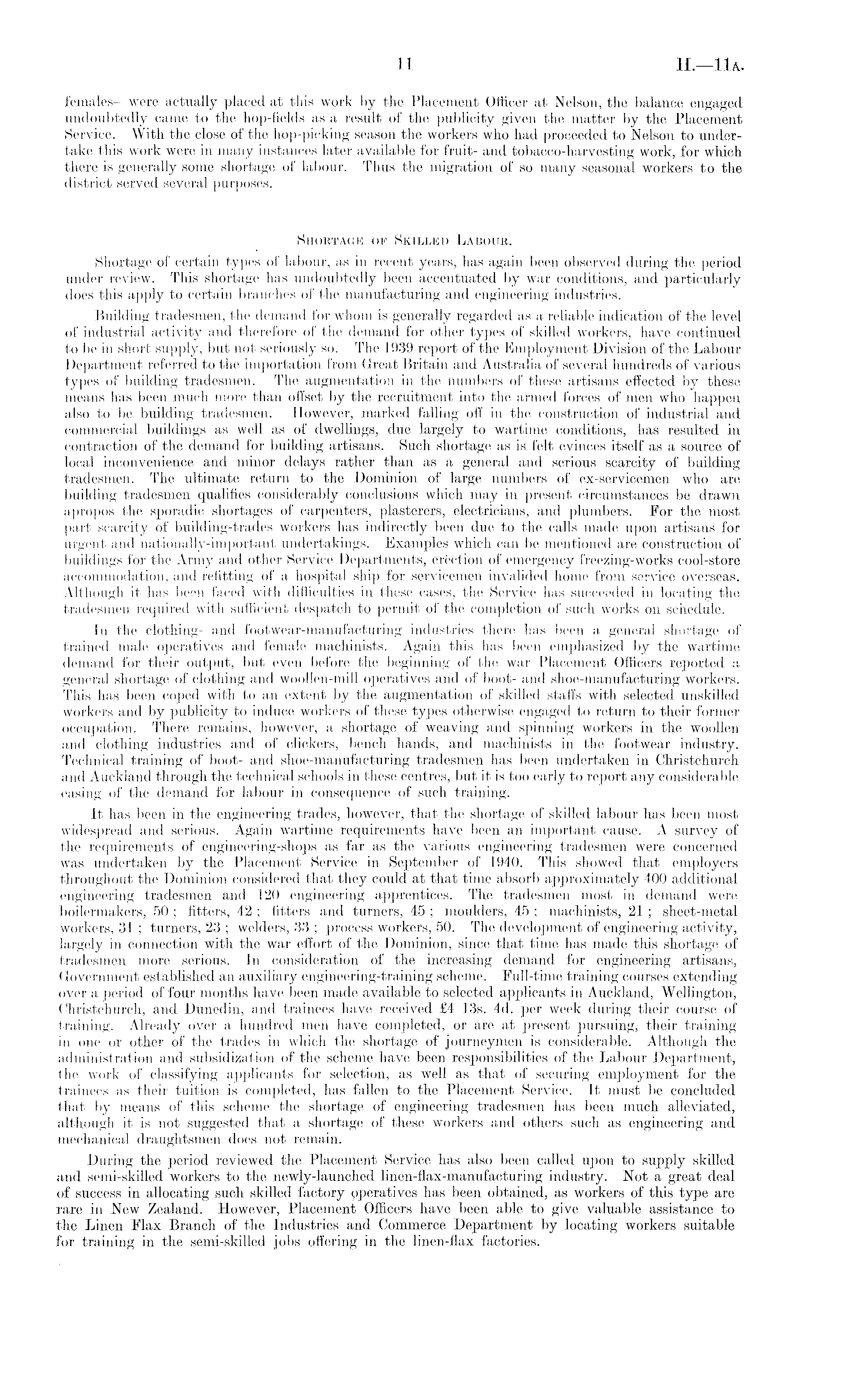 females —were actually placed at this work by the Placement Officer at Nelsoii, the balance engaged undoubtedly came to the hop-fields as a result of the publicity given the matter by the Placement Service. With the close of the hop-picking season the workers who had proceeded to Nelson to undertake this work were in many instances later available for fruit- and tobacco-harvesting work, for which there is generally some shortage of labour. Thus the migration of so many seasonal workers to the district served several purposes. Shortage op Skilled Labour. Shortage of certain types of labour, as in recent years, has again been observed during the period under review. This shortage has undoubtedly been accentuated by war conditions, and particularly does this apply to certain branches of the manufacturing and engineering industries. Building tradesmen, the demand for whom is generally regarded as a reliable indication of the level of industrial activity and therefore of the demand for other types of skilled workers, have continued to be in short supply, but not seriously so. The 1939 report of the Employment Division of the Labour Department referred to the importation from Great Britain and Australia of several hundreds of various types of building tradesmen. The augmentation in the numbers of these artisans effected by these means has been much more than offset by the recruitment into the armed forces of men who happen also to be building tradesmen. However, marked falling off in the construction of industrial and commercial buildings as well as of dwellings, due largely to wartime conditions, has resulted in contraction of the demand for building artisans. Such shortage as is felt evinces itself as a source of local inconvenience and minor delays rather than as a general and serious scarcity of building tradesmen. The ultimate return to the Dominion of large numbers of ex-servicemen who are building tradesmen qualifies considerably conclusions which may in present circumstances be drawn apropos the sporadic shortages of carpenters, plasterers, electricians, and plumbers. For the most part scarcity of building-trades workers has indirectly been due to the calls made upon artisans for urgent and nationally-important undertakings. Examples which can be mentioned are construction of buildings for the Army and other Service Departments, erection of emergency freezing-works cool-store accommodation, and refitting of a hospital ship for servicemen invalided home from service overseas. Although it has been faced with difficulties in these cases, the Service has succeeded in locating the tradesmen required with sufficient despatch to permit of the completion of such works on schedule. In the clothing- and footwear-manufacturing industries there has been a general shortage of trained male operatives and female machinists. Again this has been emphasized by the wartime demand for their output, but even before the beginning of the war Placement Officers reported a general shortage of clothing and woollen-mill operatives and of boot- and shoe-manufacturing workers. This has been coped with to an extent by the augmentation of skilled staffs with selected unskilled workers and by publicity to induce workers of these types otherwise engaged to return to their former occupation. There remains, however, a shortage of weaving and spinning workers in the woollen and clothing industries and of clickers, bench hands, and machinists in the footwear industry. Technical training of boot- and shoe-manufacturing tradesmen has been undertaken in Christchurch and Auckland through the technical schools in these centre's, but it is too early to report any considerable easing of the demand for labour in consequence of such training. It has been in the engineering trades, however, that the shortage of skilled labour has been most widespread and serious. Again wartime requirements have been an important cause. A survey of the requirements of engineering-shops as far as the various engineering tradesmen were concerned was undertaken by the Placement Service in September of 1940. This showed that employers throughout the Dominion considered that they could at that time absorb approximately 400 additional engineering tradesmen and 120 engineering apprentices. The tradesmen most in demand were boilermakers, 50 ; fitters, 42 ; fitters and turners, 45 ; moulders, 45 ; machinists, 21 ; sheet-metal workers, 31 ; turners, 23 ; welders, 33 ; process workers, 50. The development of engineering activity, largely in. connection with the war effort of the Dominion, since that time has made this shortage of tradesmen more serious. In consideration of the increasing demand for engineering artisans, Government established an auxiliary engineering-training scheme. Full-time training courses extending over a period of four months have been made available to selected applicants in Auckland, Wellington, Christchurch, and Dunedin, and trainees have received £4 13s. 4d. per week during their course of training. Already over a hundred men have completed, or are at present pursuing, their training in one or other of the trades in which the shortage of journeymen is considerable. Although the administration and subsidization of the scheme have been responsibilities of the Labour Department, the work of classifying applicants for selection, as well as that of securing employment for the trainees as their tuition is completed, has fallen to the Placement Service. It must be concluded that by means of this scheme the shortage of engineering tradesmen has been much alleviated, although it is not suggested that a shortage of these workers and others such as engineering and mechanical draughtsmen does not remain. During the period reviewed the Placement Service has also been called upon to supply skilled and semi-skilled workers to the newly-launched linen-flax-manufacturing industry. Not a great deal of success in allocating such skilled factory oper