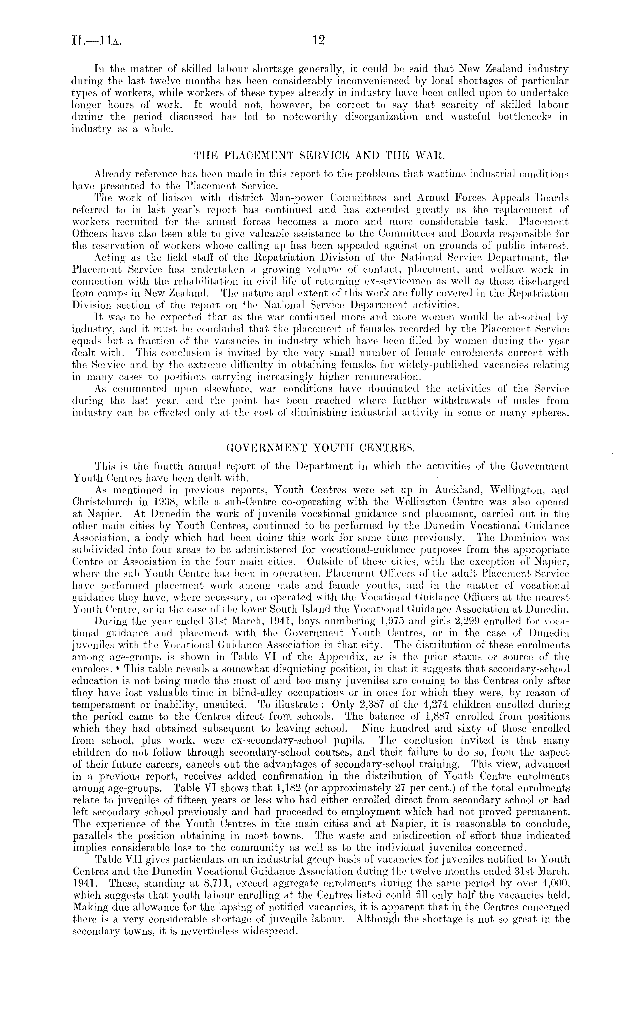 In the matter of skilled labour shortage generally, it could be said that New Zealand industry during the last twelve months has been considerably inconvenienced by local shortages of particular types of workers, while workers of these types already in industry have been called upon to undertake longer hours of work. It would not, however, be correct to say that scarcity of skilled labour during the period discussed has led to noteworthy disorganization and wasteful bottlenecks in industry as a whole. THE PLACEMENT SERVICE AND THE WAR. Already reference has been made in this report to the problems that wartime industrial conditions have presented to the Placement Service. The work of liaison with district Man-power Committees and Armed Forces Appeals Boards referred to in last year's report has continued and has extended greatly as the replacement of workers recruited for the armed forces becomes a more and more considerable task. Placement Officers have also been able to give valuable assistance to the Committees and Boards responsible for the reservation of workers whose calling up has been appealed against on grounds of public interest. Acting as the field staff of the Repatriation Division of the National Service Department, the Placement Service has undertaken a growing volume of contact, placement, and welfare work in connection with the rehabilitation in civil life of returning ex-servicemen as well as those discharged from camps in New Zealand. The nature and extent of this work are fully covered in the Repatriation Division section of the report on the National Service Department activities. It was to be expected that as the war continued more and more women would be absorbed by industry, and it must be concluded that the placement of females recorded by the Placement Service equals but a fraction of the vacancies in industry which have been filled by women during the year dealt with. This conclusion is invited by the very small number of female enrolments current with the Service and by the extreme difficulty in obtaining females for widely-published vacancies relating in many cases to positions carrying increasingly higher remuneration. As commented upon elsewhere, war conditions have dominated the activities of the Service during the last year, and the point has been reached where further withdrawals of males from industry can be effected only at the cost of diminishing industrial activity in some or many spheres. GOVERNMENT YOUTH CENTRES. This is the fourth annual report of the Department in which the activities of the Government Youth Centres have been dealt with. As mentioned in previous reports, Youth Centres were set up in Auckland, Wellington, and Christchurch in 1938, while a sub-Centre co-operating with the Wellington Centre was also opened at Napier. At Dunedin the work of juvenile vocational guidance and placement, carried out in the other main cities by Youth Centres, continued to be performed by the Dunedin Vocational Guidance Association, a body which had been doing this work for some time previously. The Dominion was subdivided into four areas to be administered for vocational-guidance purposes from the appropriate Centre or Association in the four main cities. Outside of these cities, with the exception of Napier, where the sub Youth Centre has been in operation, Placement Officers of the adult Placement Service have performed placement work among male and female youths, and in the matter of vocational guidance they have, where necessary, co-operated with the Vocational Guidance Officers at the nearest Youth Centre, or in the case of the lower South Island the Vocational Guidance Association at Dunedin. During the year ended 31st March, 1941, boys numbering 1,975 and girls 2,299 enrolled for vocational guidance and placement with the Government Youth Centres, or in the case of Dunedin juveniles with the Vocational Guidance Association in that city. The distribution of these enrolments among age-groups is shown in Table VI of the Appendix, as is the prior status or source of the enrolees. » This table reveals a somewhat disquieting position, in that it suggests that secondary-school education is not being made the most of and too many juveniles are coming to the Centres only after they have lost valuable time in blind-alley occupations or in ones for which they were, by reason of temperament or inability, unsuited. To illustrate : Only 2,387 of the 4,274 children enrolled during the period came to the Centres direct from schools. The balance of 1,887 enrolled from positions which they had obtained subsequent to leaving school. Nine hundred and sixty of those enrolled from school, plus work, were ex-secondary-school pupils. The conclusion invited is that many children do not follow through secondary-school courses, and their failure to do so, from the aspect of their future careers, cancels out the advantages of secondary-school training. This view, advanced in a previous report, receives added confirmation in the distribution of Youth Centre enrolments among age-groups. Table VI shows that 1,182 (or approximately 27 per cent.) of the total enrolments relate to juveniles of fifteen years or less who had either enrolled direct from secondary school or had left secondary school previously and had proceeded to employment which had not proved permanent. The experience of the Youth Centres in the main cities and at Napier, it is reasonable to conclude, parallels the position obtaining in most towns. The waste and misdirection of effort thus indicated implies considerable loss to the community as well as to the individual juveniles concerned. Table VII gives particulars on an industrial-group basis of vacancies for juveniles notified to Youth Centres and the Dunedin Vocational Guidance Association during the twelve months ended 31st March, 1941. These, standing at 8,711, exceed aggregate enrolments during the same period by over 4,000, which suggests that youth-labour