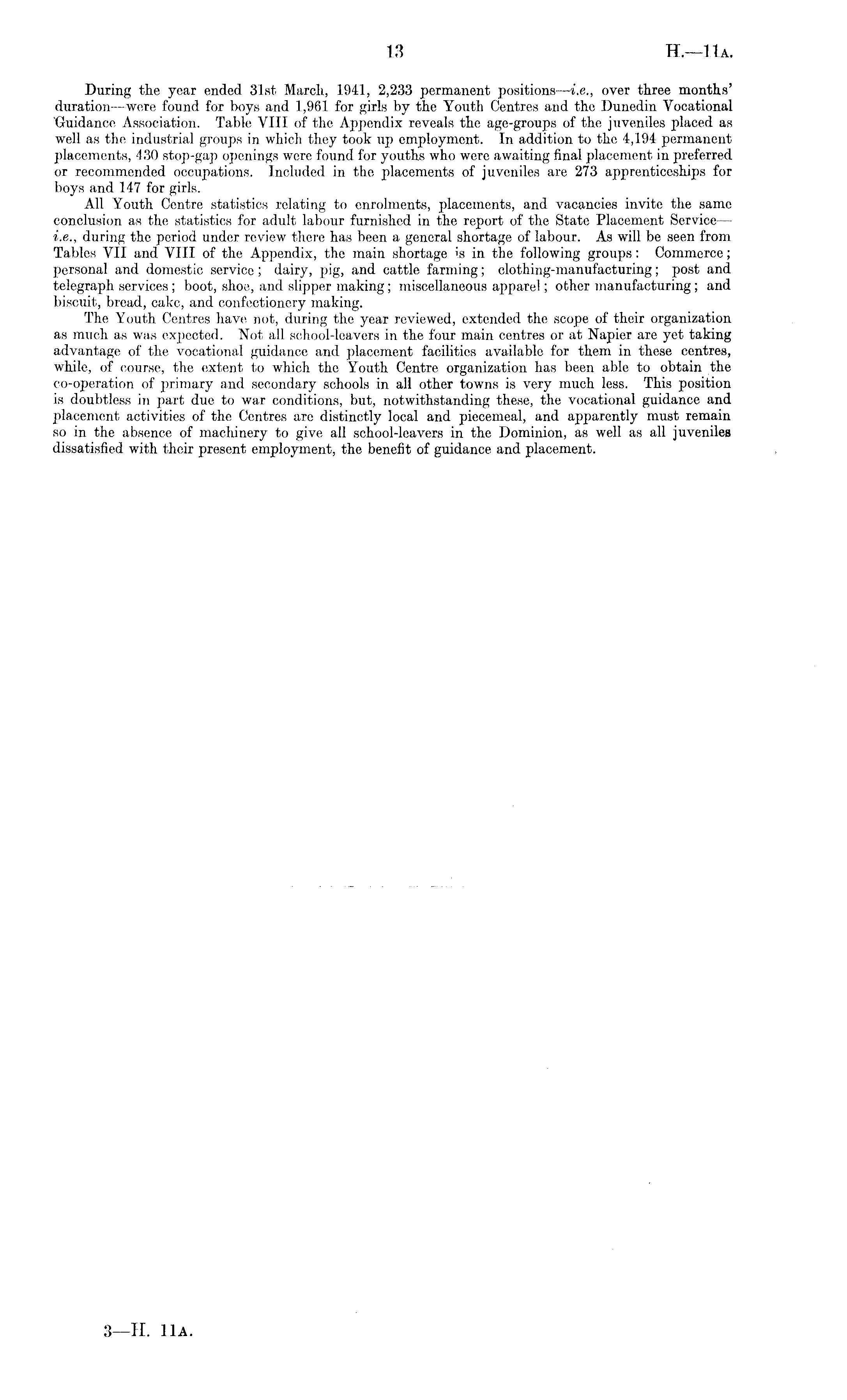 During the year ended 31st March, 1941, 2,233 permanent positions— i.e., over three months' duration—were found for boys and 1,961 for girls by the Youth Centres and the Dunedin Vocational Guidance Association. Table VIII of the Appendix reveals the age-groups of the juveniles placed as well as the industrial groups in which they took up employment. In addition to the 4,194 permanent placements, 430 stop-gap openings were found for youths who were awaiting final placement in preferred or recommended occupations. Included in the placements of juveniles are 273 apprenticeships for boys and 147 for girls. All Youth Centre statistics relating to enrolments, placements, and vacancies invite the same conclusion as the statistics for adult labour furnished in the report of the State Placement Service — i.e., during the period under review there has been a general shortage of labour. As will be seen from Tables VII and VIII of the Appendix, the main shortage is in the following groups: Commerce; personal and domestic service; dairy, pig, and cattle farming; clothing-manufacturing; post and telegraph services; boot, shoe, and slipper making; miscellaneous apparel; other manufacturing; and biscuit, bread, cake, and confectionery making. The Youth Centres have not, during the year reviewed, extended the scope of their organization as much as was expected. Not all school-leavers in the four main centres or at Napier are yet taking advantage of the vocational guidance and placement facilities available for them in these centres, while, of course, the extent to which the Youth Centre organization has been able to obtain the co-operation of primary and secondary schools in all other towns is very much less. This position is doubtless in part due to war conditions, but, notwithstanding these, the vocational guidance and placement activities of the Centres are distinctly local and piecemeal, and apparently must remain so in the absence of machinery to give all school-leavers in the Dominion, as well as all juveniles dissatisfied with their present employment, the benefit of guidance and placement.