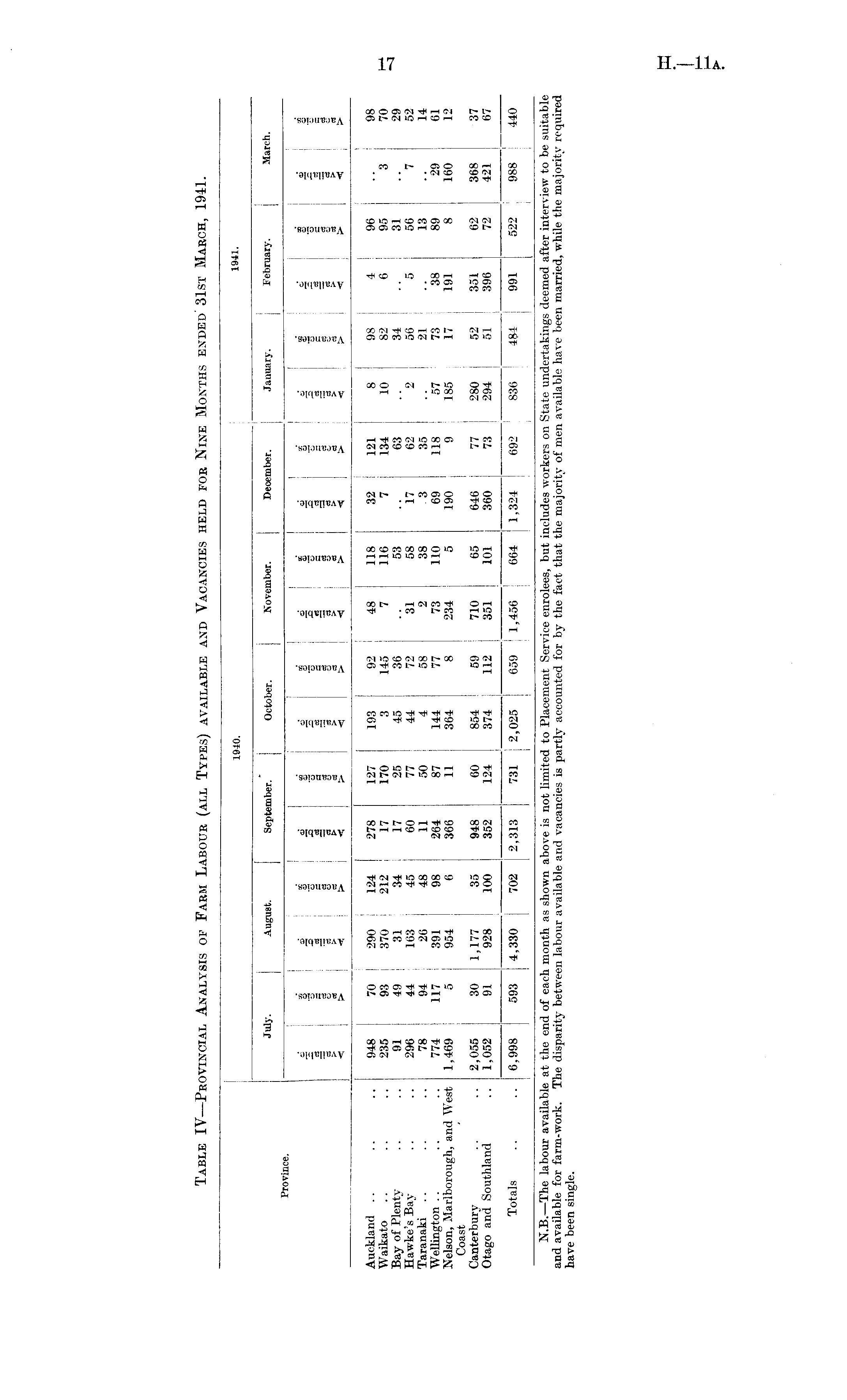 Table IV—Provincial Analysis of Farm Labour (all Types) available and Vacancies held for Nine Months ended 31st March, 1941.