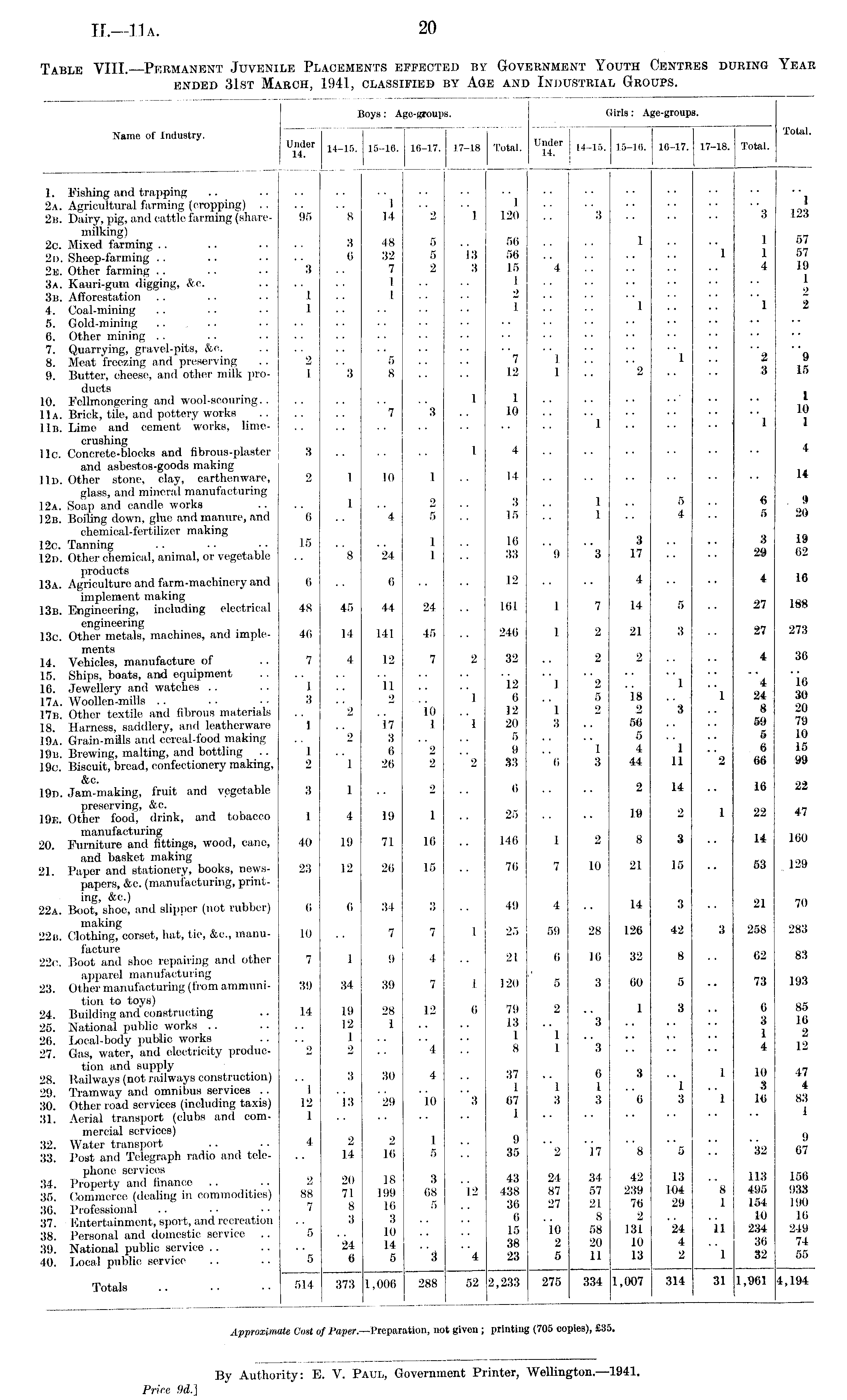 Table VIII.—Permanent Juvenile Placements effected by Government Youth Centres during Year ended 31st March, 1941, classified by Age and Industrial Groups.