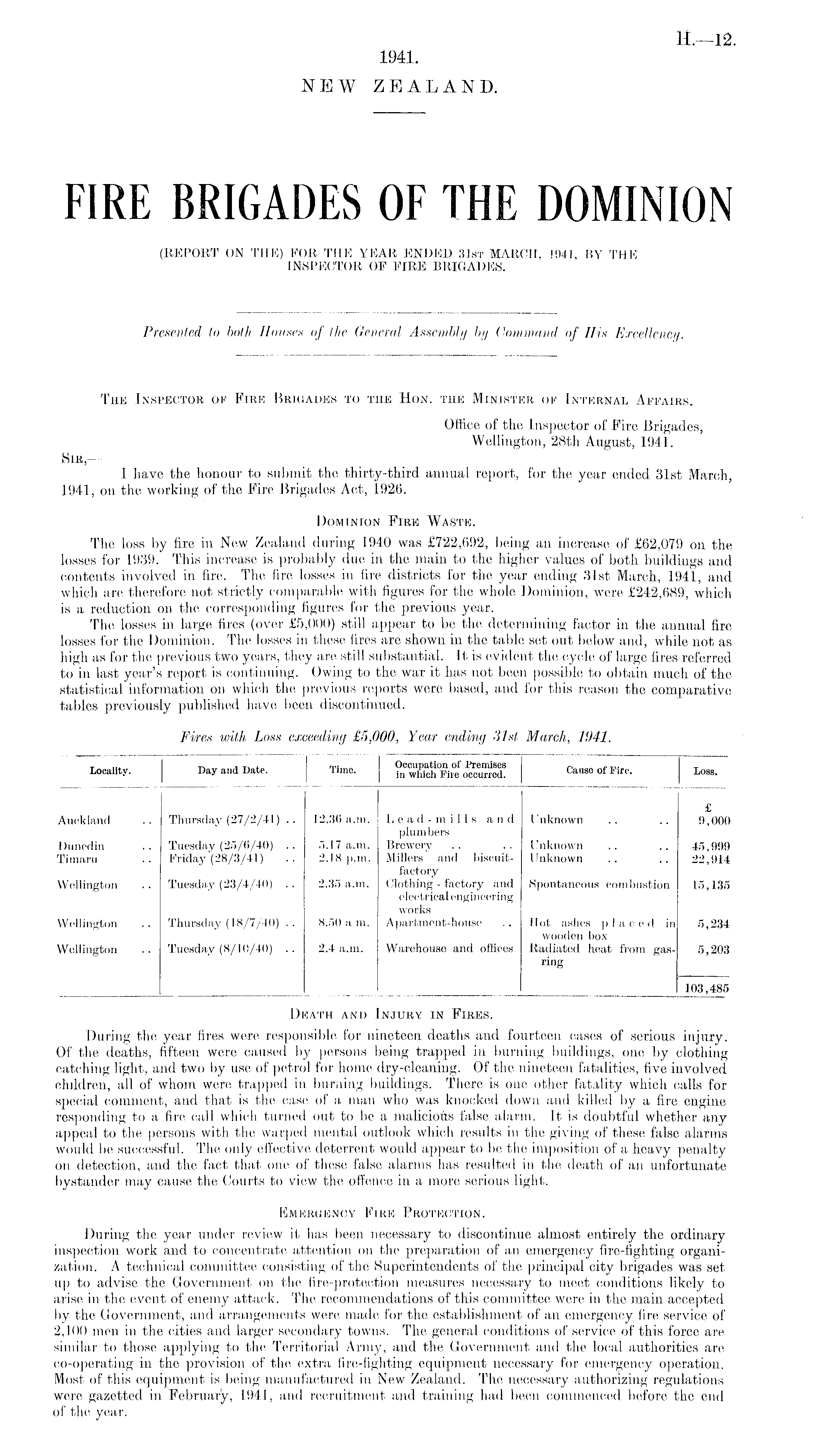 The Inspector of Fire Brigades to the Hon. the Minister of Internal Affairs. Office of the Inspector of Fire Brigades, Wellington, 28th August, 1941. Sir, — I have the honour to submit the thirty-third annual report, for the year ended 31st March, 1941, on the working of the Fire Brigades Act, 1926. Dominion Fire Waste. The loss by fire in New Zealand during 1940 was £722,692, being an increase of £62,079 on the losses for 1939. This increase is probably due in the main to the higher values of both buildings and contents involved in fire. The fire losses in fire districts for the year ending 31st March, 1941, and which are therefore not strictly comparable with figures for the whole Dominion, were £242,689, which is a reduction on the corresponding figures for the previous year. The losses in large fires (over £5,000) still appear to be the determining factor in the annual fire losses f6r the Dominion. The losses in these fires are shown in the table set out below and, while not as high as for the previous two years, they are still substantial. It is evident the cycle of large fires referred to in last year's report is continuing. Owing to the war it has not been possible to obtain much of the statistical information on which the previous reports were based, and for this reason the comparative tables previously published have been discontinued.