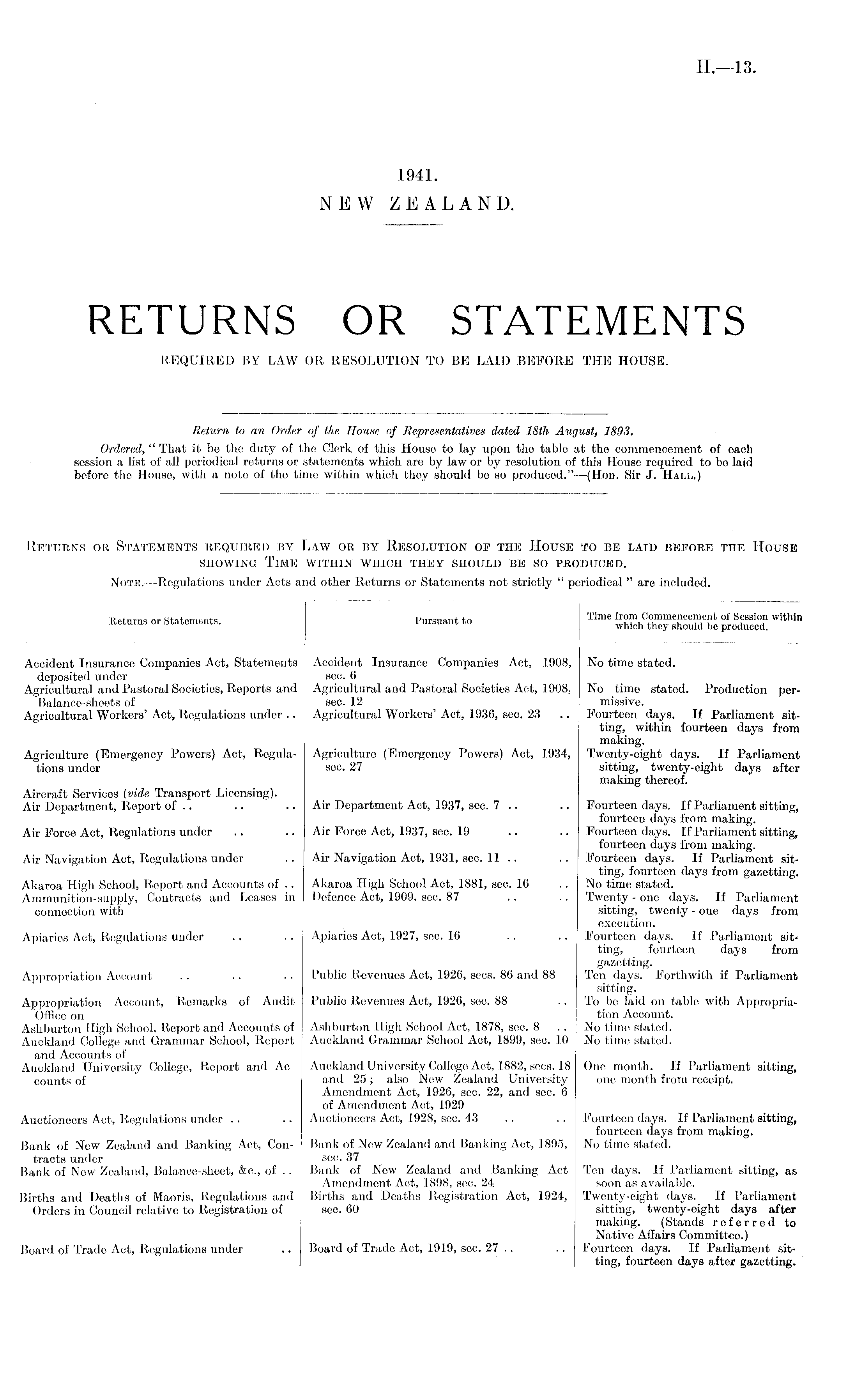 Return to an Order of the House, of Representatives dated I,Bth August, 1893. Ordered, " That it be the duty of the Clerk of this House to lay upon the table at the commencement of oach session a list of all periodical returns or statements which are by law or by resolution of this House required to be laid before the House, with a note of the time within which they should be so produced."—{Hon. Sir J. Hall.)
