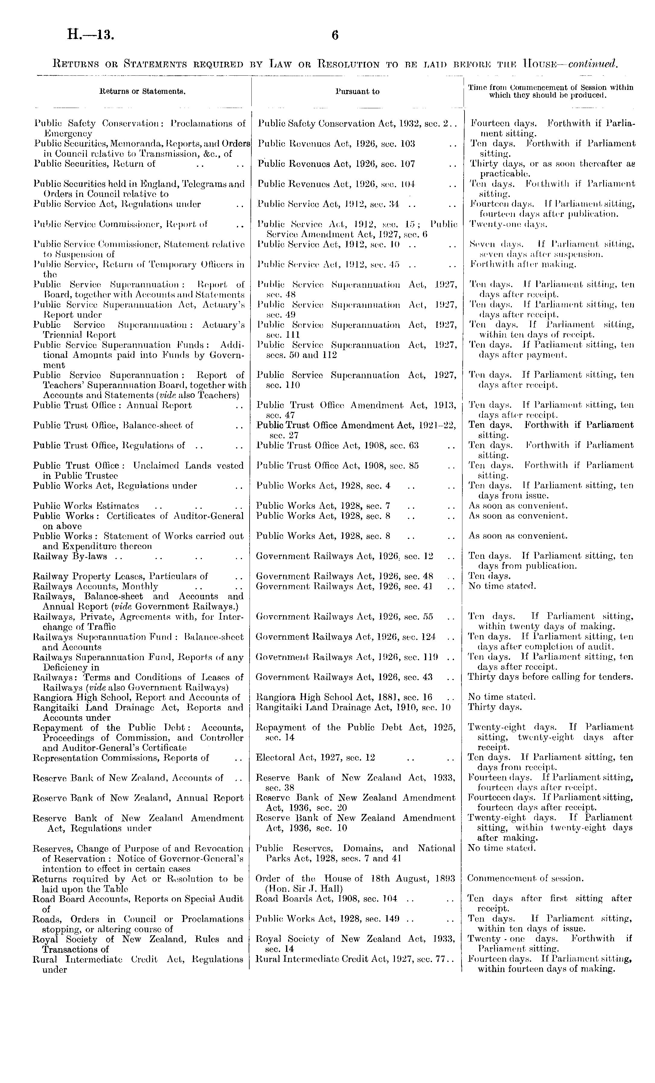 -Da*.,. « «- a+-«+ *« +„ t> 4.4. Time from Commencement of Session within Returns or Statements. Pursuant to which they shouM be produced . Public Safety Conservation: Proclamations of Public Safety Conservation Act, 1932, sec. 2.. Fourteen days. Forthwith if ParliaEmergoncy ment sitting. Public Securities, Memoranda, Reports, and Orders Public Revenues Act, 1926, sec. 103 .. Ten days. Forthwith if Parliament in Council relative to Transmission, &c, of sitting. Public Securities, Return of .. .. Public Revenues Act, 1926, sec. 107 .. Thirty days, or as soon thereafter as practicable. Public Securities hold in England, Telegrams and Public Revenues Act, 1926, sec. 104 .. Ten days. Forthwith if Parliament Orders in Council relative to . sitting. Public Servico Act, Regulations under .. Public Service Act, 1912, see. 34 .. .. Fourteen days. If Parliament sitting, fourteen days after publication. Public Service Commissioner, Report of .. Public Service Act, 1912, sec. 15 ; Public Twenty-one days. Service Amendment Act, 1927, sec. 6 Public Service Commissioner, Statement relative Public Service Act, 1912, sec. 10 .. .. Seven days. If Parliament sitting, to Suspension of seven days after suspension. Public Service, Return of Temporary Officers in Public Service Act, 1912, sec. 45 .. .. Forthwith after making. the Public Service Superannuation : Report of Public Service Superannuation Act, 1927, Ten days. If Parliament sitting, ten Board, together with Accounts and Statements sec. 48 days after receipt. Public Service Superannuation Act, Actuary's Public Service Superannuation Act, 1927, Ten days. If Parliament sitting, ten Report under see. 49 days after receipt. Public Service Superannuation : Actuary's Publics Service Superannuation Act, 1927, Ten days. If Parliament sitting, Triennial Report sec. Ill withiu ten days of receipt. Public Service Superannuation Funds: Addi- Public Service Superannuation Act, 1927, Ten days. If Parliament sitting, ten tional Amounts paid into Funds by Govern- sees. 50 and 112 days after payment. ment Public Service Superannuation : Report of Public Service Superannuation Act, 1927, Ten days. If Parliament sitting, ten Teachers'Superannuation Board, together with sec. 110 days after receipt. Accounts and Statements {vide, also Teachers) Public Trust Office : Annual Report .. Public Trust Office Amendment Act, 1913, Ten days. If Parliament sitting, ten sec. 47 days after receipt. Public Trust Office, Balance-sheet of .. Public Trust Office Amendment Act, 1921-22, Ten days. Forthwith if Parliament sec. 27 sitting. Public Trust Office, Regulations of .. .. Public Trust Office Act, 1908, sec. 63 .. Ten days. Forthwith if Parliament sitting. Public Trust Office : Unclaimed Lands vested Public Trust Office Act, 1908, sec. 85 .. Ten days. Forthwith if Parliament in Public Trustee sitting. Public Works Act, Regulations under .. Public Works Act, 1928, sec. 4 .. . . Ten days. If Parliament sitting, ten days from issue. Public Works Estimates . . .. .. Public Works Act, 1928, sec. 7 .. As soon as convenient. Public Works : Certificates of Auditor-General Public Works Act, 1928, sec. 8 .. As soon as convenient. on above Public Works : Statement of Works carried out Public Works Act, 1928, sec. 8 .. As soon as convenient. and Expenditure thereon Railway By-laws .. .. .. .. Government Railways Act, 1926, sec. 12 .. Ten days. If Parliament sitting, ten days from publication. Railway Property Leases, Particulars of .. Government Railways Act, 1926, see. 48 . . Ten days. Railways Accounts, Monthly .. .. Government Railways Act, 1926, sec. 41 .. No time stated. Railways, Balance-sheet and Accounts and Annual Report (vide Government Railways.) Railways, Private, Agreements with, for Inter- Government Railways Act, 1926, sec. 55 .. Ten days. If Parliament sitting, change of Traffic within twenty days of making. Railways Superannuation Fund : Balance-sheet Government Railways Act, 1926, sec. 124 .. Ten days. If Parliament sitting, ten and Accounts days after completion of audit. Railways Superannuation Fund, Reports of any Government Railways Act, 1926, sec. 119 .. Ten days. If Parliament sitting, ten Deficiency in days after receipt. Railways: Terms and Conditions of Leases of Government Railways Act, 1926, sec. 43 .. Thirty days before calling for tenders. Railways (vide also Government Railways) Rangiora High School, Report and Accounts of Rangiora High School Act, 1881, sec. 16 .. No time stated. Rangitaiki Land Drainage Act, Reports and Rangitaiki Land Drainage Act, 1910, sec. 10 Thirty days. Accounts under Repayment of the Public Debt: Accounts, Repayment of the Public Debt Act, 1925, Twenty-eight days. If Parliament Proceedings of Commission, and Controller sec. 14 sitting, twenty-eight days after and Auditor-General's Certificate receipt. Representation Commissions, Reports of .. Electoral Act, 1927, sec. 12 .. .. Ten days. If Parliament sitting, ten days from receipt. Reserve Bank of New Zealand, Accounts of .. Reserve Bank of New Zealand Act, 1933, Fourteen days. If Parliament sitting, sec. 38 fourteen days after receipt. Reserve Bank of New Zealand, Annual Report Reserve Bank of New Zealand Amendment Fourteeen days. If Parliament sitting, Act, 1936, sec. 20 fourteen days after receipt. Reserve Bank of New Zealand Amendment Reserve Bank of New Zealand Amendment Twenty-eight days. If Parliament Act, Regulations under Act, 1936, sec. 10 sitting, within twenty-eight days after making. Reserves, Change of Purpose of and Revocation Public Reserves, Domains, and National No time stated. of Reservation : Notice of Governor-General's Parks Act, 1928, sees. 7 and 41 intention to effect in certain cases Returns required by Act or Resolution to be Order of the House of 18th August, 1893 Commencement of session. laid upon the Table (Hon. Sir J. Hall) Road Board Accounts, Reports on Special Audit Road Boards Act, 1908, sec. 104 .. .. Ten days after first sitting after of receipt.