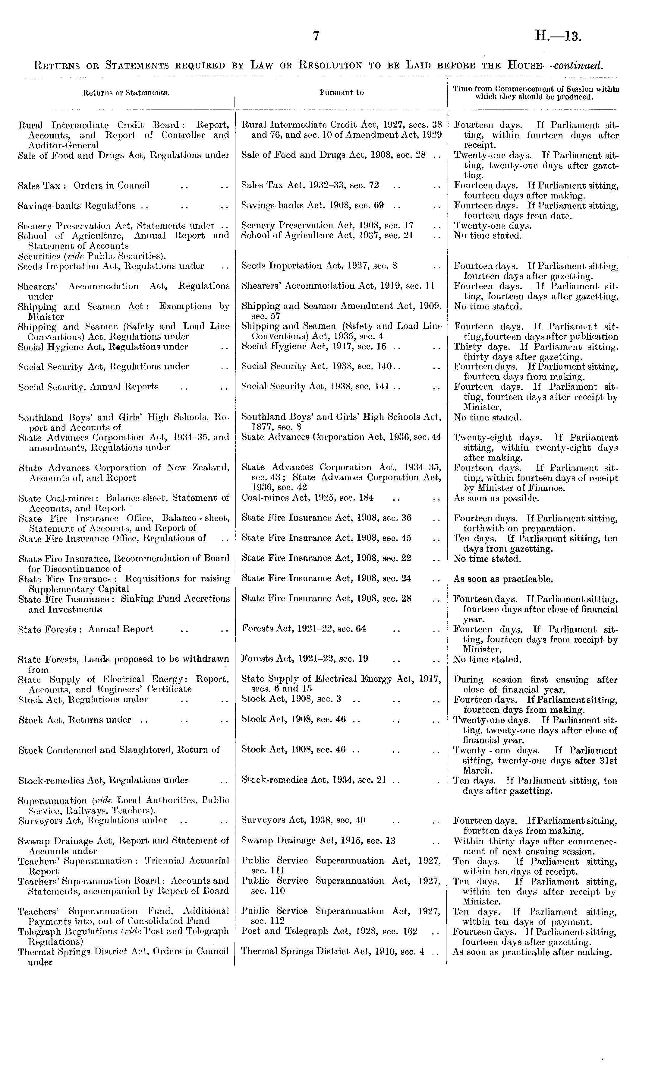 ■Rutin™ nr stntpmenta Piirsnnnt to Time from Commencement of Session within ltetmns or Statements. 1 ursuant to which th(Jy BhouW fce pIoduced _ Rural Intermediate Credit Board : Report, Rural Intermediate Credit Act, 1927, sees. 38 Fourteen days. If Parliament sitAecounts, and Report of Controller and and 76, and sec. 10 of Amendment Act, 1929 ting, within fourteen days after Auditor-General receipt. Sale of Food and Drugs Act, Regulations under Sale of Food and Drugs Act, 1908, sec. 28 .. Twenty-one days. If Parliament sitting, twenty-one days after gazetting. Sales Tax : Orders in Council .. .. Sales Tax Act, 1932-33, sec. 72 .. Fourteen days. If Parliament sitting, fourteen days after making. Savings-banks Regulations .. .. .. Savings-banks Act, 1908, sec. 69 .. .. Fourteen days. If Parliament sitting, fourteen days from date. Scenery Preservation Act, Statements under .. Scenery Preservation Act, 1908, sec. 17 . . Twenty-one days. School of Agriculture, Annual Report and School of Agriculture Act, 1.937, sec. 21 .. No time stated. Statement of Accounts Securities (vide Public Securities). Seeds Importation Act, Regulations under . . Seeds Importation Act, 1927, sec. 8 .. Fourteen days. If Parliament sitting, fourteen days after gazetting. Shearers' Accommodation Act, Regulations Shearers' Accommodation Act, 1919, sec. 11 Fourteen days. If Parliament situnder ting, fourteen days after gazetting. Shipping and Seamen Act: Exemptions by Shipping and Seamen Amendment Act, 1909, No time stated. Minister sec. 57 Shipping and Seamen (Safety and Load Line Shipping and Seamen (Safety and Load Line Fourteen days. If Parliament sitConventions) Act, Regulations under Conventions) Act, 1935, sec. 4 ting, fourteen days after publication Social Hygiene Act, Regulations under .. Social Hygiene Act, 1917, sec. 15 .. .. Thirty days. If Parliament sitting. thirty days after gazetting. Social Security Act, Regulations under .. Social Security Act, 1938, sec. 140.. .. Fourteen days. If Parliament sitting, fourteen days from making. Social Security, Annual Reports .. .. Social Security Act, 1938, sec. 141 .. .. Fourteen days. If Parliament sitting, fourteen days after receipt by Minister. Southland Boys' and Girls' High Schools, Re- Southland Boys' and Girls' High Schools Act, No time stated. port and Accounts of 1877, sec. 3 State Advances Corporation Act, 1934-35, and State Advances Corporation Act, 1936, sec. 44 Twenty-eight days. If Parliament amendments, Regulations under sitting, within twenty-eight days after making. State Advances Corporation of New Zealand, State Advances Corporation Act, 1934-35, Fourteen days. If Parliament sitAccounts of, and Report sec. 43; State Advances Corporation Act, ting, within fourteen days of receipt 1936, sec. 42 by Minister of Finance. State Coal-mines : Balance-sheet, Statemont of Coal-mines Act, 1925, sec. 184 .. As soon as possible. Accounts, and Report State Fire Insurance Office, Balance - sheet, State Fire Insurance Act, 1908, see. 36 .. Fourteen days. If Parliament sitting, Statement of Accounts, and Report of forthwith on preparation. State Fire Insurance Office, Regulations of .. State Fire Insurance Act, 1908, sec. 45 .. Ten days. If Parliament sitting, ten days from gazetting. State Fire Insurance, Recommendation of Board State Fire Insurance Act, 1908, sec. 22 No time stated. for Discontinuance of State Fire Insurance : Requisitions for raising State Fire Insurance Act, 1908, sec. 24 As soon as practicable. Supplementary Capital State Fire Insurance : Sinking Fund Accretions State Fire Insurance Act, 1908, sec. 28 .. Fourteen days. If Parliament sitting, and Investments fourteen days after close of financial year. State Forests : Annual Report .. .. Forests Act, 1921-22, sec. 64 .. .. Fourteen days. If Parliament sitting, fourteen days from receipt by Minister. State Forests, Lands proposed to be withdrawn Forests Act, 1921-22, sec. 19 .. No time stated. from State Supply of Electrical Energy: Report, State Supply of Electrical Energy Act, 1917, During session first ensuing after Accounts, and Engineers' Certificate sees. 6 and 15 close of financial year. Stock Act, Regulations under .. .. Stock Act, 1908, sec. 3 .. .. .. Fourteen days. If Parliament sitting, fourteen days from making. Stock Act, Returns under .. .. .. Stock Act, 1908, sec. 46 .. .. .. Twenty-one days. If Parliament sitting, twenty-one days after olose of financial year. Stock Condemned and Slaughtered, Return of Stock Act, 1908, sec. 46 .. .. .. Twenty - one days. If Parliament sitting, twenty-one days after 31st Maroh. Stock-remedies Act, Regulations under .. Stock-romedies Act, 1934, sec. 21 .. . Ten days. If Parliament sitting, ten days after gazetting. Superannuation (vide Local Authorities, Public Service, Railways, Teachers). Surveyors Act, Regulations under .. .. Surveyors Act, 1938, sec. 40 .. .. Fourteen days. If Parliament sitting, fourteen days from making. Swamp Drainage Act, Report and Statement of Swamp Drainage Act, 1915, sec. 13 .. Within thirty days after commenceAccounts under ment of next ensuing session. Teachers' Superannuation: Triennial Actuarial Public Service Superannuation Act, 1927, Ten days. If Parliament sitting, Report sec. Ill within ten.days of receipt. Teachers' Superannuation Board: Accounts and Public Service Superannuation Act, 1927, Ton days. If Parliament sitting, Statements, accompanied by Report of Board sec. 110 within ten days after receipt by Minister. Teachers' Superannuation Fund, Additional Public Service Superannuation Act, 1927, Ten days. If Parliament sitting, Payments into, out of Consolidated Fund sec. 112 within ten days of payment. Telegraph Regulations (vide Post and Telegraph Post and Telegraph Act, 1928, sec. 162 .. Fourteen days. If Parliament sitting, Regulations) . fourteen clays after gazetting. Thermal Springs District Act, Orders in Council Thermal Springs District Act, 1910, sec. 4 .. As soon as practicable after making