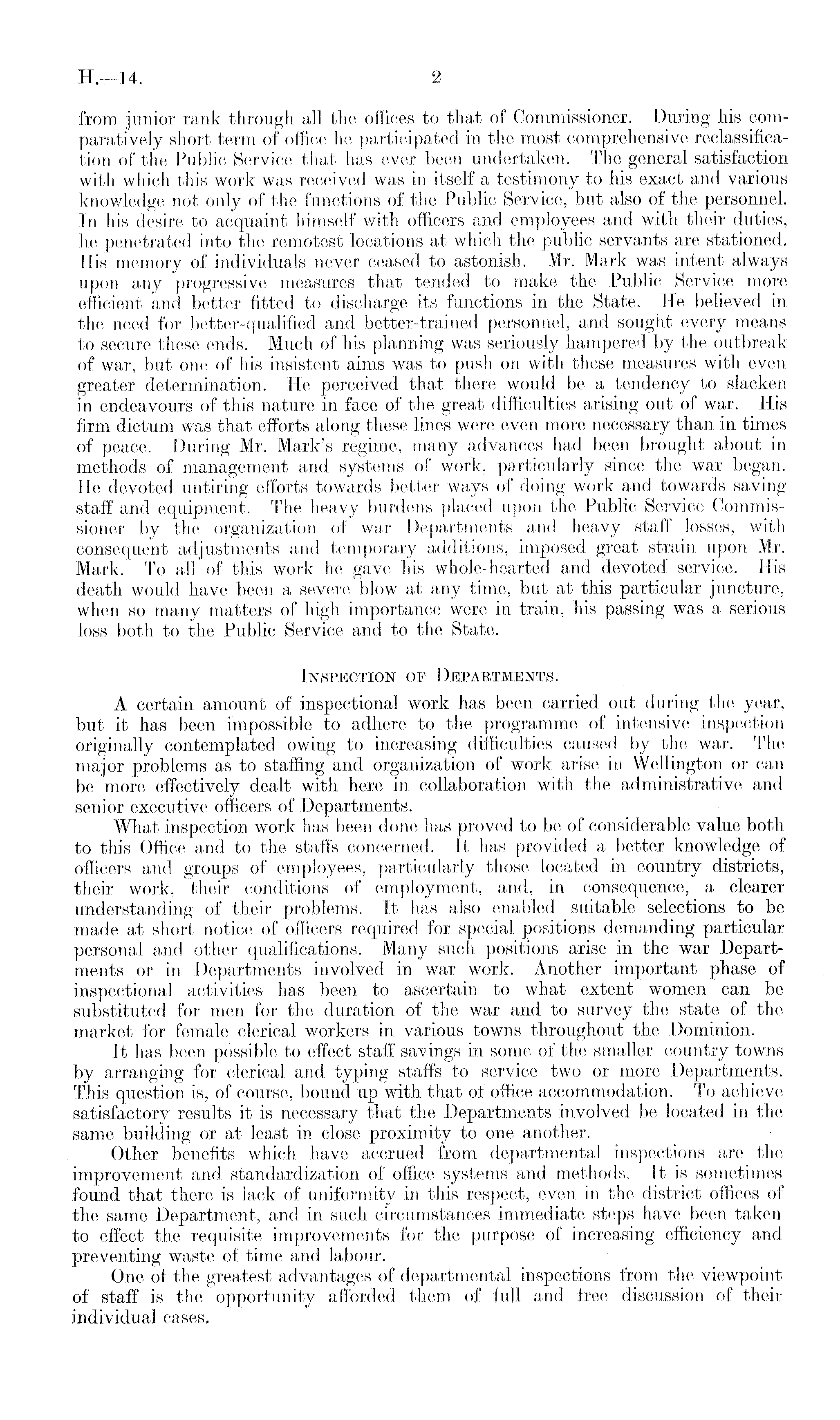 from junior rank through all the offices to that of Commissioner. During his comparatively short term of office he participated in the most comprehensive reclassification of the Public Service that has ever been undertaken. The general satisfaction with which this work was received was in itself a testimony to his exact and various knowledge not only of the functions of the Public Service, but also of the personnel. In his desire to acquaint himself with officers and employees and with their duties, he penetrated into the remotest locations at which the public servants are stationed. His memory of individuals never ceased to astonish. Mr. Mark was intent always upon any progressive measures that tended to make the Public Service more efficient and better fitted to discharge its functions in the State. He believed in the need for better-qualified and better-trained personnel, and sought every means to secure these ends. Much of his planning was seriously hampered by the outbreak of war, but one of his insistent aims was to push on with these measures with even greater determination. He perceived that there would be a tendency to slacken in endeavours of this nature in face of the great difficulties arising out of war. His firm dictum was that efforts along these lines were even more necessary than in times of peace. During Mr. Mark's regime, many advances had been brought about in methods of management and systems of work, particularly since the war began. He devoted untiring efforts towards better ways of doing work and towards savingstaff and equipment. The heavy burdens placed upon the Public Service Commissioner by the organization of war Departments and heavy staff losses, with consequent adjustments and. temporary additions, imposed great strain upon Mr. Mark. To all of this work he gave his whole-hearted and devoted' service. His death would have been a severe blow at any time, but at this particular juncture, when so many matters of high importance were in train, his passing was a serious loss both to the Public Service and to the State. Inspection of Departments. A certain amount of inspectional work has been carried out during the year, but it has been impossible to adhere to the programme of intensive inspection originally contemplated owing to increasing difficulties caused by the war. The major problems as to staffing and organization of work arise in Wellington or can be more effectively dealt with here in collaboration with the administrative and senior executive officers of Departments. What inspection work has been done has proved to be of considerable value both to this Office and to the staffs concerned. It has provided a better knowledge of officers and groups of employees, particularly those located in country districts, their work, their conditions of employment, and, in consequence, a clearer understanding of their problems. It has also enabled suitable selections to be made at short notice of officers required for special positions demanding particular personal and other qualifications. Many such positions arise in the war Departments or in Departments involved in war work. Another important phase of inspectional activities has been to ascertain to what extent women can be substituted for men for the duration of the war and to survey the state of the market for female clerical workers in various towns throughout the Dominion. It has been possible to effect staff savings in some of the smaller country towns by arranging for clerical and typing staffs to service two or more Departments. This question is, of course, bound up with that of office accommodation.. To achieve satisfactory results it is necessary that the Departments involved be located in the same building or at least in close proximity to one another. Other benefits which have accrued from departmental inspections are the improvement and standardization of office systems and methods. It is sometimes found that there is lack of uniformity in this respect, even in the district offices of the same Department, and in such circumstances immediate steps have been taken to effect the requisite improvements for the purpose of increasing efficiency and preventing waste of time and labour. One ot the greatest advantages of departmental inspections from the viewpoint of staff is the opportunity afforded them of full and free discussion of their individual cases.
