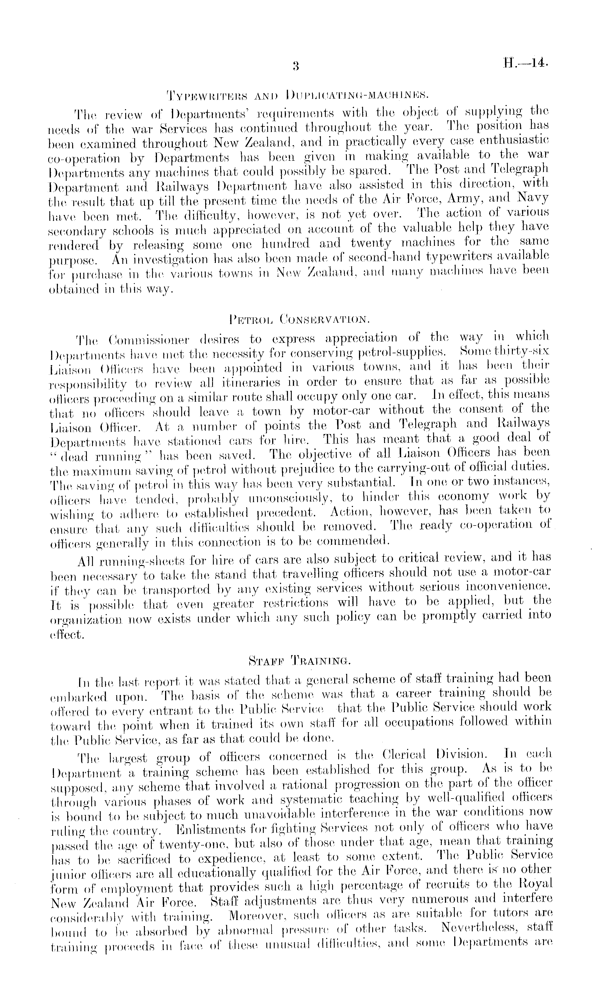 Typewriters and I )u.pli:oatxng-maohines. The review of Departments' requirements with the object of supplying the needs of the war Services has continued throughout the year. The position has been examined throughout New Zealand, and in practically every case enthusiastic co-operation by Departments has been given in making available to war Departments any machines tliat could possibly be spared. The Post and telegraph Department and Railways Department have also assisted in this direction, with the result that up till the present time the needs of the Air Force, Army, and Navy have been met. The difficulty, however, is not yet over. Ihe action of various secondary schools is much appreciated on account of the valuable help they have rendered by releasing some one hundred and twenty machines for the same purpose. An investigation has also been made of second-hand typewriters available for purchase in the various towns in New Zealand, and many machines have been obtained in this way. Petrol Conservation. The Commissioner desires to express appreciation, of the way in which Departments have met the necessity for conserving petrol-supplies. Some thirty-six Liaison Officers have been appointed in. various towns, and it has been their responsibility to review all itineraries in order to ensure that as far as possible officers proceeding on a similar route shall occupy only one car. In effect, this means that no officers should leave a town by motor-car without the consent of the Liaison Officer. At a number of points the Post and Telegraph and Railways Departments have stationed cars for hire. This has meant that a good deal of " dead running " has been saved. The objective of all Liaison Officers has been the maximum saving of petrol without prejudice to the carrying-out of official duties. The saving of petrol in this way has been very substantial. I n one or two instances, officers have tended, probably unconsciously, to hinder this economy work by wishing to adhere to established, precedent. Action, however, has been taken, to ensure that any such difficulties should be removed. The ready co-operation ol officers generally in this connection is to be commended. All running-sheets for hire of cars are also subject to critical review, and it has been necessary to take the stand that travelling officers should not use a motor-car if they can be transported by any existing services without serious inconvenience. It is possible that even greater restrictions will have to be applied, but the organization now exists under which any such policy can be promptly carried into effect. Staff Training. In the last report it was stated that a general scheme of staff training had been embarked upon. The basis of the scheme was that a careei training should be offered to every entrant to the Public Service -that the Public Service should work toward the point when it trained its own staff for all occupations followed within the Public Service, as far as that could be done. The largest group of officers concerned is the Clerical Division. In each Department a training scheme has been established for this group. As is to be supposed, any scheme that involved a rational progression on the part of the officer through various phases of work, and systematic teaching by well-qualified officers is bound to be subject to much unavoidable interference in the war conditions now ruling the country. Enlistments for fighting Services not only of officers who have passed the age of twenty-one, but also of those under that age, mean that training has to be sacrificed to expedience, at least to some extent. Ihe Public Service junior officers are all educationally qualified for the Air Force, and there is no other form of employment that provides such a high percentage of recruits to the Royal New Zealand Air Force. Staff adjustments are thus very numerous and interfere considerably with training. Moreover, such officers as are suitable for tutors are bound to be absorbed by abnormal pressure of other tasks. Nevertheless, staff training proceeds in face of these unusual difficulties, and some Departments are