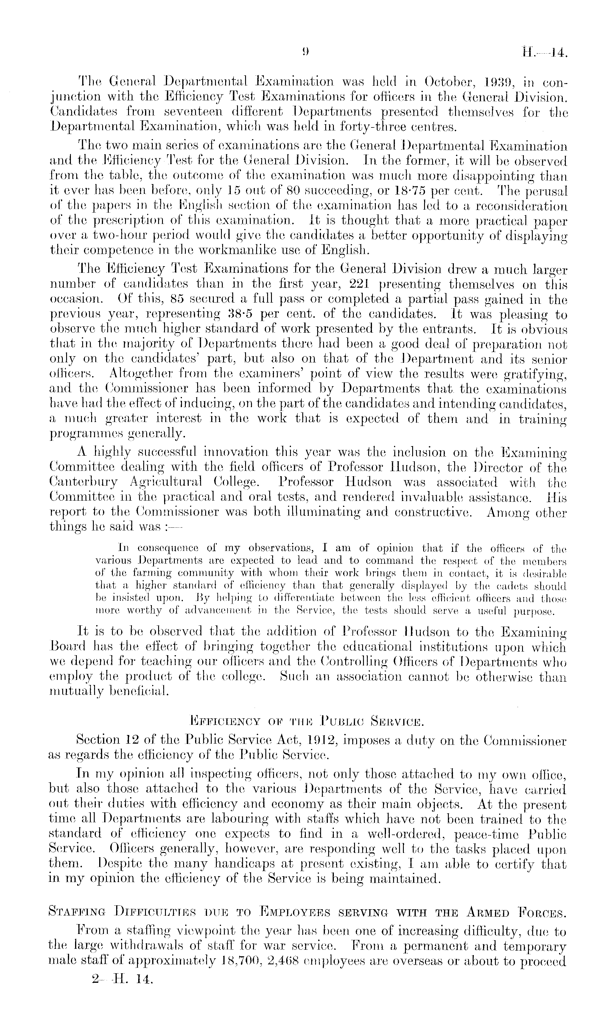 The General Departmental Examination was held in October, 1939, in conjunction with the Efficiency Test Examinations for officers in the General Division. Candidates from seventeen different Departments presented themselves for the Departmental Examination, which was held in forty-three centres. The two main series of examinations are the General Departmental Examination and the Efficiency Test for the General Division. In the former, it will be observed from the table, the outcome of the examination was much more disappointing than it ever has been before, only 15 out of 80 succeeding, or 18-75 per cent. The perusal of the papers in the English section of the examination has led to a reconsideration of the prescription of this examination. It is thought that a more practical paper over a two-hour period would give the candidates a better opportunity of displaying their competence in the workmanlike use of English. The Efficiency Test Examinations for the General Division drew a much larger number of candidates than in the first year, 221 presenting themselves on this occasion. Of this, 85 secured a full pass or completed a partial pass gained in the previous year, representing 38-5 per cent, of the candidates. It was pleasing to observe the much higher standard of work presented by the entrants. It is obvious that in the majority of Departments there had been a good deal of preparation not only on the candidates' part, but also on that of the Department and its senior officers. Altogether from the examiners' point of view the results were gratifying, and the Commissioner has been informed by Departments that, the examinations have had the effect of inducing, on the part of the candidates and intending candidates, a much greater interest in the work that is expected of them and in training programmes generally. A highly successful innovation this year was the inclusion on the Examining Committee dealing with the field officers of Professor Hudson, the Director of the Canterbury Agricultural College. Professor Hudson was associated with the Committee in the practical and oral tests, and rendered invaluable assistance. His report to the Commissioner was both illuminating and constructive. Among other things he said was : — In consequence of my observations, I am of opinion that if the officers of the various Departments are expected to lead and to command the respect of the members of the farming community with whom their work brings them in contact, it is desirable that a higher standard of efficiency than that generally displayed by the cadets should be insisted upon. By helping to differentiate between the less efficient officers and those more worthy of advancement in the Service, the tests should serve a useful purpose. It is to be observed that the addition of Professor Hudson to the Examining .Board has the effect of bringing together the educational institutions upon which we depend for teaching our officers and the Controlling Officers of Departments who employ the product of the college. Sucli an association cannot be otherwise than mutually beneficial. Efficiency of the Public Service. Section 12 of the Public Service Act, 1912, imposes a duty on the Commissioner as regards the efficiency of the Public Service. In my opinion all inspecting officers, not only those attached to my own office, but also those attached to the various Departments of the Service, have carried out their duties with efficiency and economy as their main objects. At the present time all Departments are labouring with staffs which have not been trained to the standard of efficiency one expects to find in a well-ordered, peace-time Public Service. Officers generally, however, are responding well to the tasks placed upon them. Despite the many handicaps at present existing, lam able to certify that in my opinion the efficiency of the Service is being maintained. Staffing Difficulties due to Employees serving with the Armed Forces. Erom a staffing viewpoint the year has been one of increasing difficulty, due to the large withdrawals of staff for war service. From a permanent and temporary male staff of approximately 18,700, 2,468 employees are overseas or about to proceed
