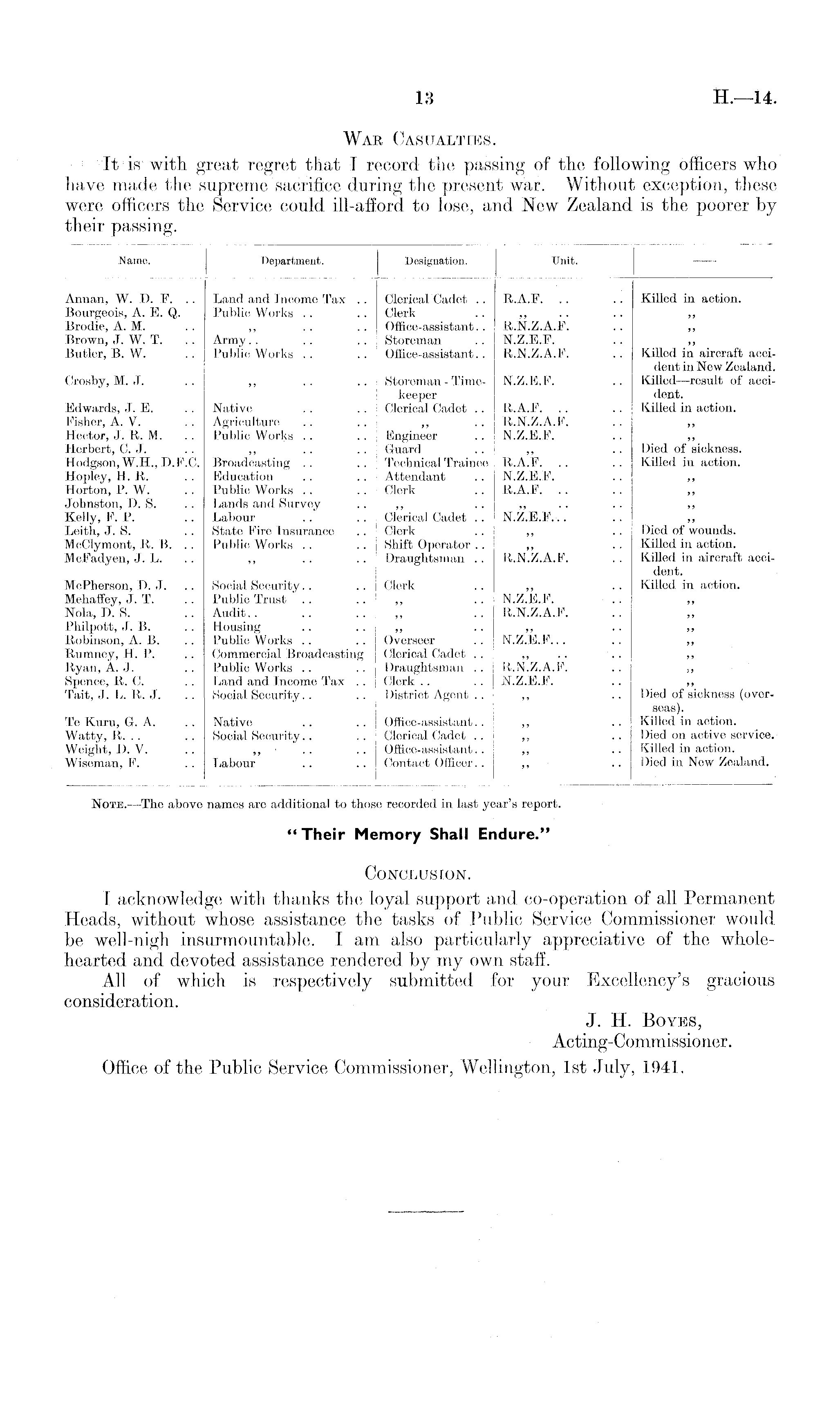 "Their Memory Shall Endure." Conclusion. I acknowledge with, thanks the loyal support and co-operation of all Permanent Heads, without whose assistance the tasks of Public Service Commissioner would be well-nigh insurmountable. I am also particularly appreciative of the wholehearted and devoted assistance rendered by my own staff. All of which is respectively submitted for your Excellency's gracious consideration. J. H. Boyes, Acting-Commissioner. Office of the Public Service Commissioner, Wellington, Ist July, 1941.